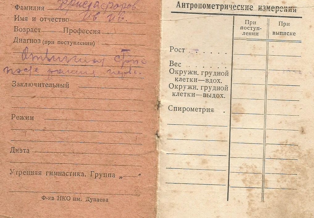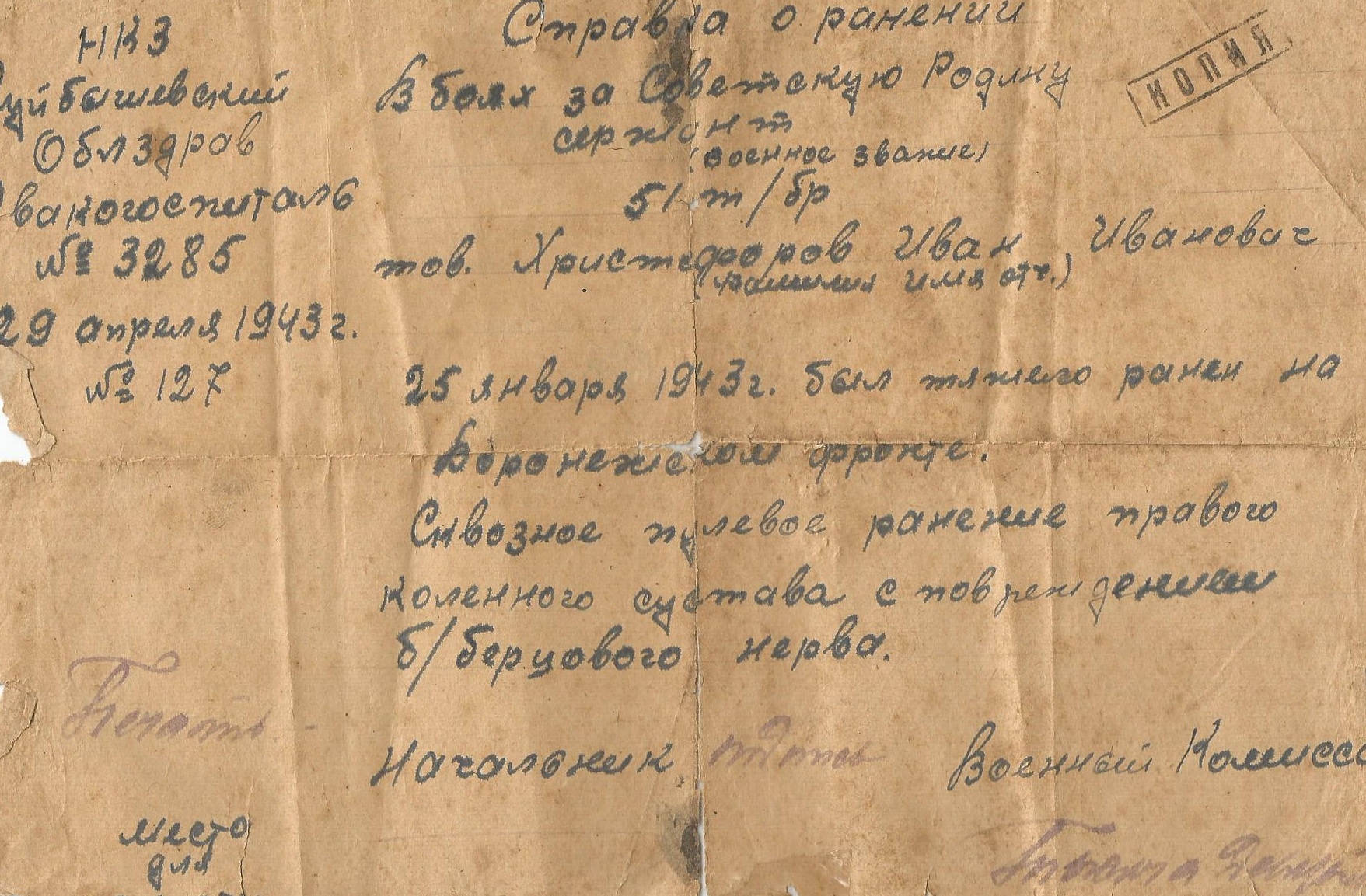 25.01.43 года Иван Иванович получил тяжелое боевое ранение, о чем свидетельствует «Справка о ранении в боях за Советскую Родину». После длительного лечения в госпитале было выдано «Свидетельство о болезни №36», по которому Христофоров И.И. был комиссован в тыл с присвоением инвалидности. В связи с ранением с 9.04.43г. по 24.04.43г. находился на санаторно-курортном лечении. Ему были назначены: массаж, лечебная физкультура, грязевые ванны и др. О чем свидетельствует курортная книжка.