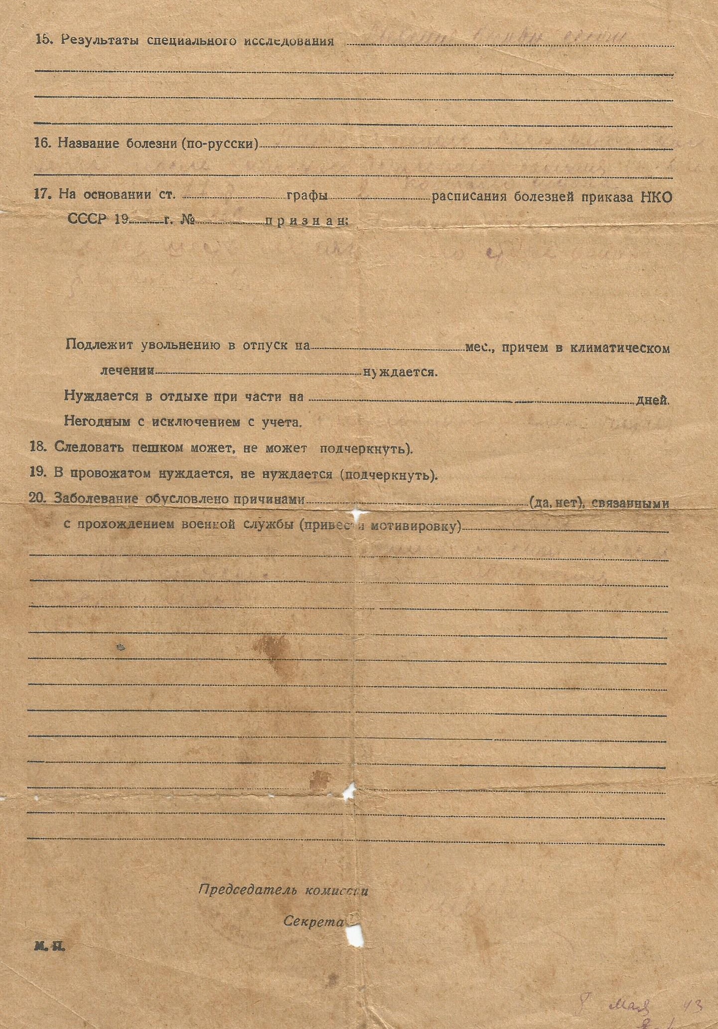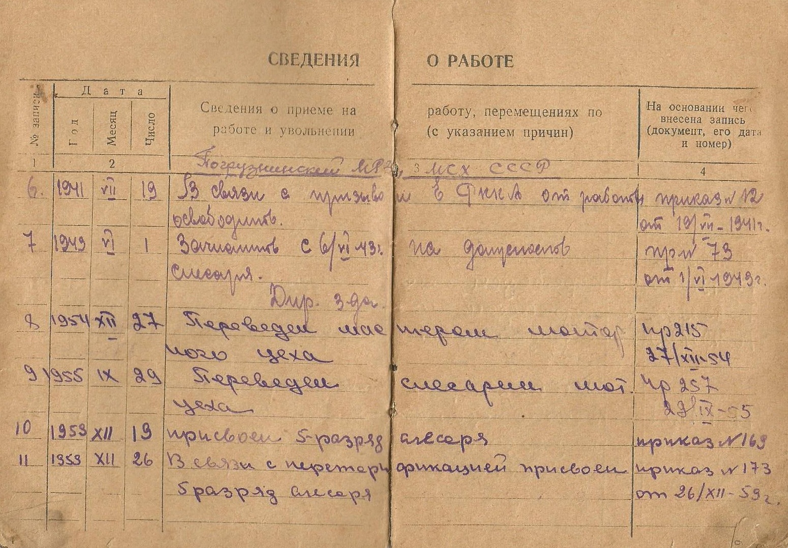 Несмотря на инвалидность, вскоре после выписки из санатория вышел на работу. Запись в трудовой книжке от 01.06.1943 года гласит: «Зачислить с 6.06.43 г. на должность слесаря» (согласно приказу №12 от 19.07.43г). Предыдущая запись от 19.07.1941г: «В связи с призывом в РККА от работы освободить». Его дочь, Валентина, с 1975 года проживает в с. Исаклы.