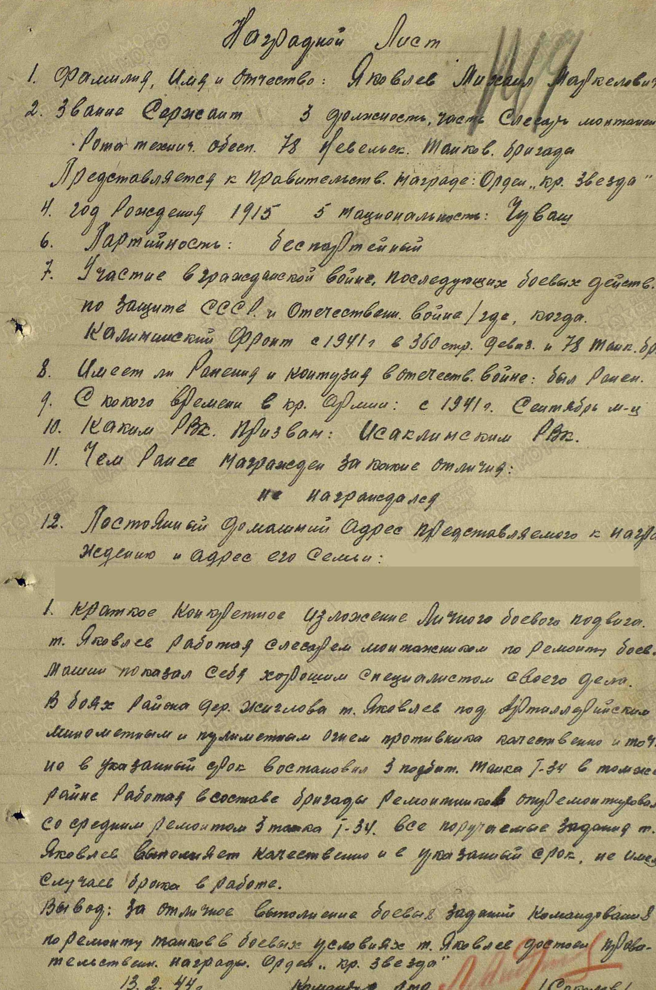 Родился в 1915 году в д. Ганькин Матак Исаклинского района. Участник Великой Отечественной войны с 1941 года. Звание сержант, слесарь монтажной роты технического обеспечения 78 Невельской Краснознаменной Танковой бригады.