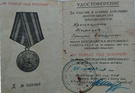 С 9 августа 1945 г. Григорий Дмитриевич участвовал в боевых действиях против японских империалистов в составе 426 отделения пулеметной батареи Морской пехоты, сапером. Для Григория война закончилась лишь в мае 1948 г. на основании Постановления Совета Министров СССР. В феврале 1976 г. присвоено звание «Ударник Коммунистического Труда».