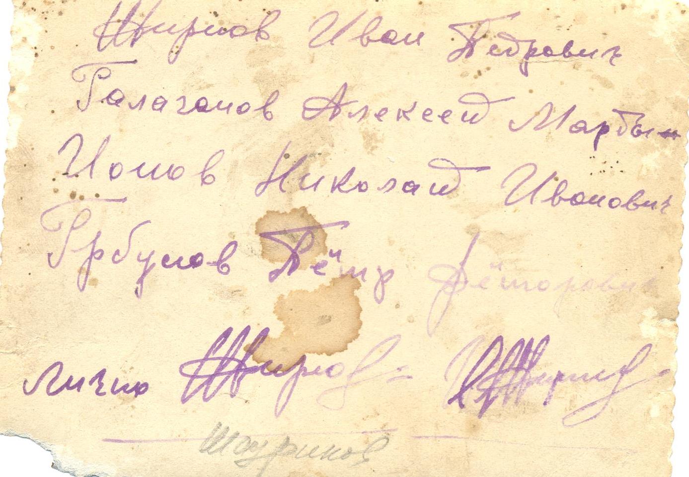 На обороте сохранившейся фронтовой фотографии написаны имена боевых друзей: Жирнов Иван Петрович, Галаганов Алексей Мартынович, Ионов Николай Иванович, Горбунов Петр Федорович. Награды: орден Красной Звезды, медаль «За победу над Германией в Великой Отечественной войне 1941-1945 гг.», орден Отечественной войны I степени (1985 г.), юбилейные медали.