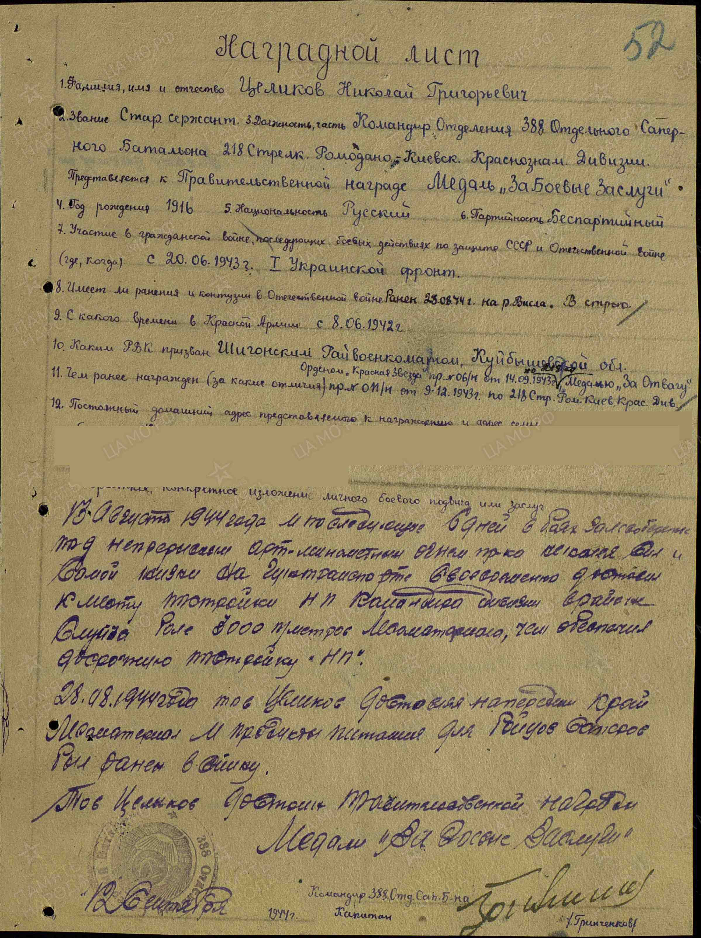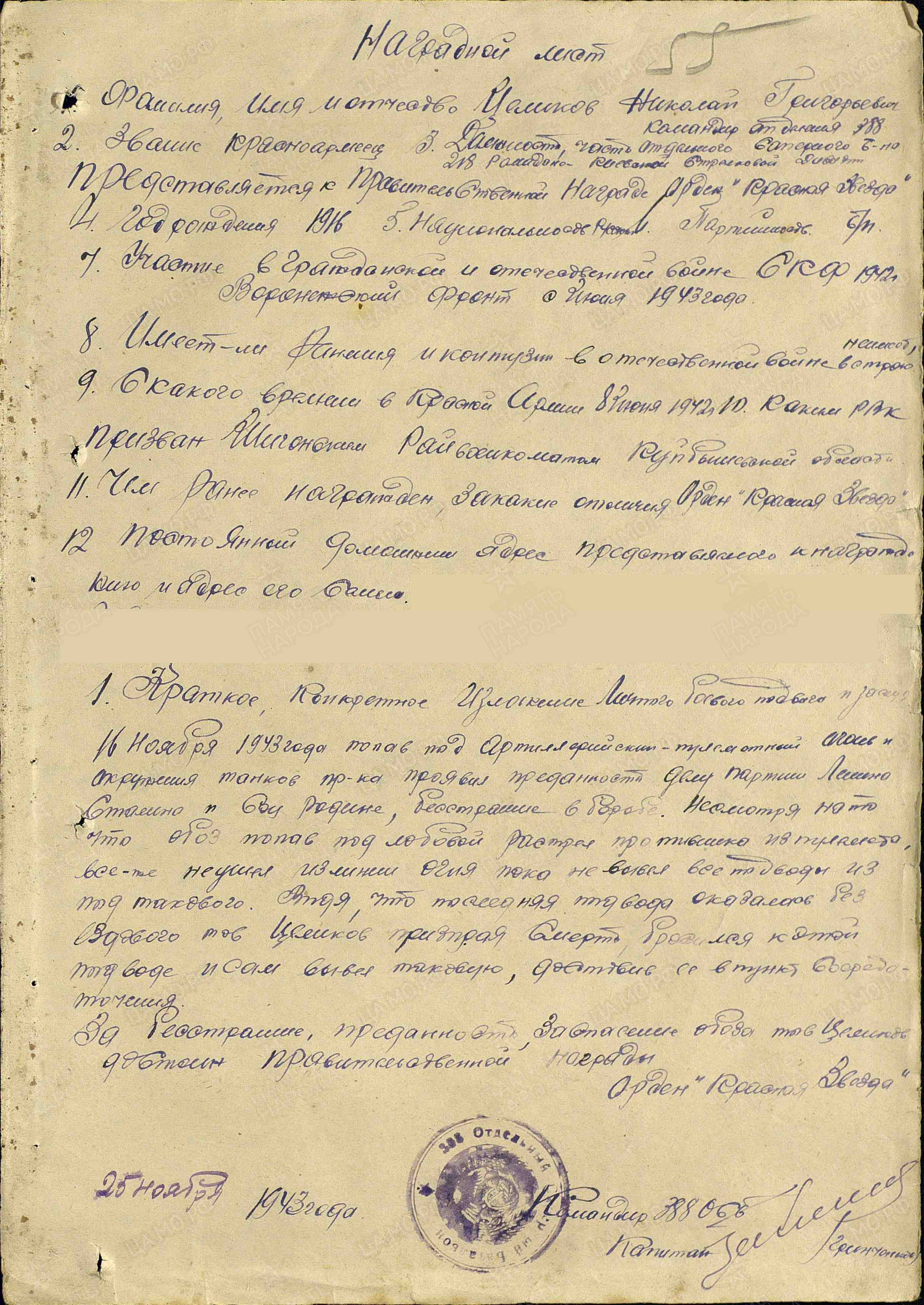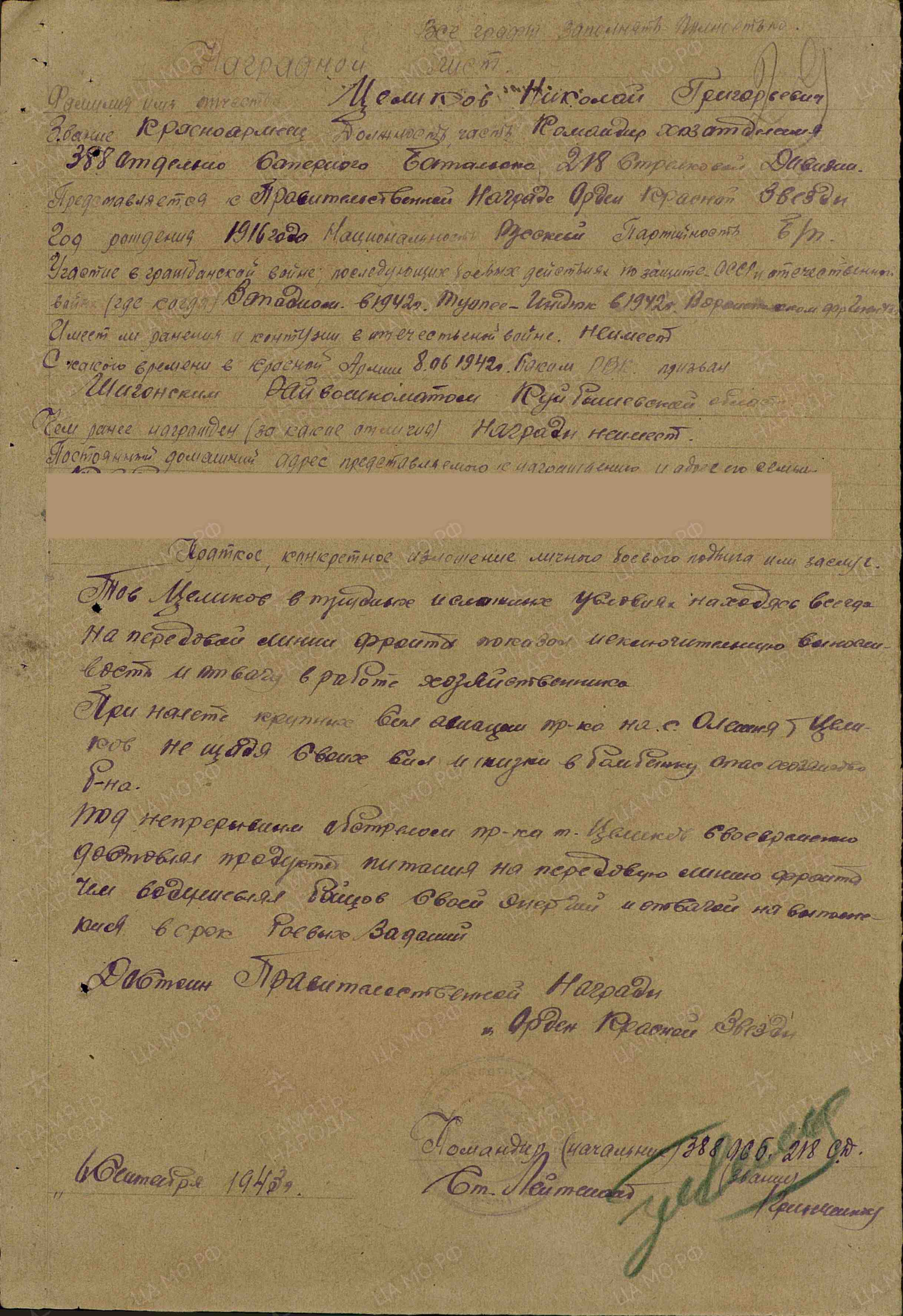 Родился 3 августа 1916 года в селе Кузькино Шигонского района Куйбышевской области. Призван на фронт Шигонским РВК в июне 1942 года. С октября 1942 по июнь 1943 года служил в 165 стрелковой дивизии в звании старшина саперной роты. При налете крупных сил авиации противника спасал хозяйство батальона, своевременно доставлял продукты питания на передовую линию фронта. 13-19 августа 1944 года под непрерывным арт-минометным огнем противника ценой своей жизни на гужевом транспорте своевременно доставил к месту постройки НП командира дивизии более 3000 к/метром пиломатериала, чем обеспечил досрочную постройку НП. С июня 1943 по май 1946 года служил в 218 стрелковой дивизии в должности старшина шоферов. Уволен в запас в мае 1946 года. Участвовал в боях за освобождение Чехословакии, Польши, Германии. Дошел до Берлина. Николай Григорьевич Целиков умер в 1990 г. (точная дата смерти не установлена).