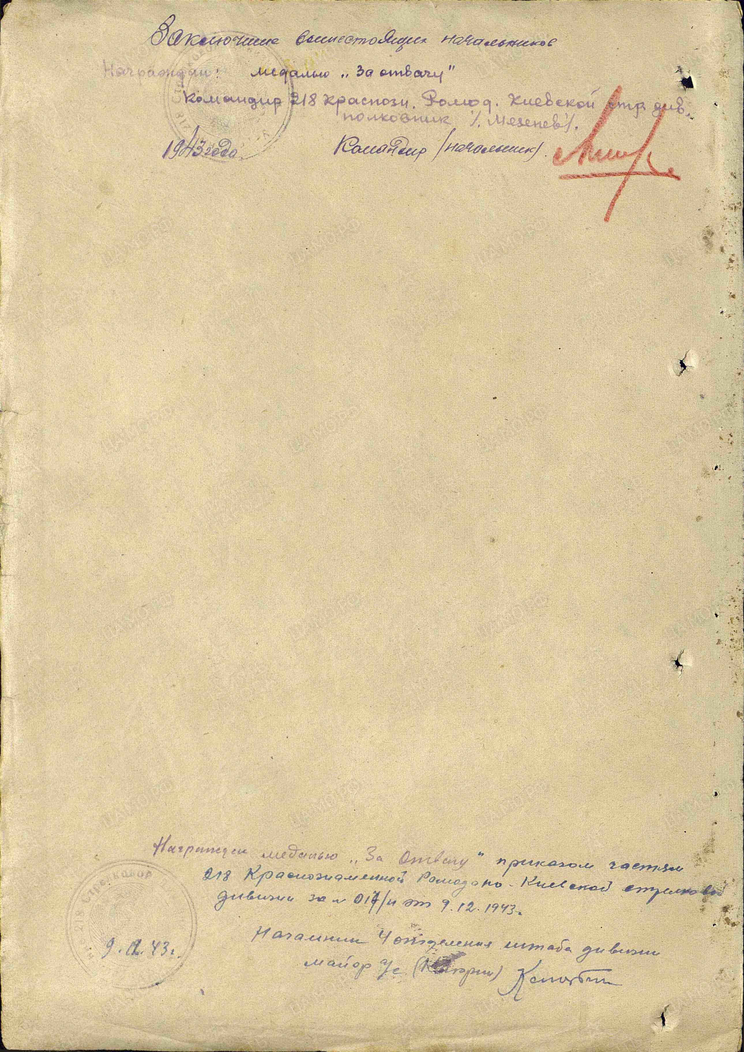 Награды: орден Красной Звезды (1943 г.), медали « За отвагу» (1943 г.), «За боевые заслуги» (1944 г.), «За победу над Германией в Великой Отечественной войне» (1945 г.).