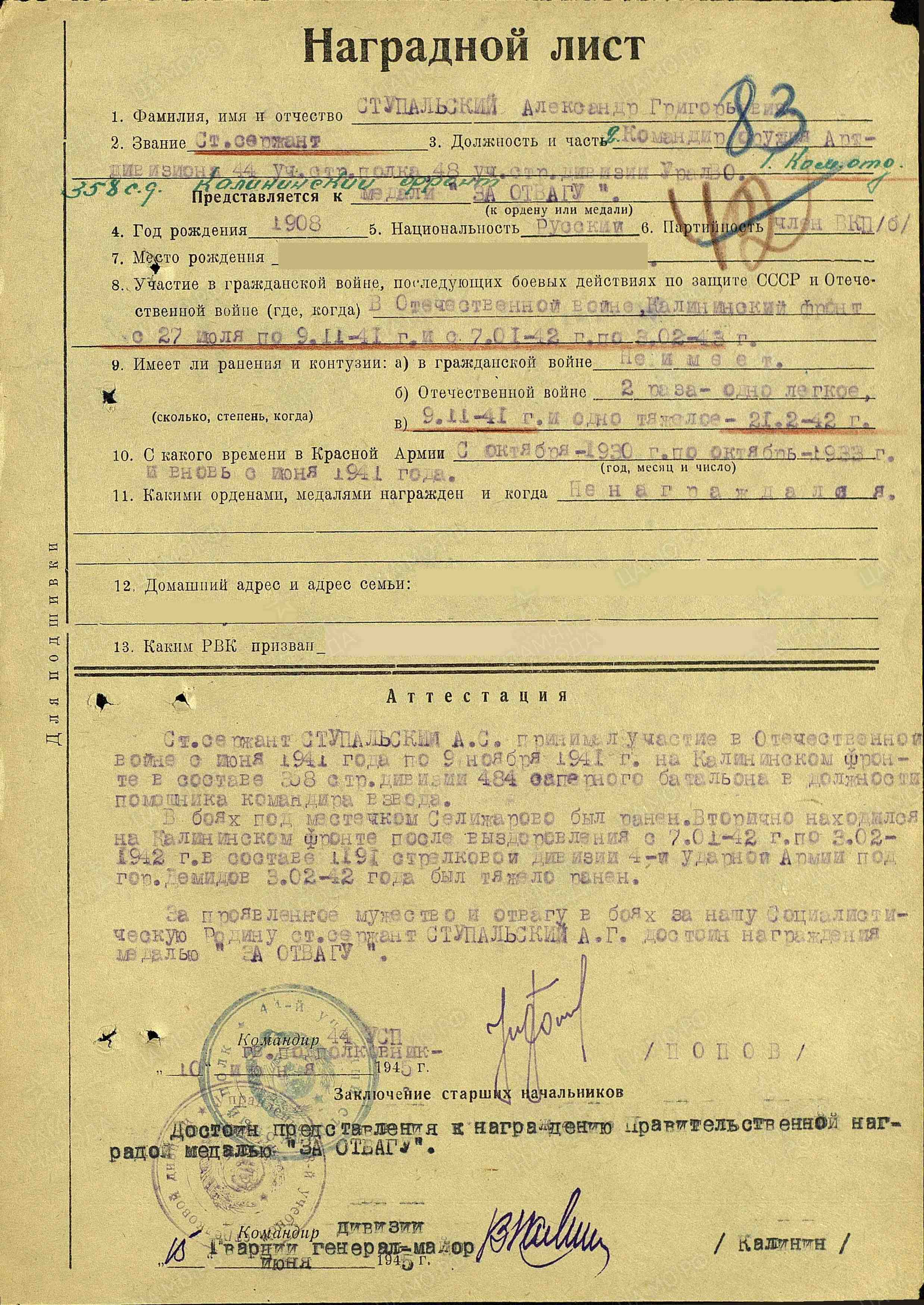 Вот что еще нам стало известно о нашем земляке: «Ст. сержант Ступальский А.С. принимал участие в Отечественной войне с июня 1941 г. по 9 ноября 1941 – на Калининском фронте в составе 368 стр. дивизии 484 саперного батальона в должности помощника командира взвода. В боях под местечком Селижарово (Тверская область) был ранен. Вторично находился на Калининском фронте после ранения с 7 января 1942 по 3 февраля 1942 г. – в составе 1191 стр. дивизии 4-й Ударной Армии под городом Демидов (Смоленская обл.). 3 февраля 1942 был тяжело ранен. Награжден медалью «За отвагу» (в наградном листе ошибочно указано отчество – Григорьевич). Демобилизован на основании Указа Президиума Верховного Совета СССР от 25 сентября 1945 года. Проживал в п. Аверьяновский Большечерниговского района Самарской области.