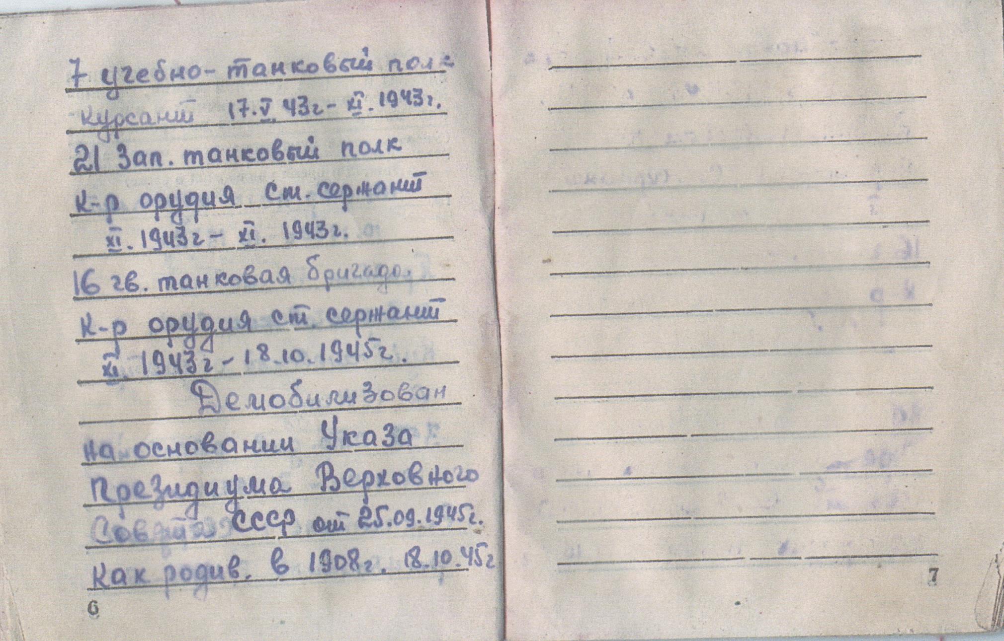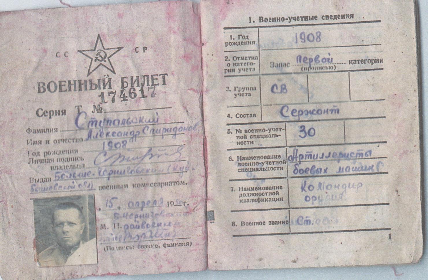 Наш земляк, Александр Ступальский, родился в 1908 году. Сержант, артиллерист боевых машин, командир орудия. Призван Куйбышевским РВК г. Куйбышева в октябре 1930 г. на службу в РВК, и был зачислен в 101 стр. полк (г. Сызрань). Во время Великой Отечественной войны был призван по мобилизации Большечерниговским РВК Куйбышевской обл. в июле 1941 года. Служил в 358 стр. дивизии – рядовой (с июля 1931 по февраль 1943 гг.). Был ранен, после ранения был госпитализирован в город Свердловск (с февраля 1943 по 17 мая 1943 г.). Воевал в 7 учебно-танковом полку с мая 1943 по ноябрь 1943 гг., также в 21 зап. Танковом полку к-р орудия, где было присвоено звание ст. сержант. Затем, воевал в 16 гв. Танковой бригаде к-р. орудия (с ноября 1943 по 18 октября 1945 г.).