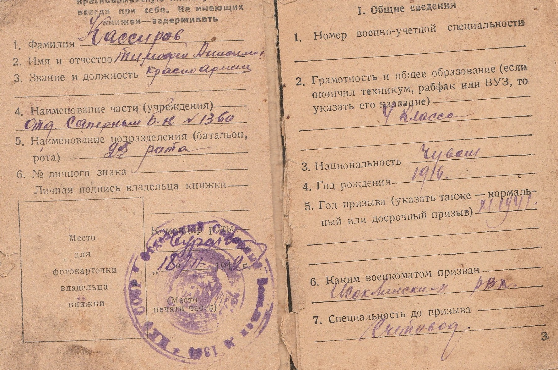 Тимофей Анисимович родился 19 декабря 1916 году. Был призван на фронт в сентябре 1941 г., рядовой. Очень любил читать. В роте он носил всегда стопку книг. По его рассказам, они его однажды и спасли: стал завязывать порвавшуюся бечевку и отстал от сослуживцев, а в это время начался обстрел. Ребята погибли, а он остался жив.