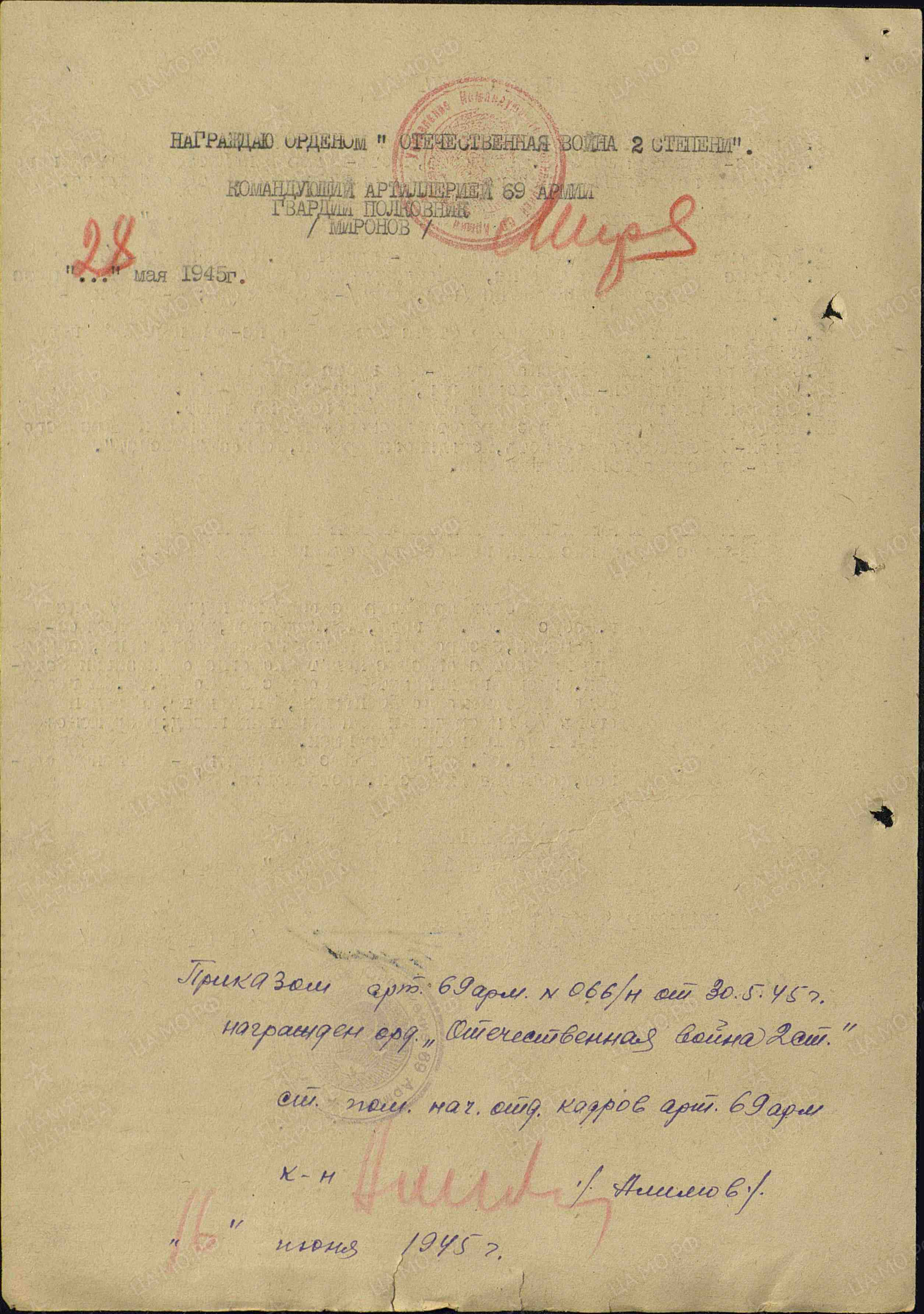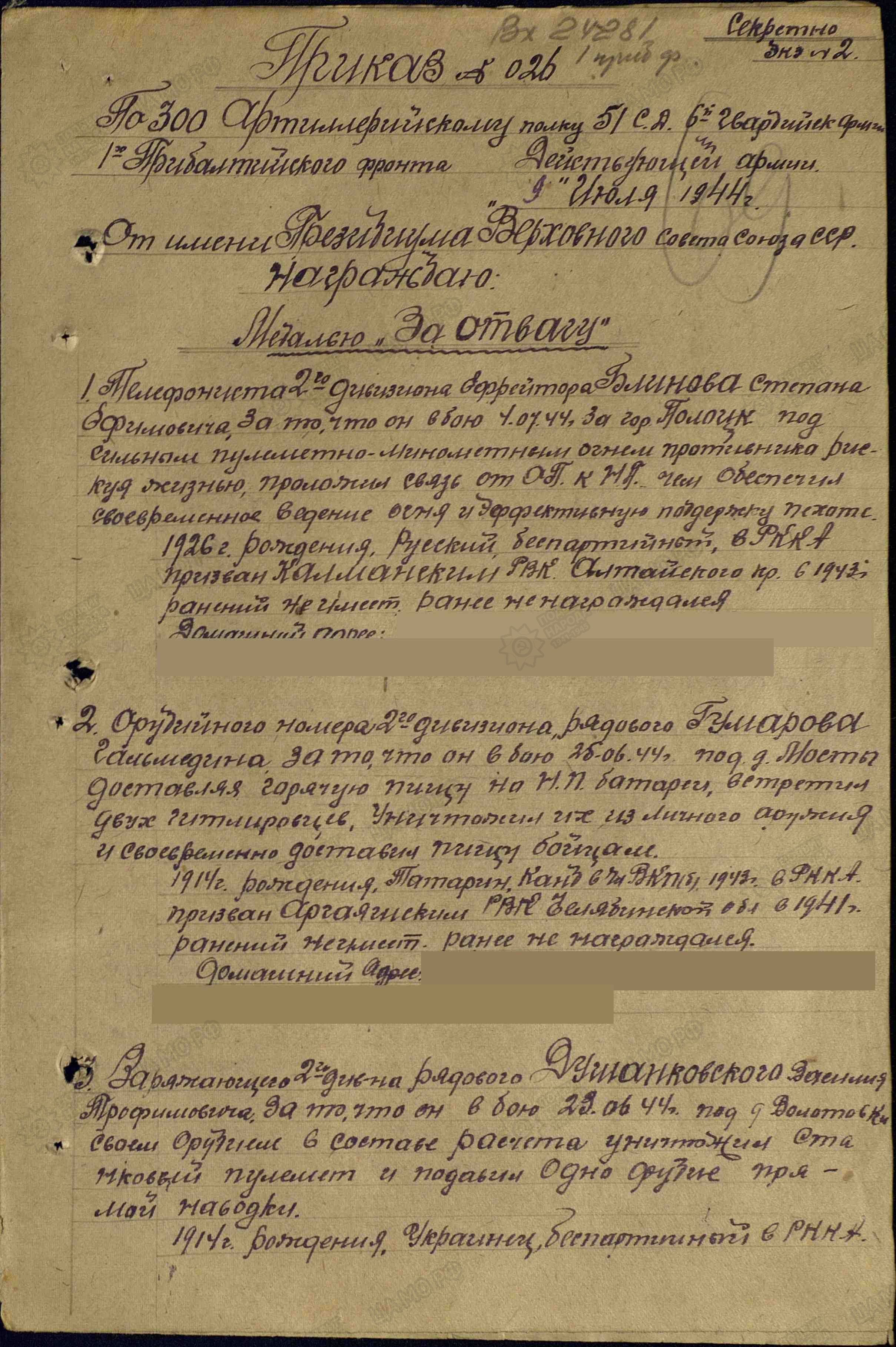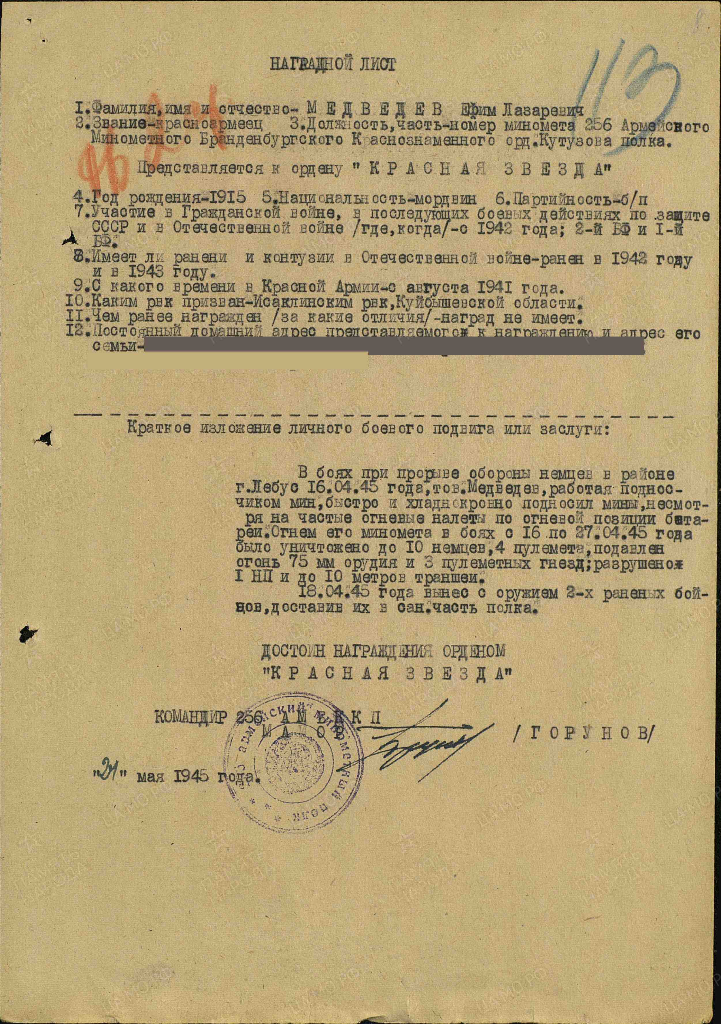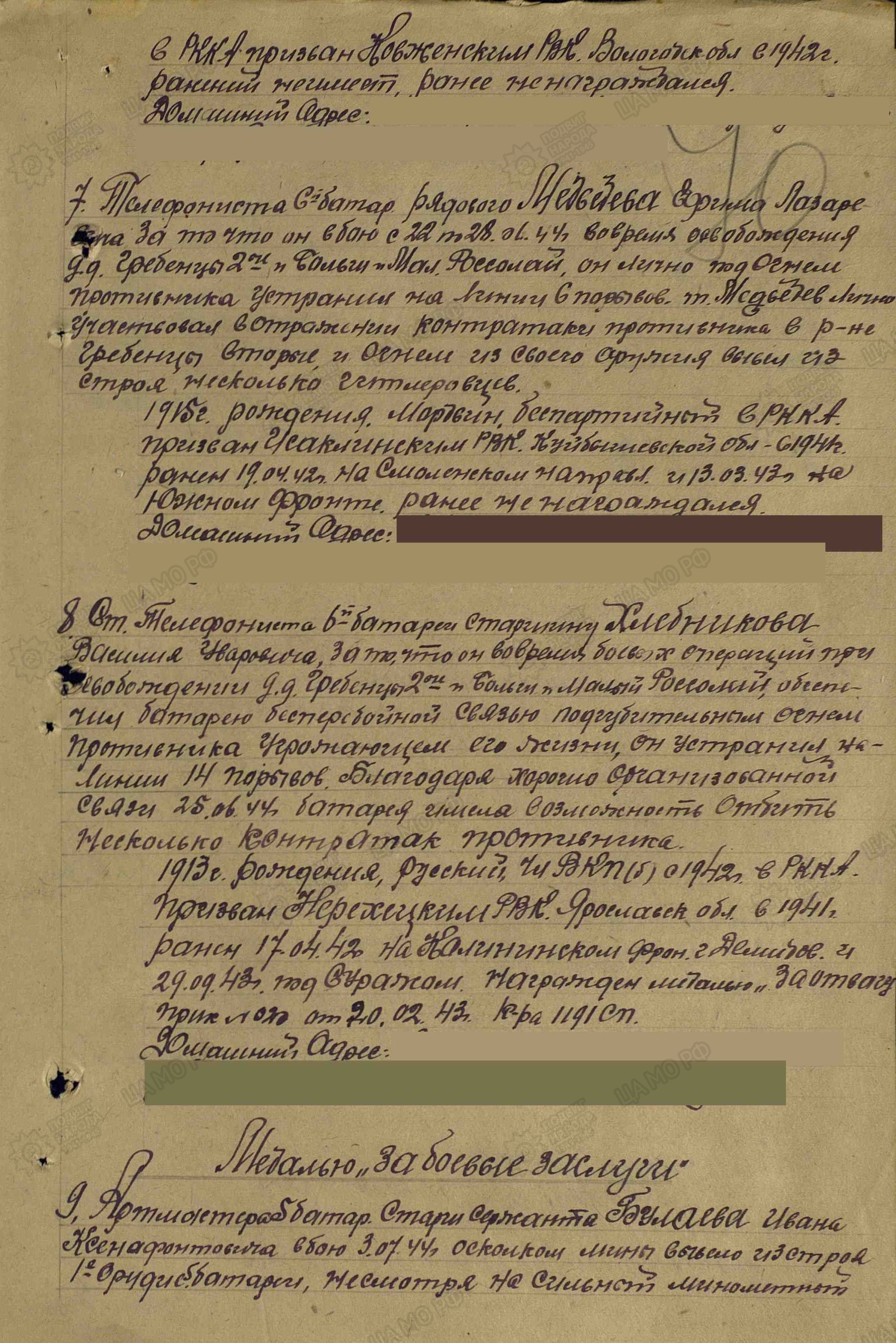 Во время одного из боёв возле него разорвался снаряд. 24 осколка попали в отца… Уже после войны, когда извлекали последний, 24 осколок, оперирующий хирург удивлённо воскликнул: «Ну, дед, какой же ты рисованный!». Отец часто рассказывал, как ходил в разведку. Однажды, получив задание, пробирались разведчики по узкой разминированной лыжне через минное поле. Сойти с неё было нельзя, иначе и сам погибнёшь, и товарищей погубишь. Взяли тогда они какого-то важного высокопоставленного «языка» прямо из блиндажа. За это задание и получил отец свой орден.