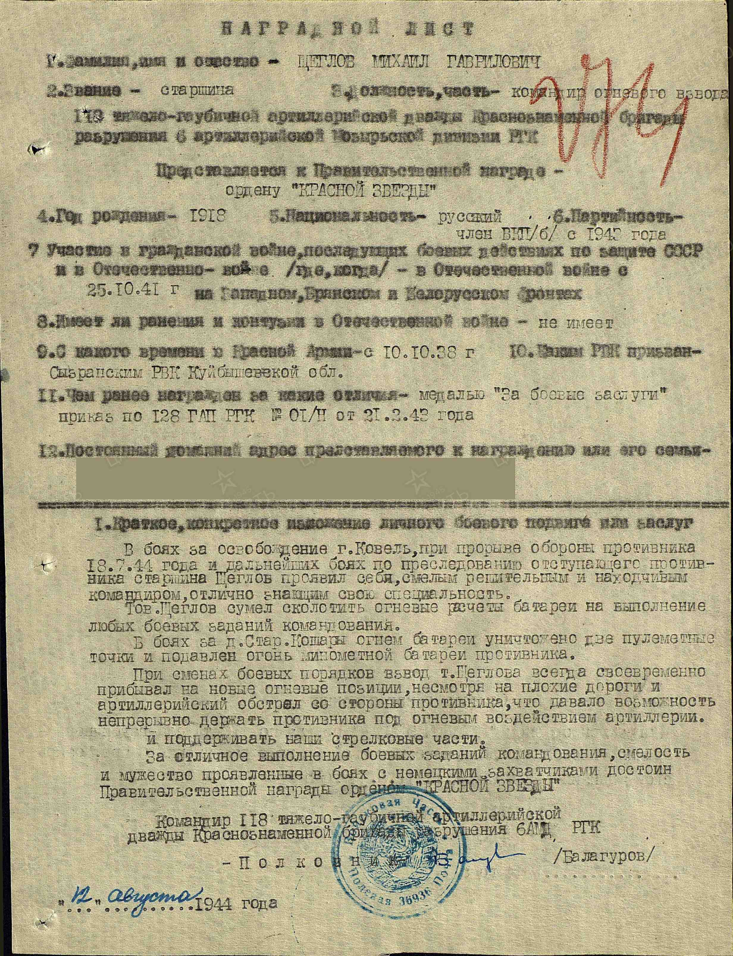 Михаил Щеглов родился в 1917 году (по другой информации в 1917 г.) в селе Старая Рачейка Сызранского района Куйбышевской области. Старшина. Артиллерист. В 1938 был призван на службу в РККА, служил в артиллерийских войсках, в Чите. Закончился срок службы, но началась война, и командир огневого взвода, старшина Щеглов был отправлен на фронт. Воевал артиллеристом с 25.10.1941 г. по 9.05.1945 г. на Западном, Брянском, на 1-м и 2-м Белорусском фронтах. День Победы встретил в Берлине.