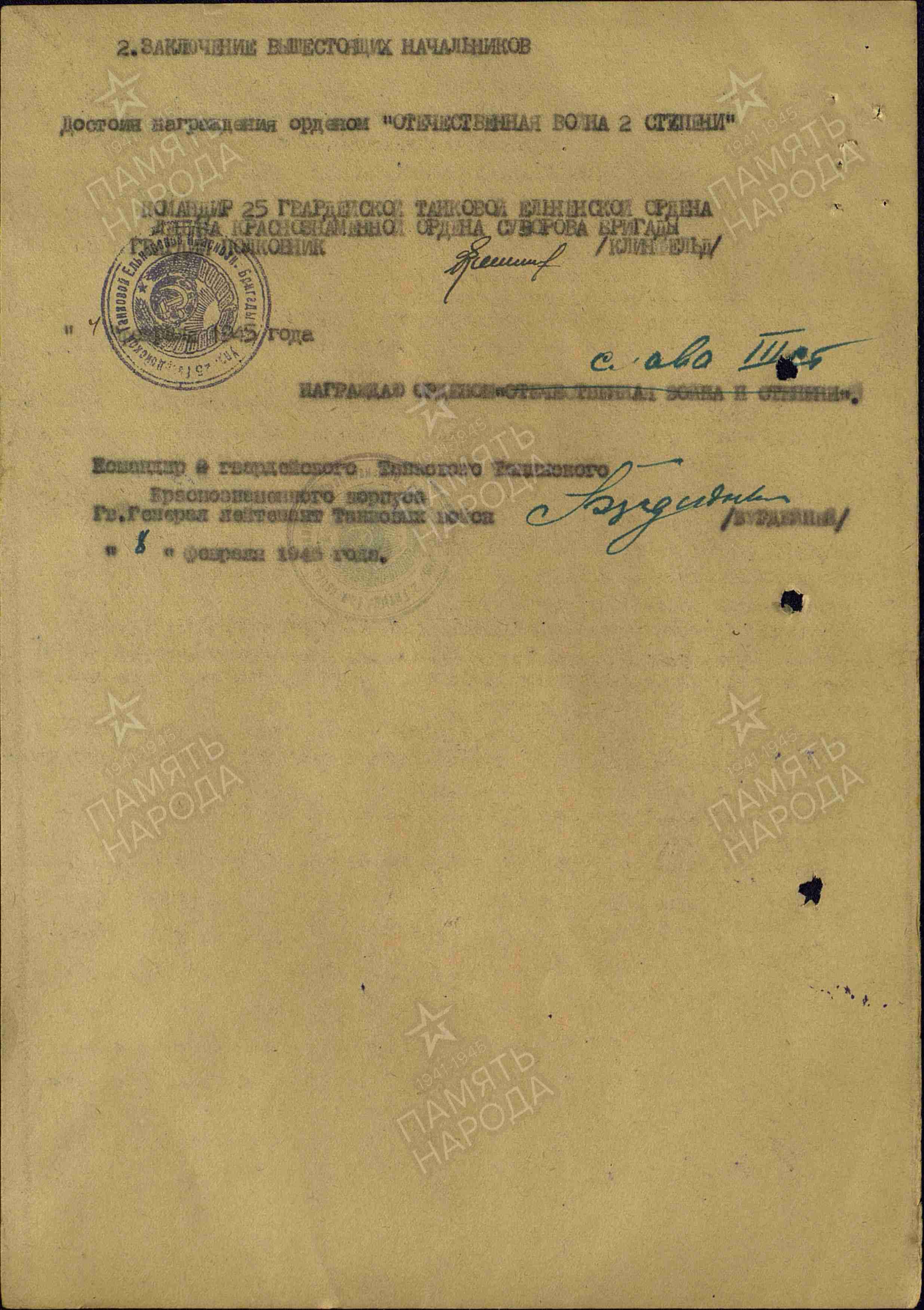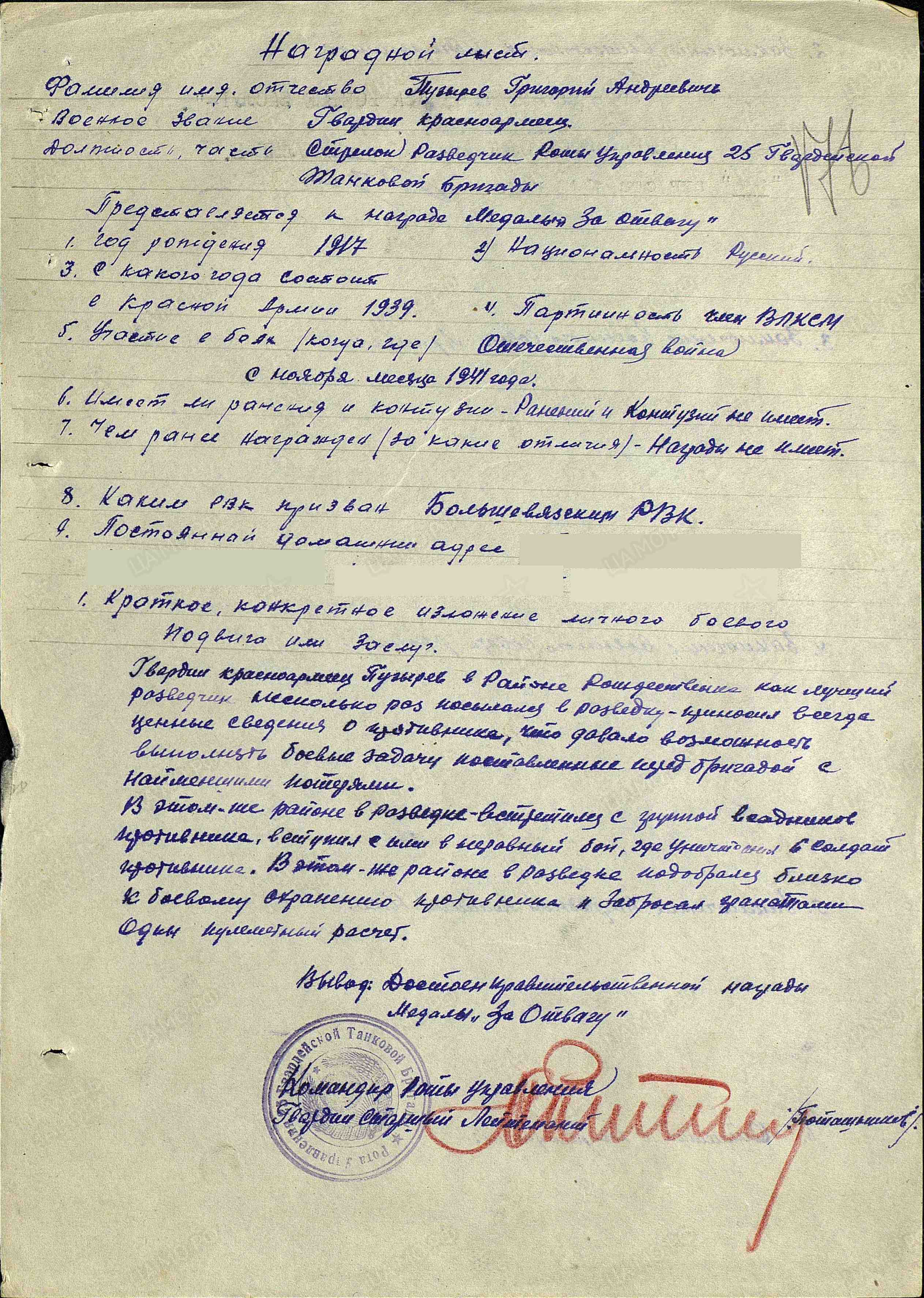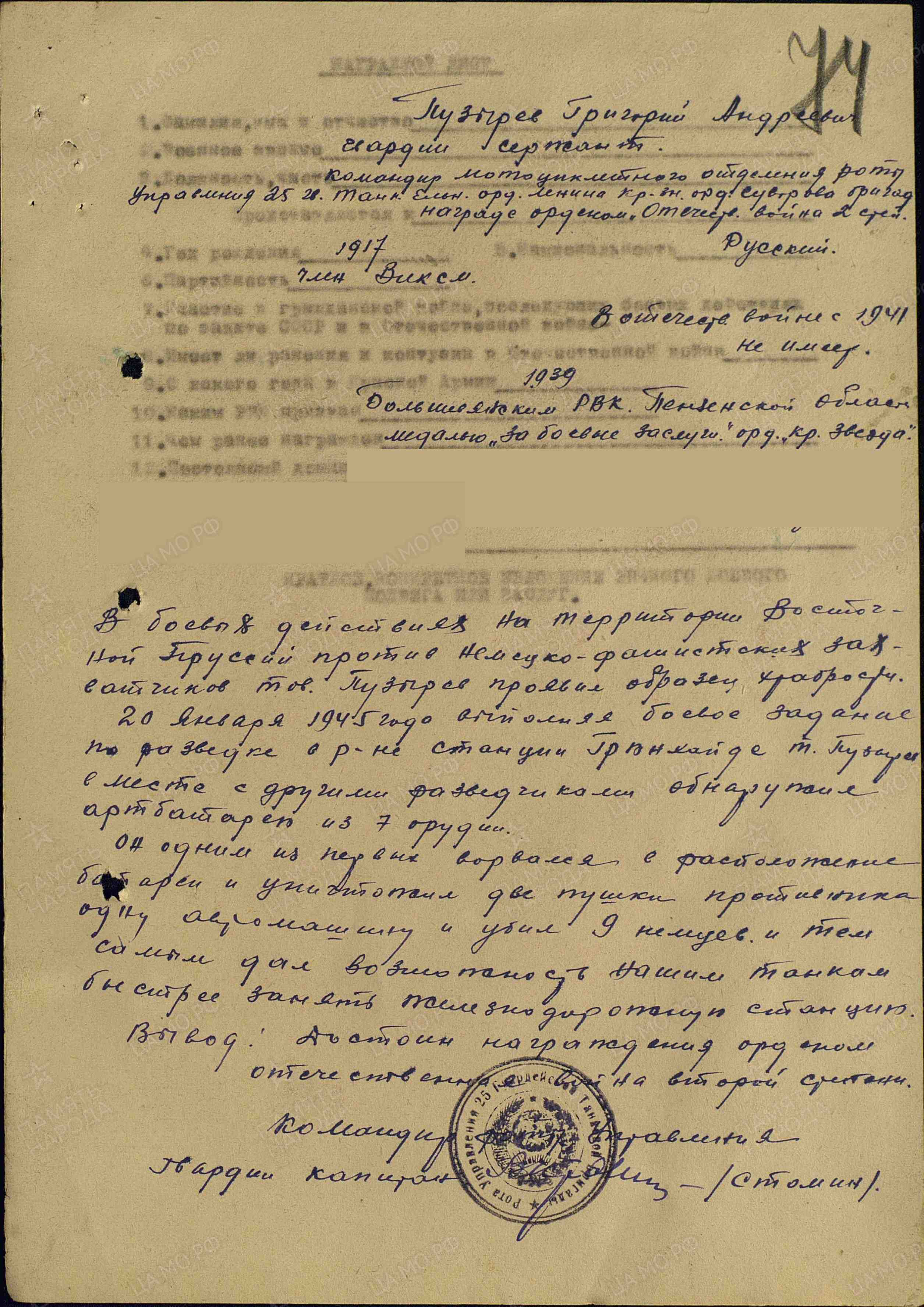 1944 г. «На протяжении боевой операции по освобождению Белоруссии с 23 июня по 3 июля тов. Пузырев доставлял командованию точные данные о противнике. В районе Староселье он, благодаря смелого и решительного действия, уничтожил лично 10 гитлеровцев, два солдата и одного офицера взял в плен. В районе Ольшинец, выполняя задание по разведке, установив движение большой колонны авто-транспорта, быстро донес об этом командованию. В результате этого ударом танков было разбито до 80 автомашин. Вывод: достоин правительственной награды ордена «Красная Звезда».