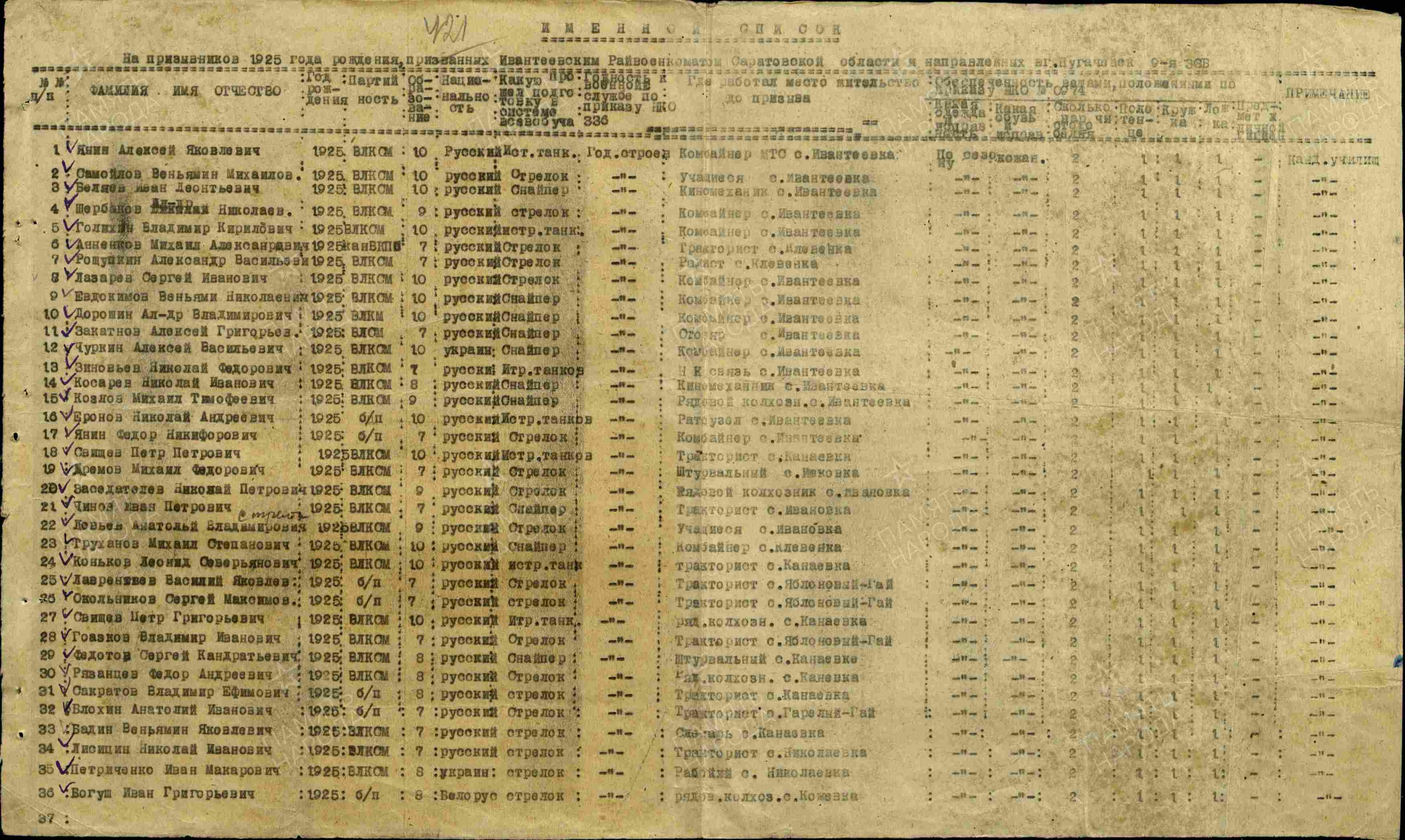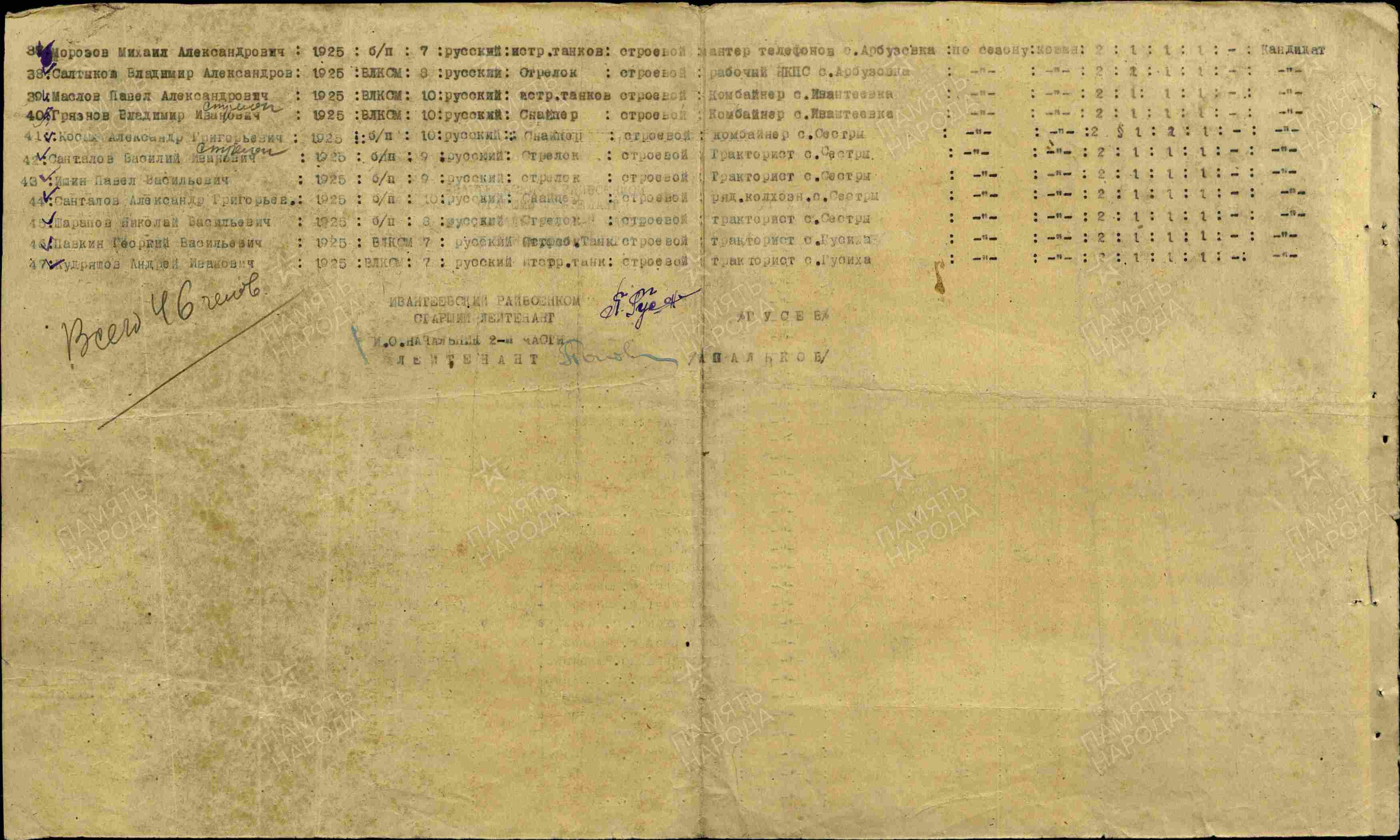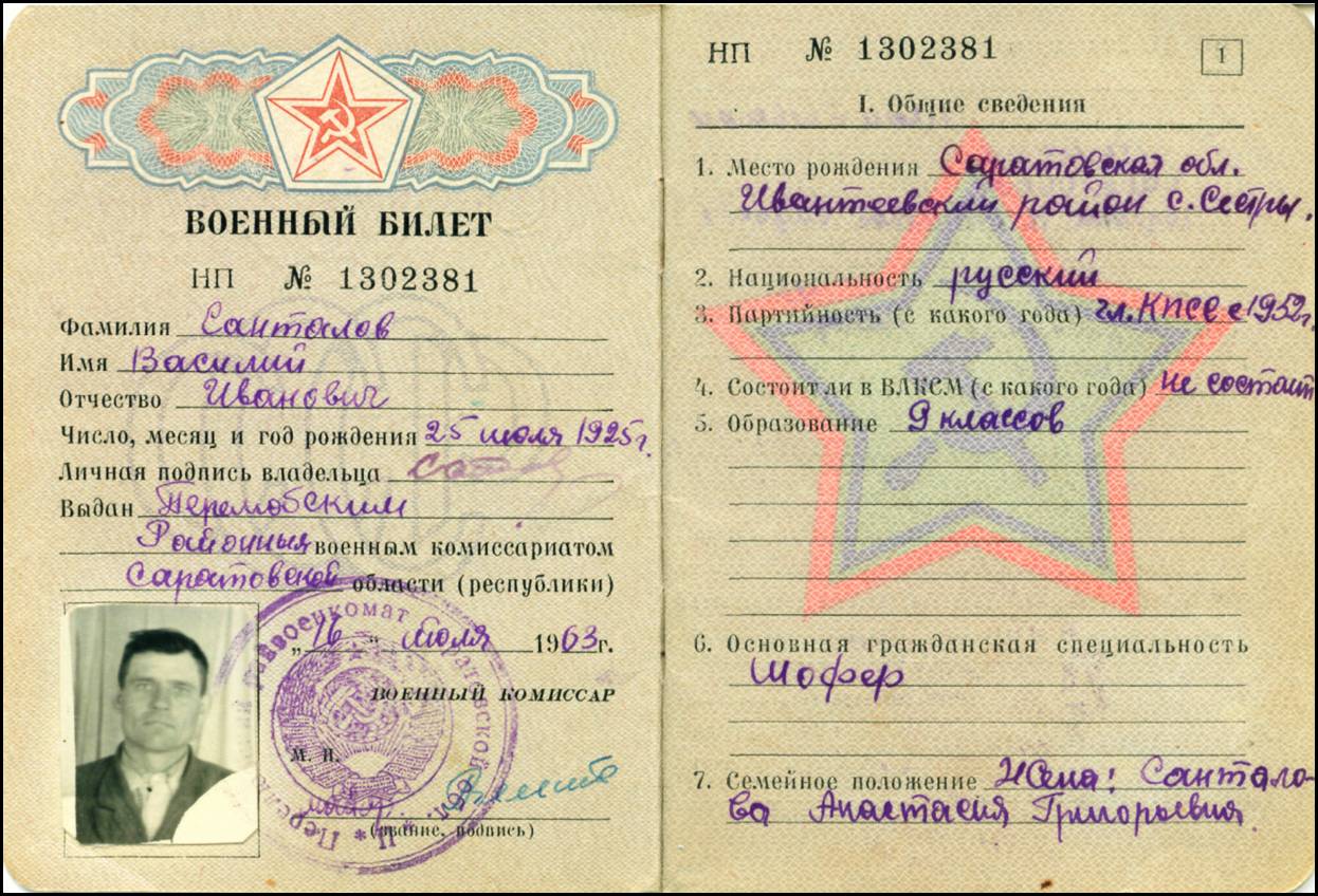 Василий Санталов родился 25.07.1925 г. в селе Сестры Ивантеевского района Саратовской области. Место призыва на фронт: Ивантеевский РВК, Саратовская область. Воевал в 222 стрелковом батальоне Щорсовской почетной дивизии 1-го Украинского фронта. Был тяжело ранен в ногу в бою под г. Борвенково в ходе Харьковской наступательной операции (Изюм-Барвенковское направление).