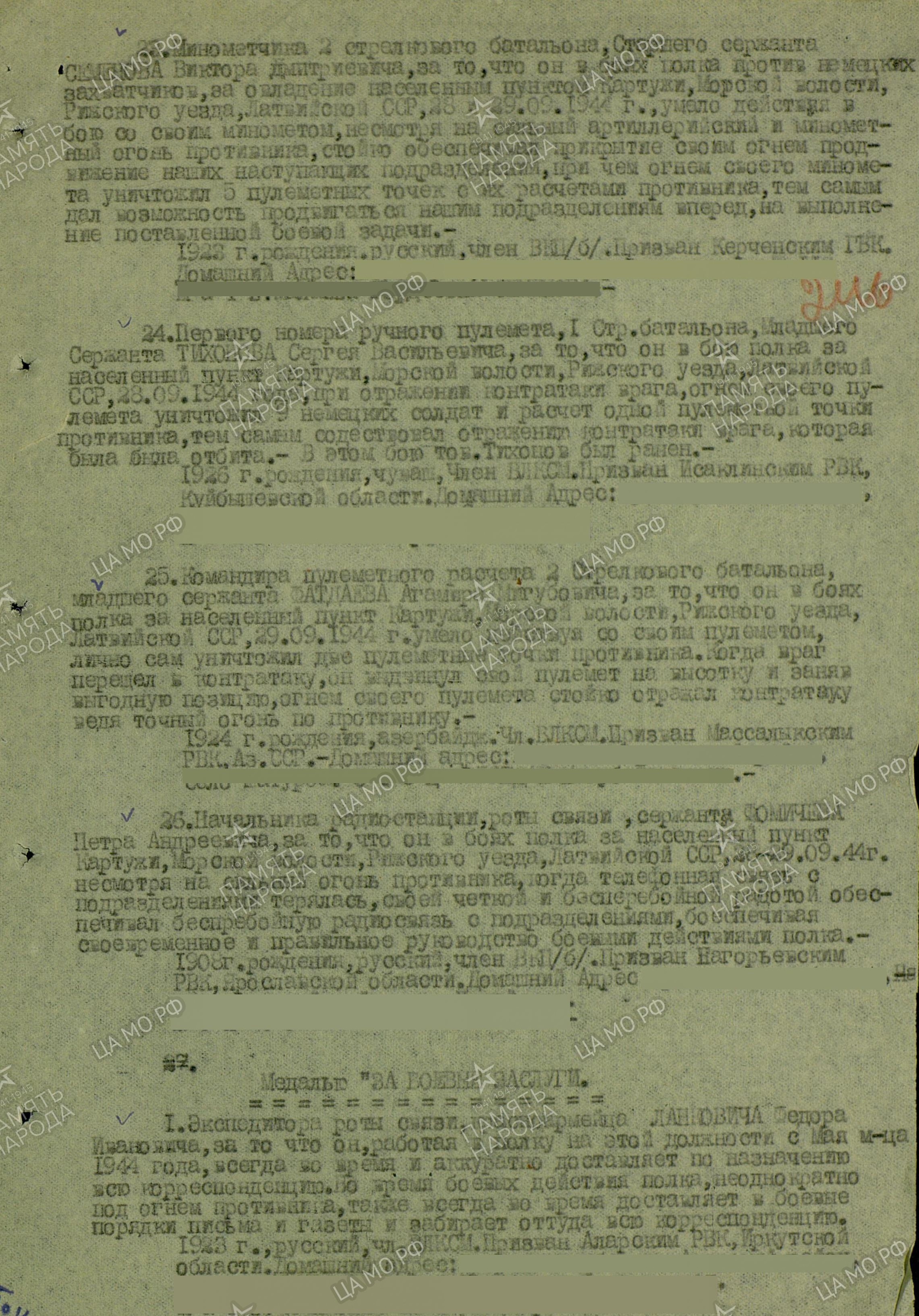 Информация из Приказа о награждении от 15.10.1944 г.: «Первого номера ручного пулемета, 1 стр. батальона, мл. сержанта Тихонова Сергея Васильевича, за то, что он в бою полка за населенный пункт Картужи, Морской волости, Рижского уезда, Латвийской ССР, 28.09.1944 г., при отражении контратаки противника, огнем своего пулемета уничтожил 9 немецких солдат и расчет одной пулеметной точки противника, тем самым содействовал отражению контратаки врага, которая была отбита. В этом бою тов. Тихонов был ранен».
