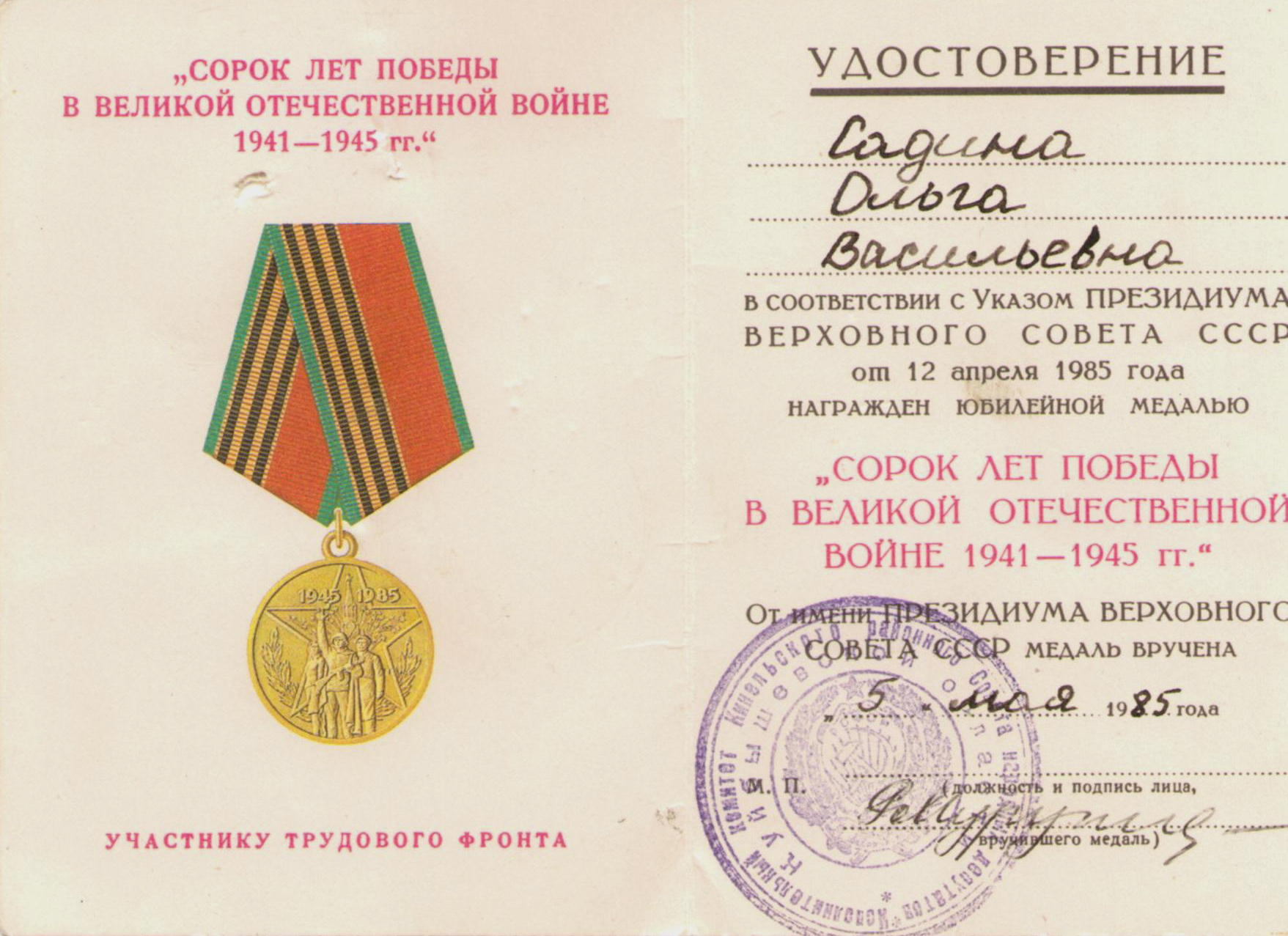 Родилась 22 июня 1914 года в с. Бобровка Самарской области. Ольга Васильевна была труженицей тыла, но документы (удостоверение) не сохранились. В годы войны работала дояркой в колхозе им. Ворошилова. Был ручной труд, приходилось доить около 30 коров несколько раз в день. Ее трудовой стаж 43 года. Награждена многими Почётными Грамотами, Благодарностями за свой нелёгкий труд. Ольга Васильевна была передовой дояркой, за свою отличную работу побывала в Москве на ВДНХ.
