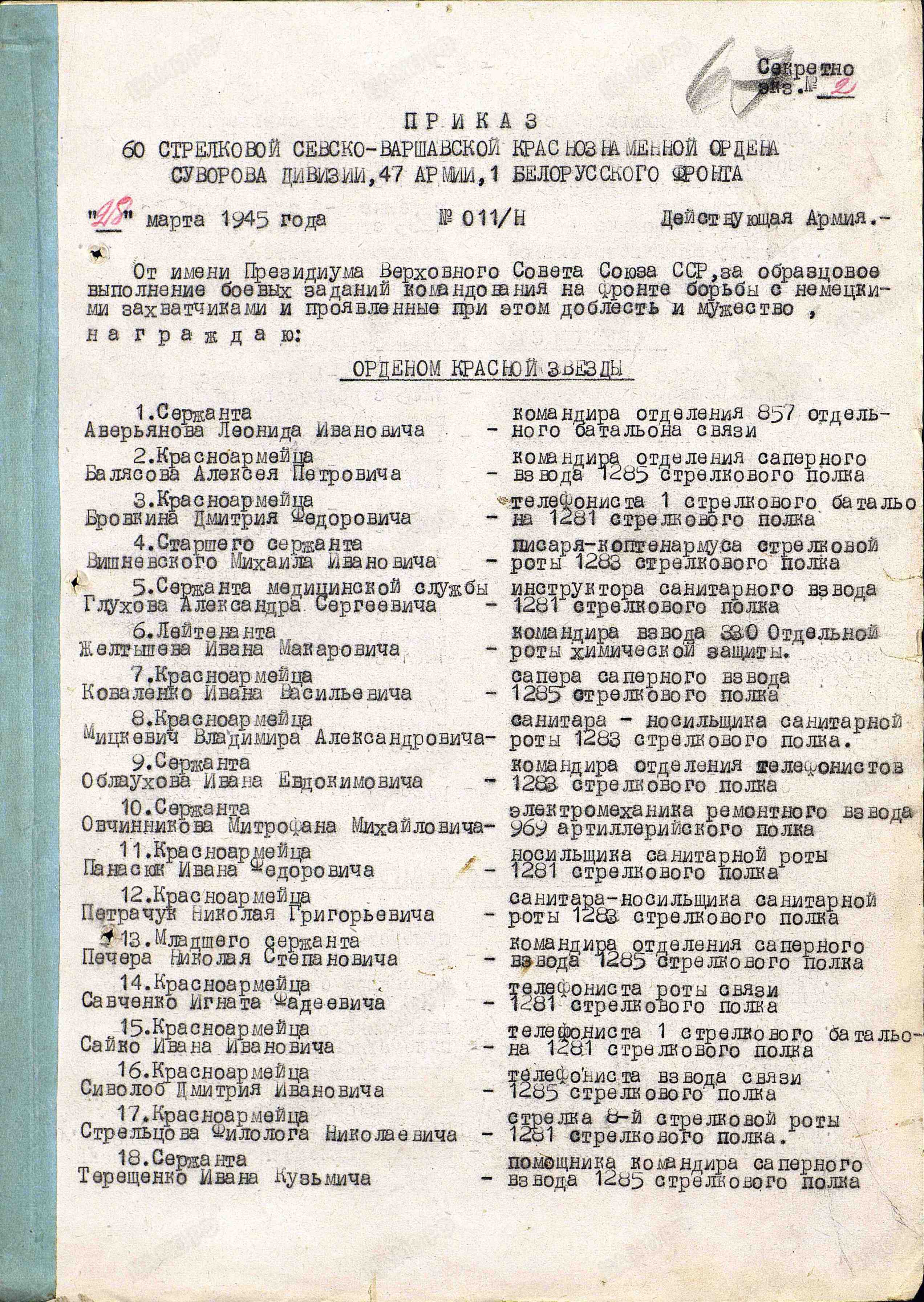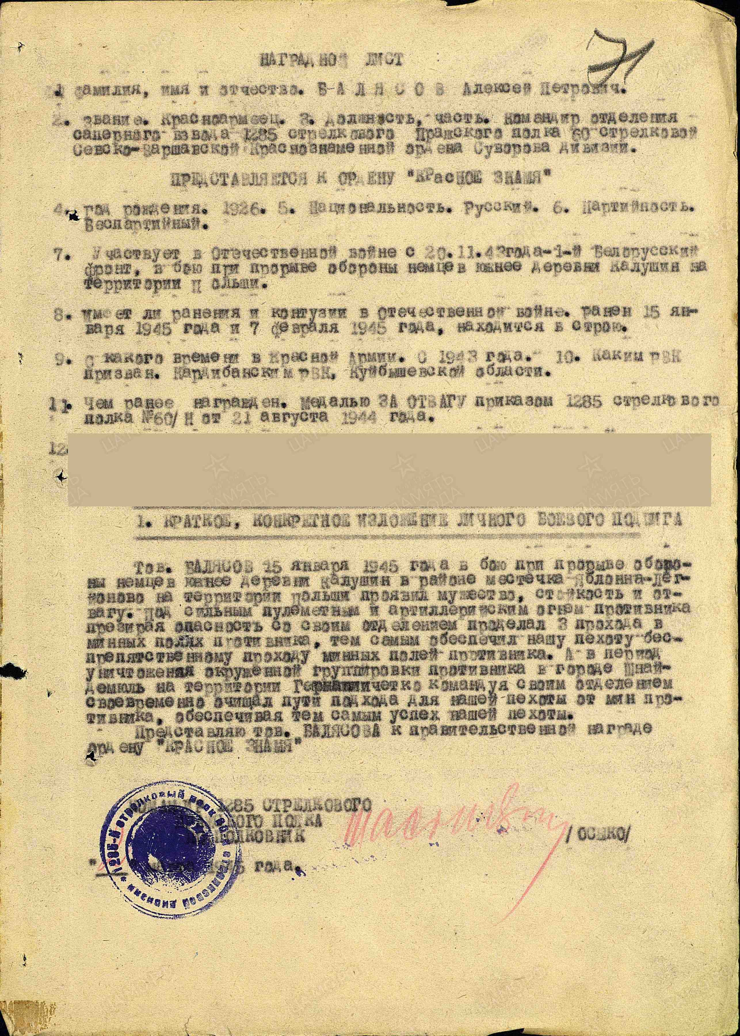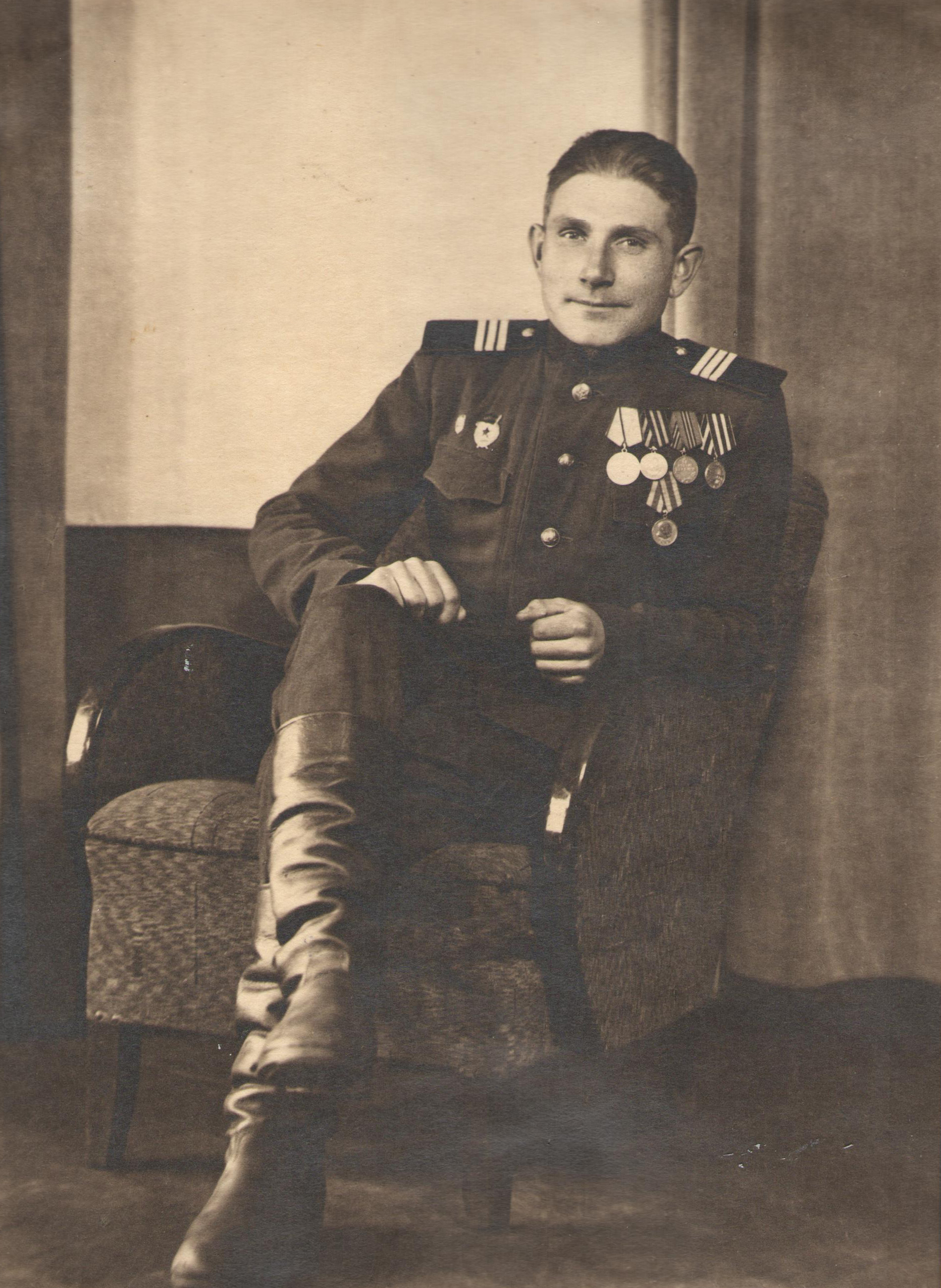 Награды: орден Красной Звезды, медали «За отвагу», «За взятие Берлина», «За победу над Германией в Великой Отечественной войне 1941–1945 гг.».