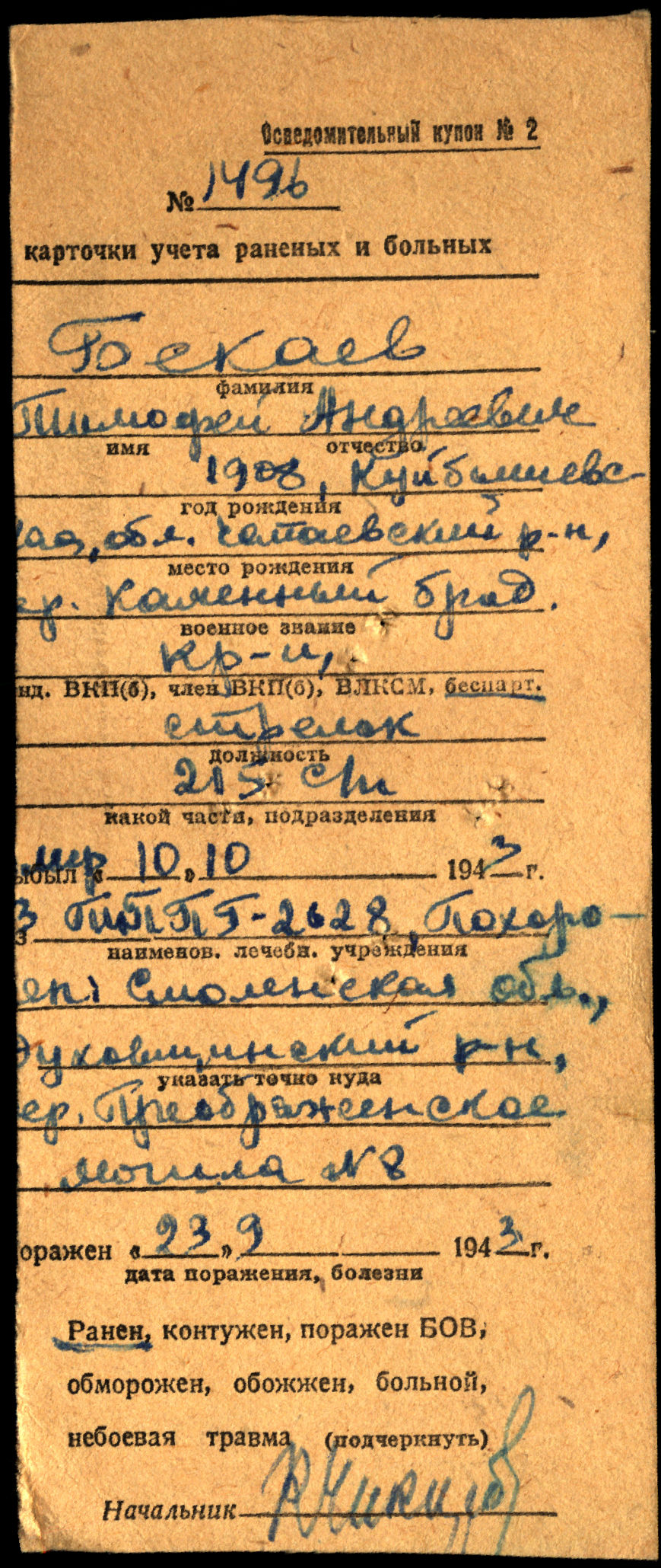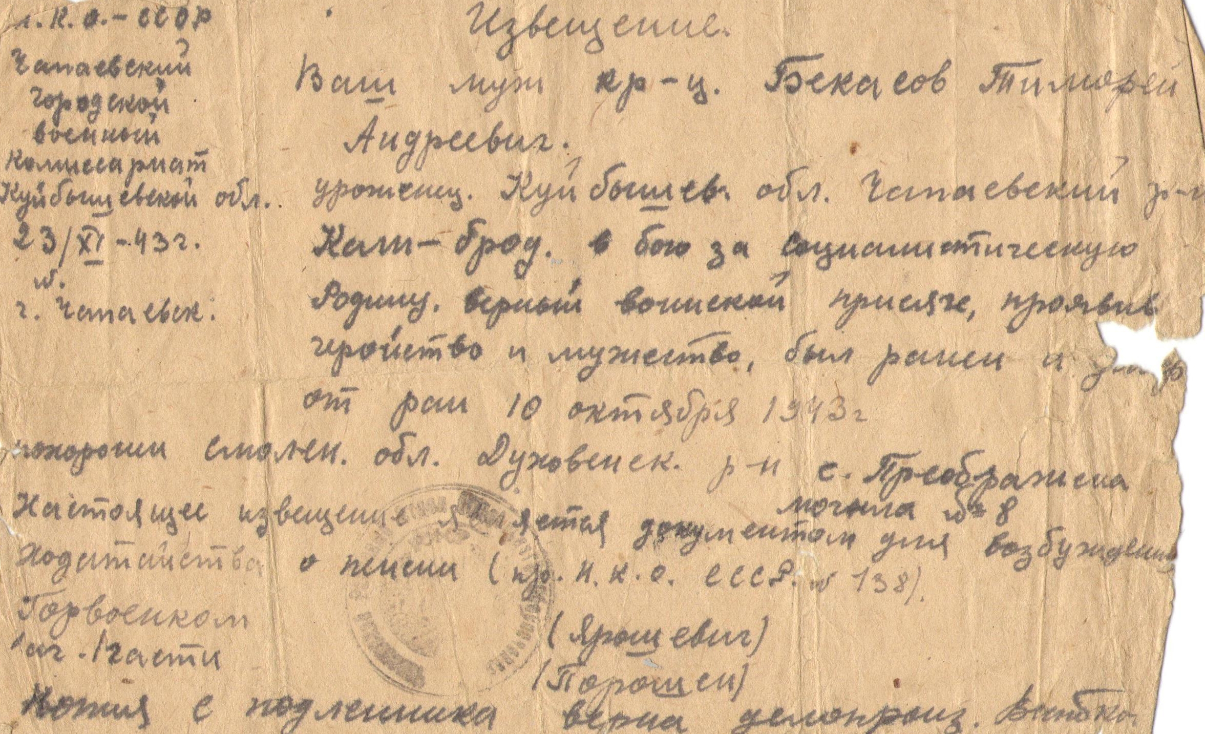 Сохранилось письмо, написанное Тимофеем Андреевичем в госпитале, куда он попал после полученного ранения в ногу.