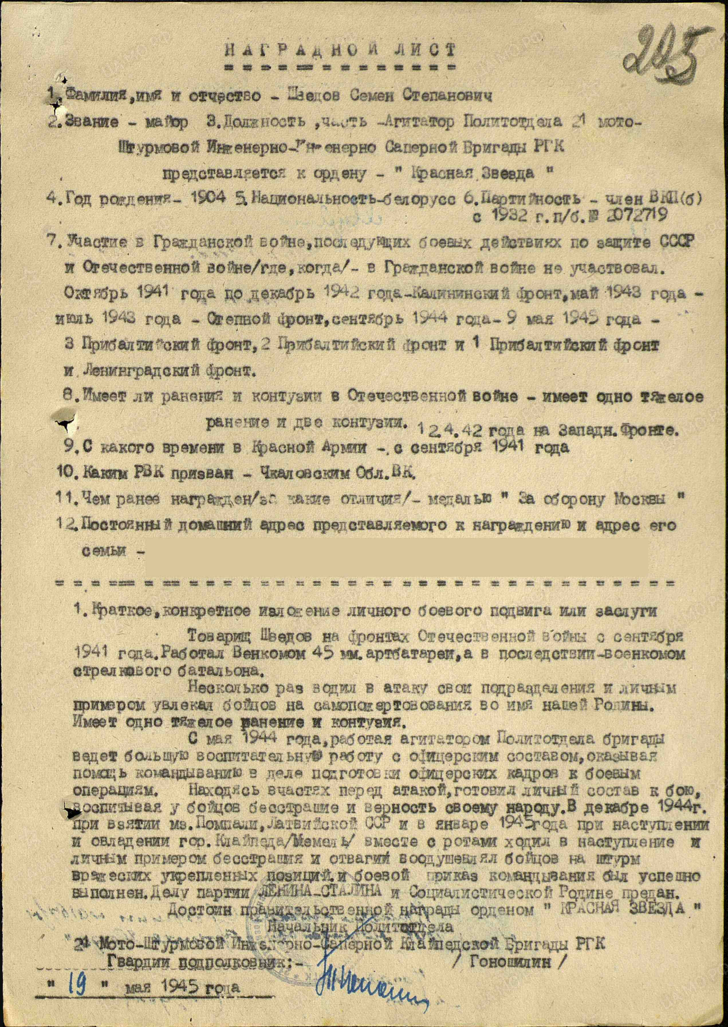 В мае 1945 г. служил в звании майор, в должности агитатор политотдела 21-й мотоштурмовой инженерно-саперной бригады РГК.