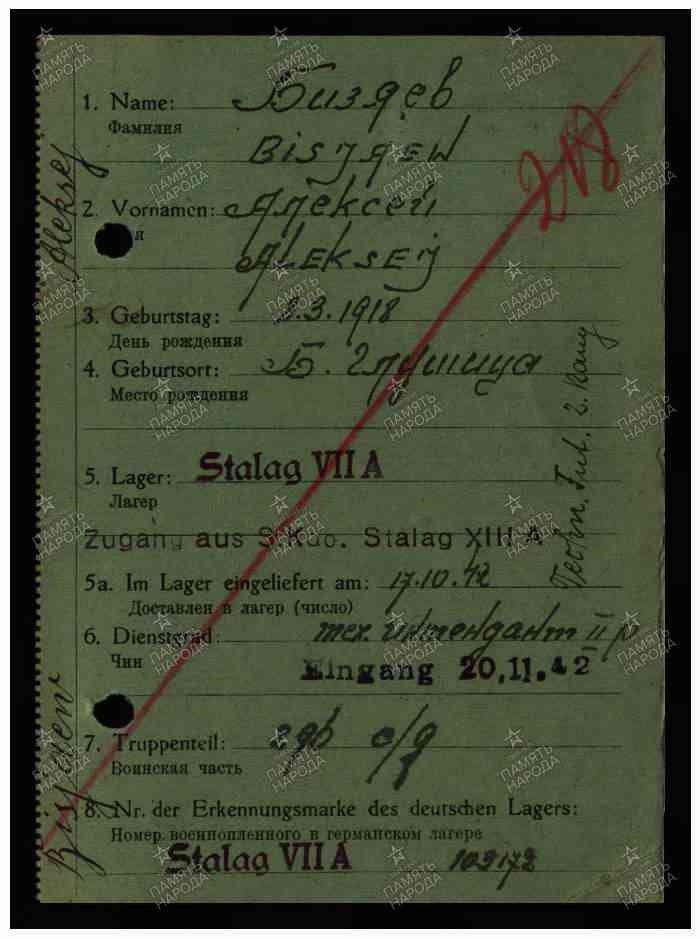 Родился 8.03.1918 г. в с. Большая Глушица Куйбышевской области. Проживал в п. Коноваловский. Призван в Красную Армию в 1939 г., звание – интендант. Стало известно, что Алексей Николаевич попал в плен в июле 1942 года в районе города Каменск. Содержался в лагере шталаг XIII A, шталаг VII A. В лагерь Шталаг VII А был доставлен 17.10.1942 года, о чем свидетельствует найденный документ (архивную копию документа прила-гаем).