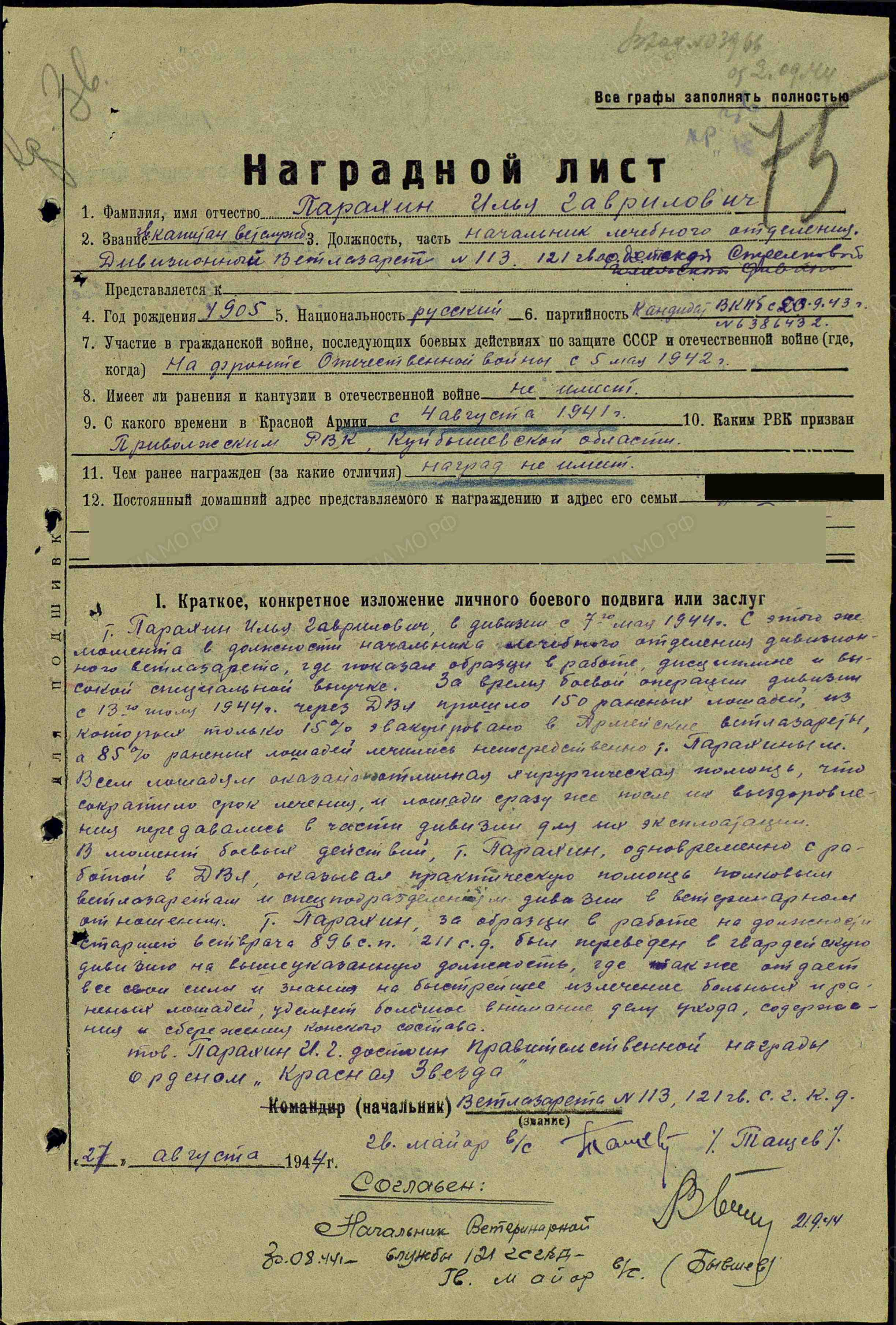 Из наградного листа стало известно следующее: «Тов. Парахин Илья Гаврилович в дивизии с 7 мая 1944 г. С этого момента в должности начальника лечебного отделения дивизионного ветлазарета, где показал образцы в работе, дисциплине и высокой специальной выучке. За время боевой операции дивизии с 13 июля 1944 г. через ДВЛ прошло 150 раненых лошадей, из которых только 15% эвакуировано в армейские ветлазареты, а 85% раненых лошадей лечились непосредственно тов. Парахиным. Всем лошадям оказана отличная хирургическая помощь, что сократило срок лечения, и лошади сразу же после их выздоровления передавались в части дивизии для их эксплуатации. В момент боевых действий тов. Парахин одновременно с работой в ДВЛ оказывал практическую помощь полковым ветлазаретам и спецподразделениям дивизии в ветеринарном отношении. Тов. Парахин за образцы в работе на должности старшего ветврача 896 СП 211 СД был переведен в гвардейскую дивизию на вышеуказанную должность, где также отдает все свои силы и знания на быстрейшее излечение больных и раненых лошадей, уделяет большое внимание делу ухода, содержания и сбережения конского состава. Достоин правительственной награды – ордена Красной Звезды». (наградной лист от 27.08.1944 г.).