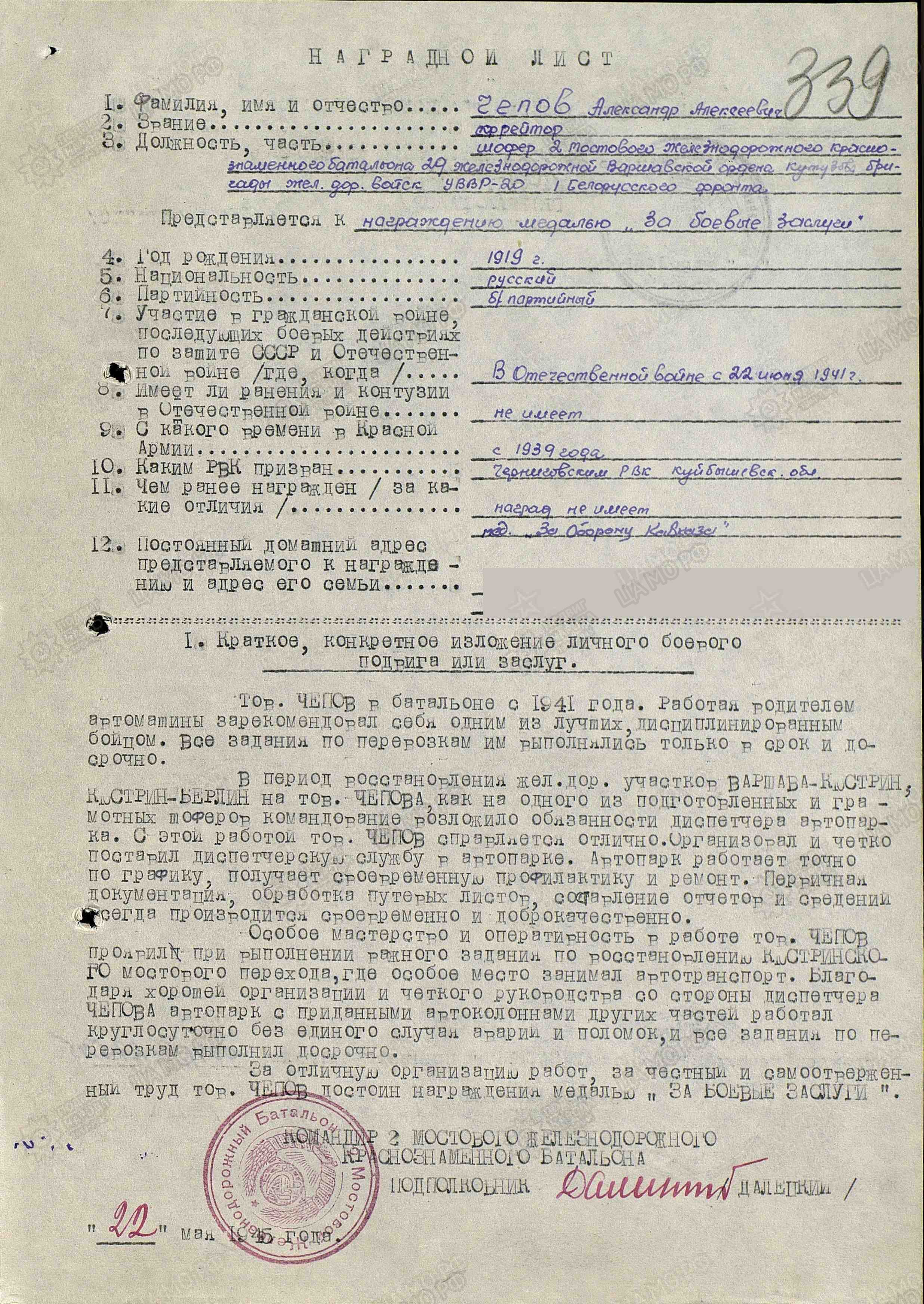 Информация из Наградного листа: «Тов. Чепов в батальоне с 1941 года. Работая водителем автомашины, зарекомендовал себя одним из лучших, дисциплинированным бойцом. Все задания по перевозкам им выполнялись только в срок и досрочно. В период восстановления железнодорожных участков Варшава-Кюстрин и Кюстрин-Берлин на тов. Чепова, как на одного из подготовленных и грамотных шоферов командование возложило обязанности диспетчера автопарка. С этой работой тов. Чепов справляется отлично. Организовал и четко поставил диспетчерскую службу в автопарке. Автопарк работает точно по графику, получает своевременную графику и ремонт. Первичная документация, обработка путевых листов, составление отчетов и сведений всегда производится своевременно и доброкачественно. Особое мастерство и оперативность в работе тов. Чепов проявил при выполнении важного задания по восстановлению Кюстринского мостового перехода, где особое место занимал автотранспорт. Благодаря хорошей организации и четкому руководству со стороны диспетчера Чепова автопарк с приданными автоколоннами других частей работал круглосуточно без единого случая аварий и поломок, и все задания по перевозкам выполнил досрочно. За отличную организацию работ, за честный и самоотверженный труд тов. Чепов достоин награждения медалью «За боевые заслуги». (наградной лист от 22.05.1945 г.).