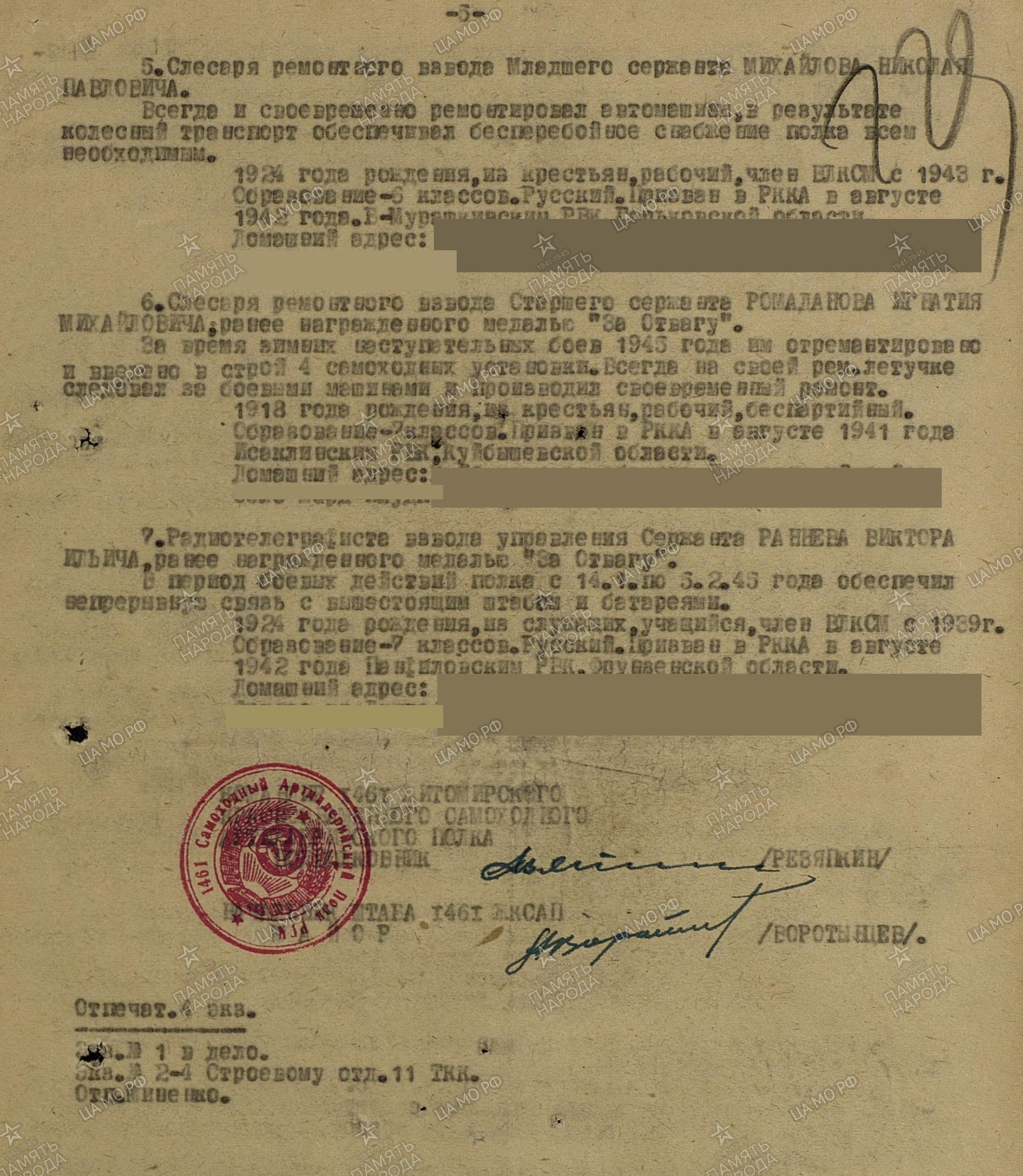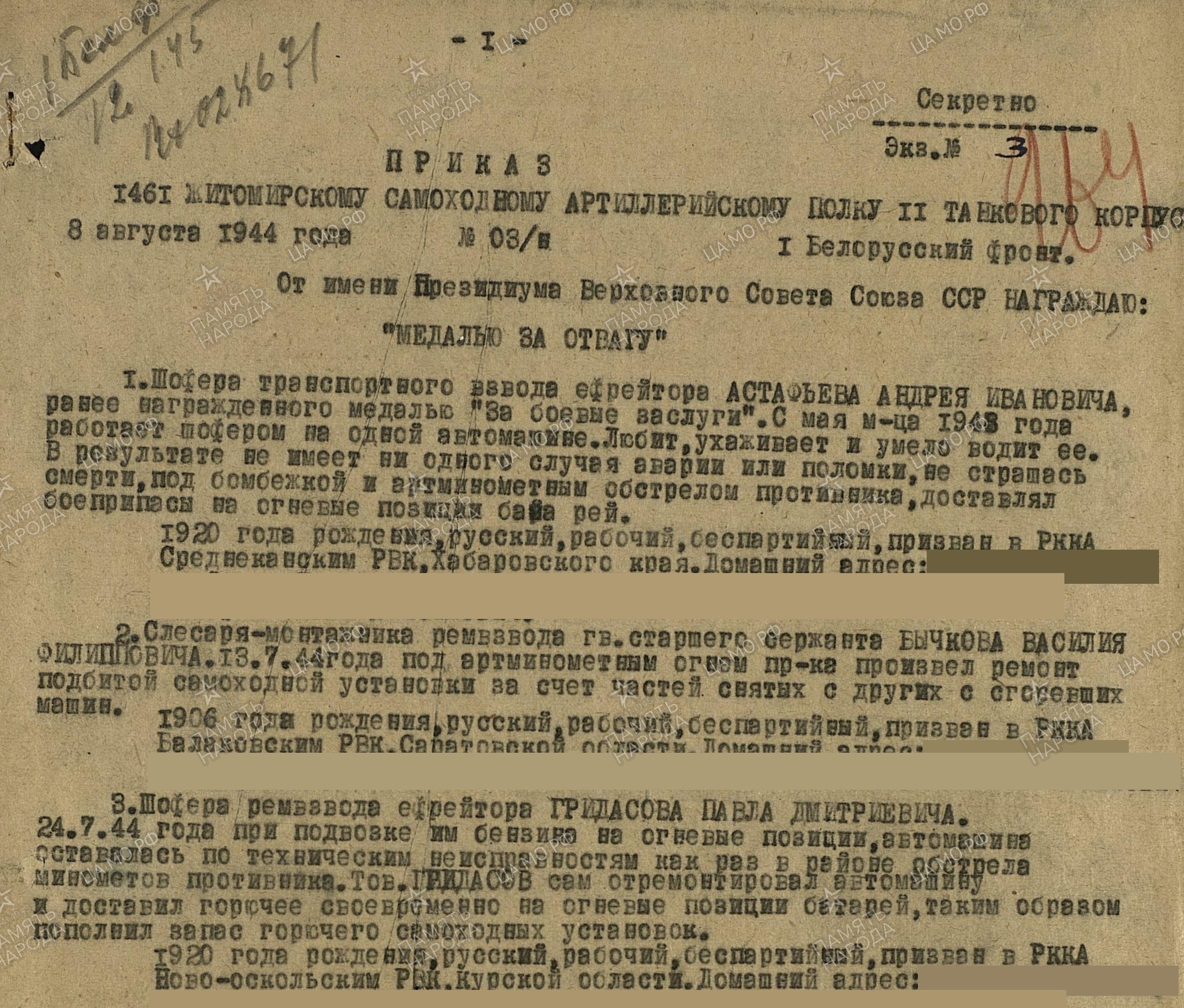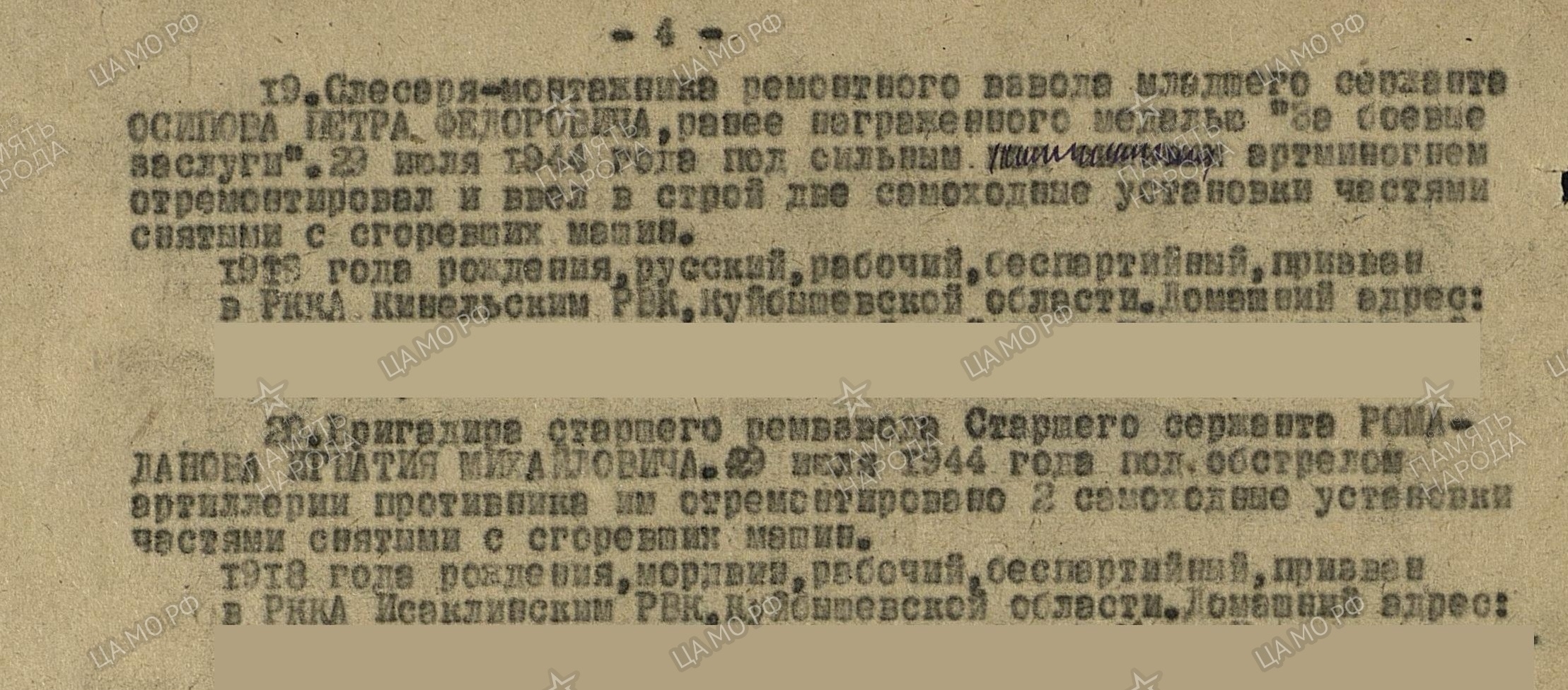 Информация из Приказа от 08.08.1944 г. о награждении медалью «За отвагу»: «29 июля 1944 года под обстрелом артиллерии противника им отремонтировано 2 самоходные установки частями снятыми с сгоревших машин».