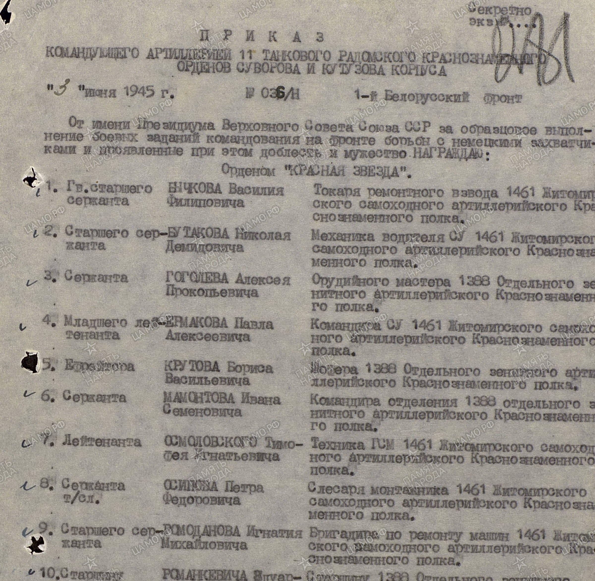 Информация из Приказа от 23.02.1945 г. о награждении медалью «За боевые заслуги»: «За время зимних наступательных боев 1945 года им отремонтировано и введено в строй 4 самоходных установки. Всегда на своей рем. летучке следовал за боевыми машинами и проводил своевременный ремонт».