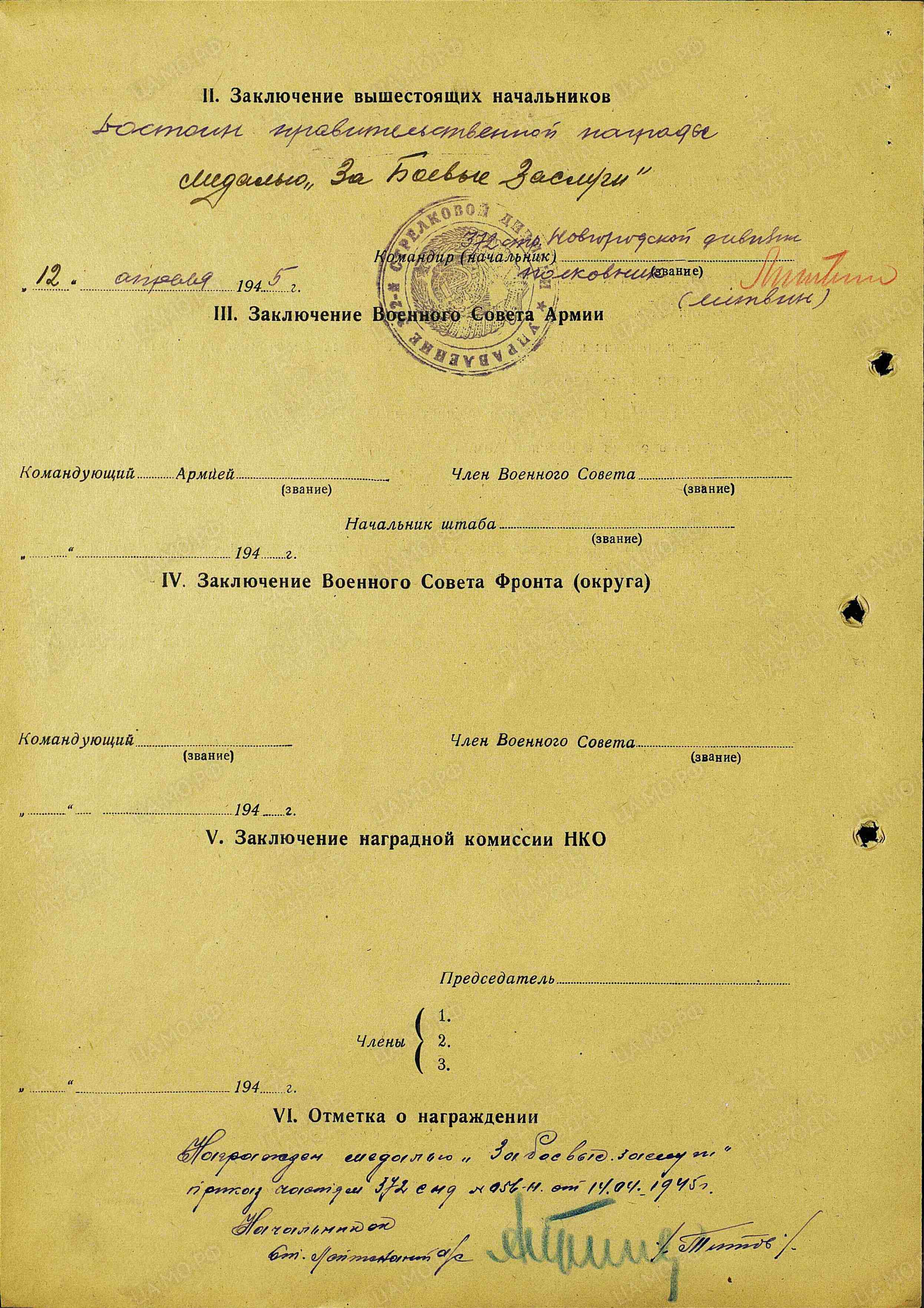 Призван Челно-Вершинским РВК Куйбышевской области. Участвовал в Великой Отечественной войне с 21 августа 1942 г. на Волховском и с 12 февраля 1944 г. на Ленинградском фронтах. Звание-красноармеец. Телефонист 3-его телефонно-кабельного взвода 829-ой роты связи 372 стрелковой Новгородской дивизии. Работая на телефонной линии от 1240 стрелкового полка, при штурме города Выборга 20 июня 1944 г. под минометном обстрелом противника устранил повреждения линии, сделав за 3 часа 10 выходов на линию, устранив 12 повреждений и обеспечив этим бесперебойность телефонной связи. За этот подвиг награжден правительственной наградой - медалью « За отвагу». Также был награжден медалью «За боевые заслуги» (1945 г.), орденом Отечественной войны II степени (1985 г.).