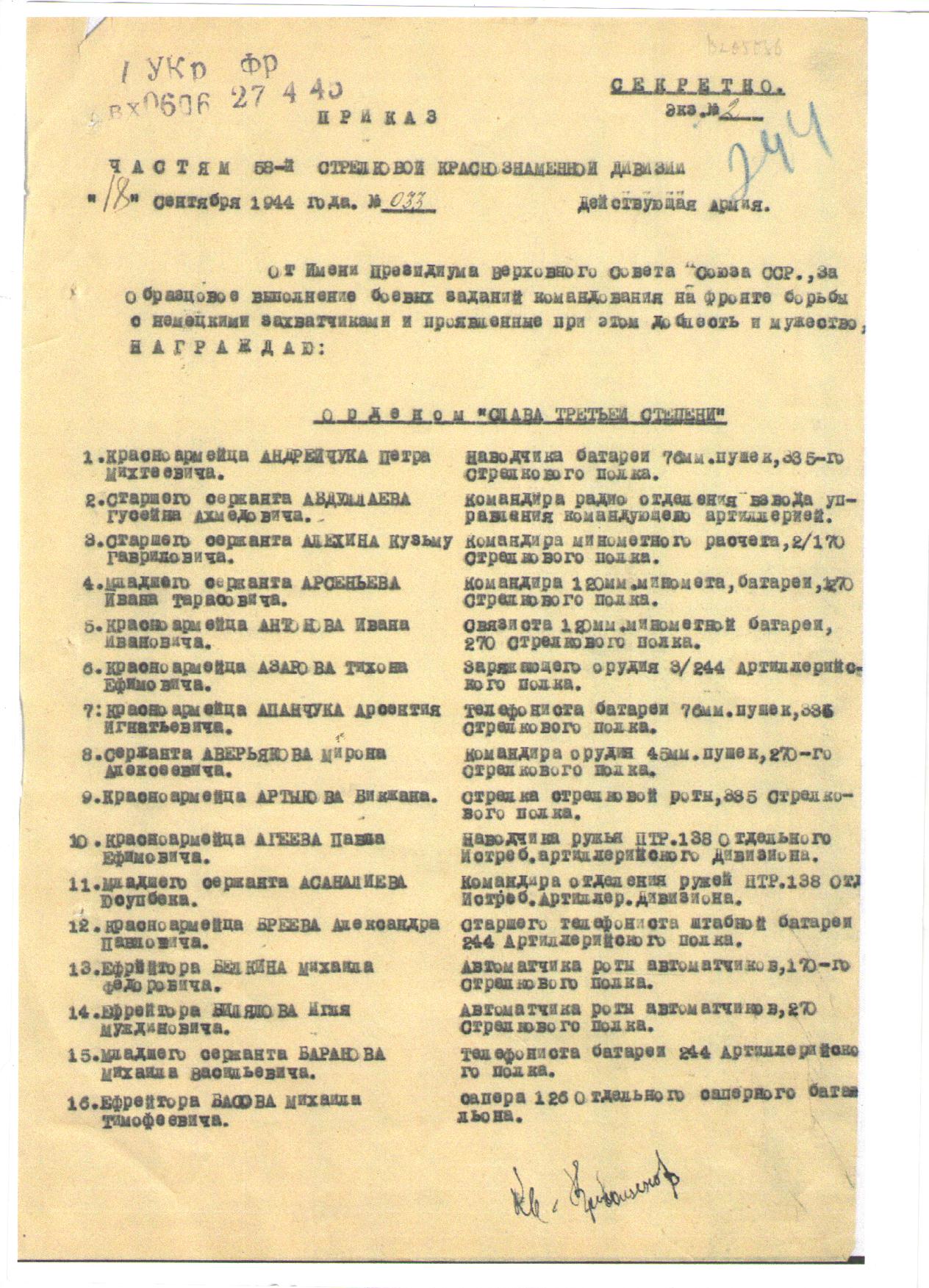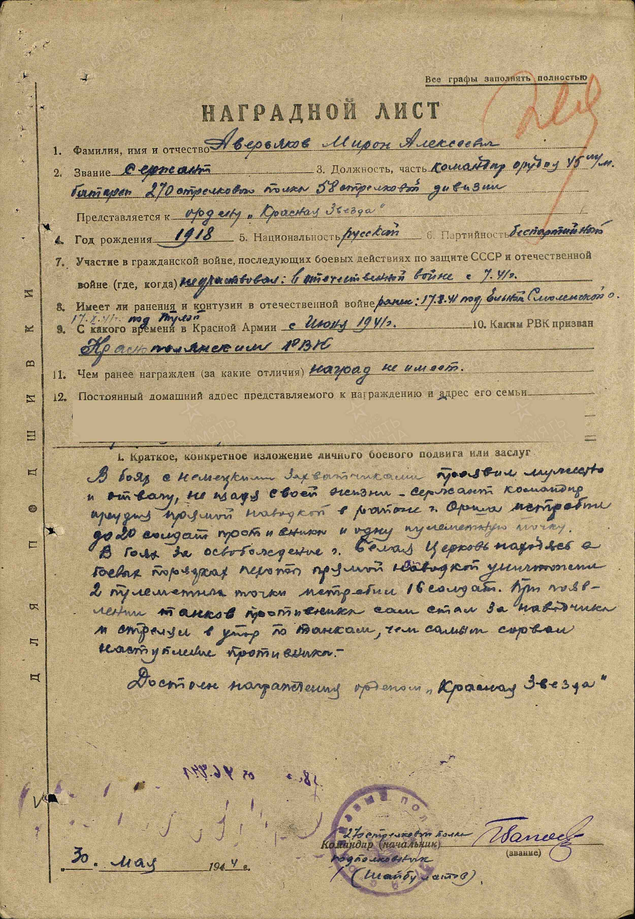 Мирон Алексеевич родился в 1918 году с. Сиделькино Чистопольского уезда Казанской губернии. До войны он работал в Москве, а в начале июля 1941 года добровольцем ушел на фронт. Боевой путь Мирона Алексеевича связан с 58-й стрелковой Краснознаменной дивизией. Участвовал в боях в районе Зайцевой горы, в тяжелых боях на Смоленщине, в тяжелейших боях Корсунь-Шевченковской операции. Награжден орденом Красной Звезды (1944 г.), орденом Славы III степени (1944 г.), медалью «За победу над Германией В Великой Отечественной войне 1941-1945 гг.», орденом Отечественной войны I степени (1985 г.), юбилейными медалями. Аверьяков М.А. прошел боевой путь до самой окраины Берлина, где был тяжело ранен. 9 мая 1945 года заканчивается боевой путь 58-й дивизии. Осталось за спиной 1500 км, 30 городов и 5 тысяч населенных пунктов.