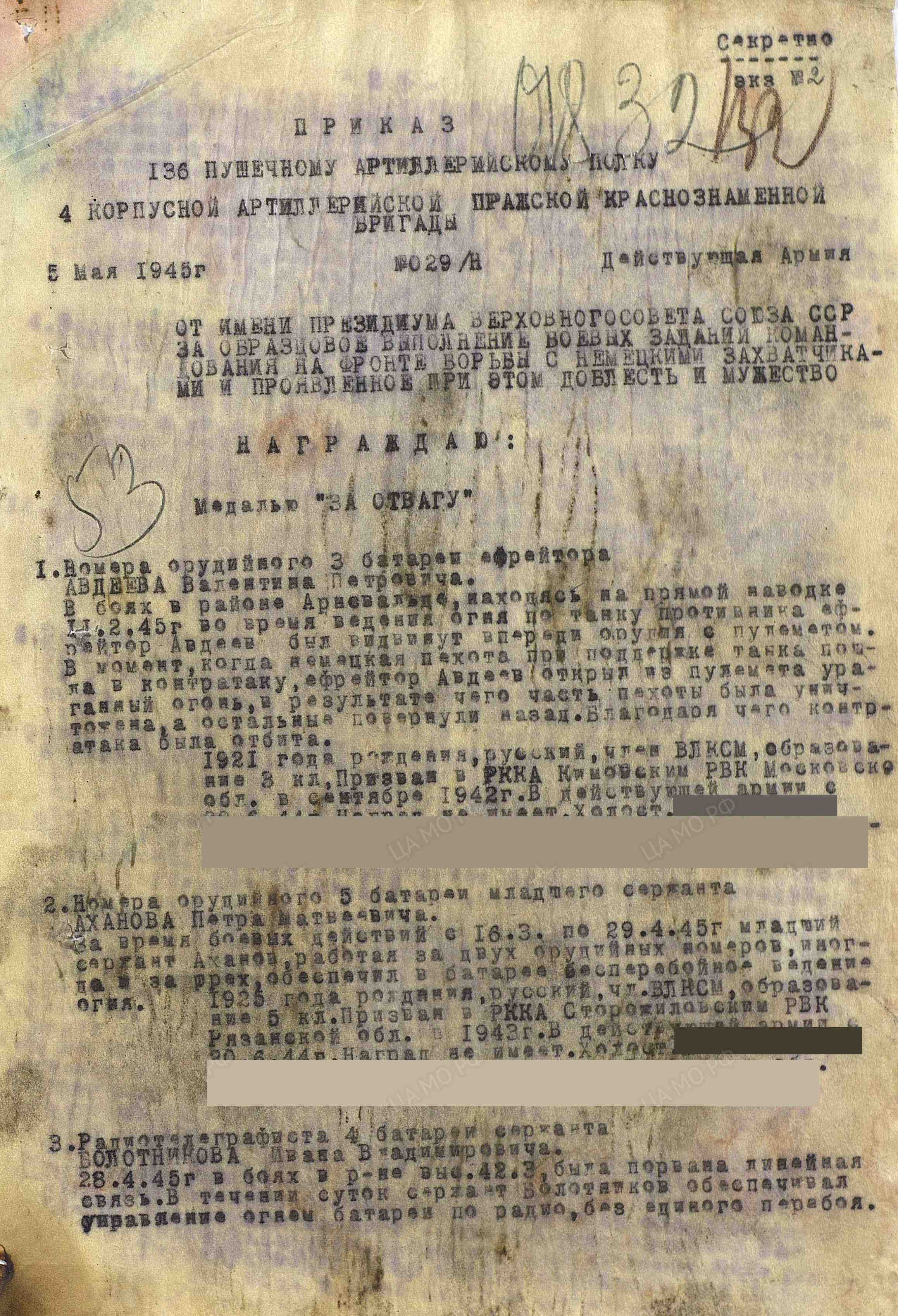 Награды: медаль «За отвагу», медаль «За победу над Германией в Великой Отечественной войне 1941–1945 гг.», медаль «За взятие Берлина».