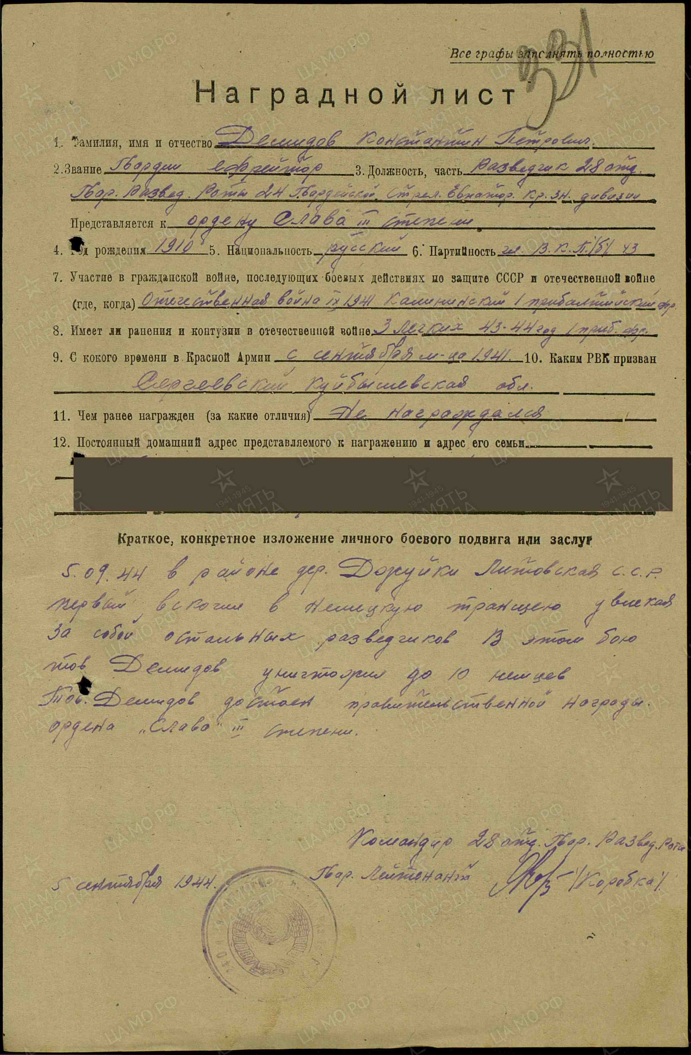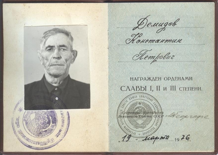 Разведчик 28-й отдельной разведывательной роты (24-я гвардии стрелковая дивизия, 2-я гвардейская армия, 1-й Прибалтийский фронт) гвардии ефрейтор Демидов отличился 5.09.1944 г. у дер. Тирелки, 11 км западнее г. Шяуляй (Литва). Увлекая за собой товарищей, первым ворвался во вражескую траншею и поразил огнем из автомата, гранатами около 10 гитлеровцев. 16.09.1944 г. награжден Орденом Славы III степени.