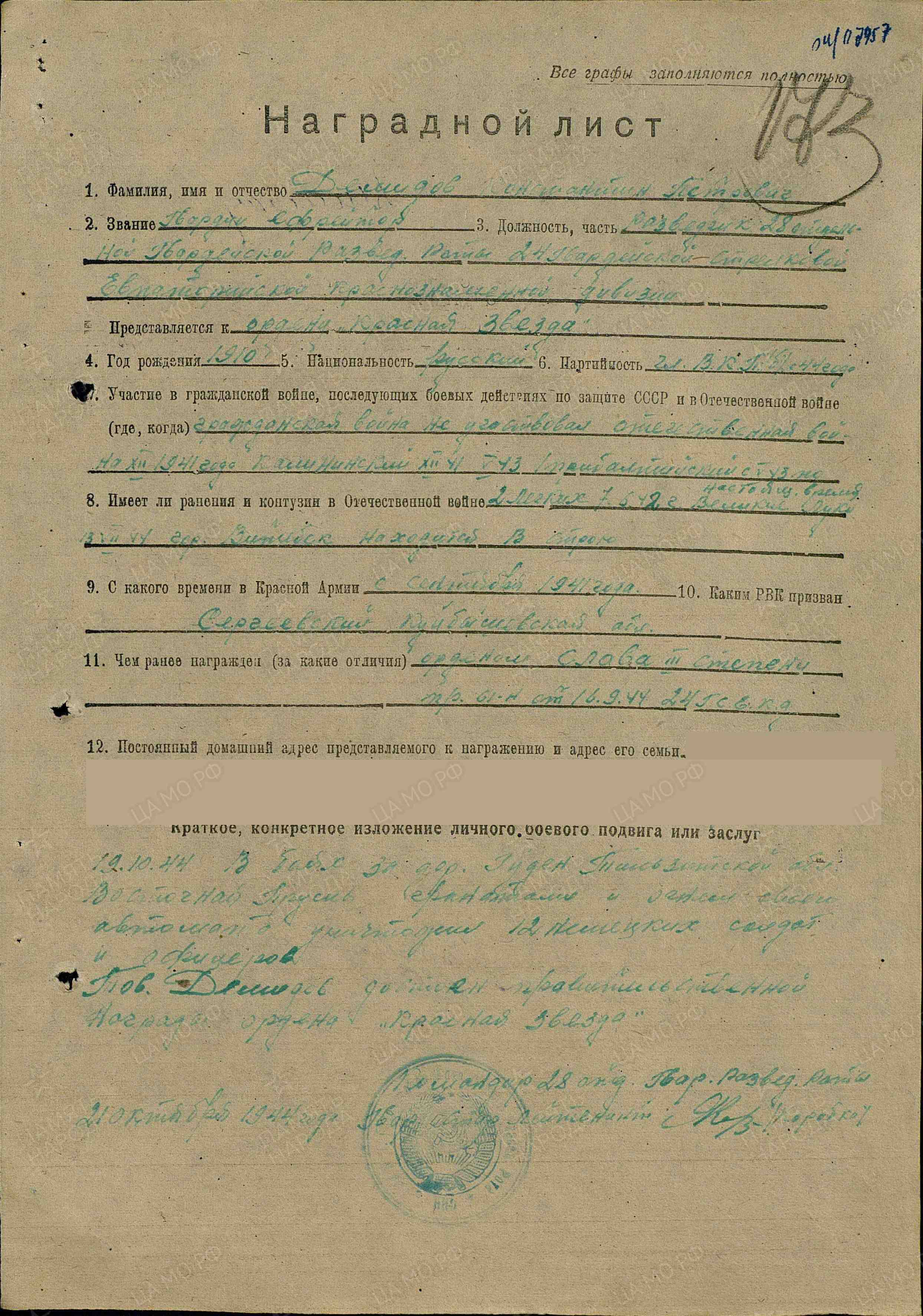 19.10.1944 г. в 8 км северо-западнее г. Тильзит (Восточная Пруссия, ныне г. Советск Калининградской обл.) вывел из строя 12 вражеских солдат и офицеров, обеспечив продвижение стрелкового подразделения. 26.11.1944 г. награжден Орденом Славы II степени.
