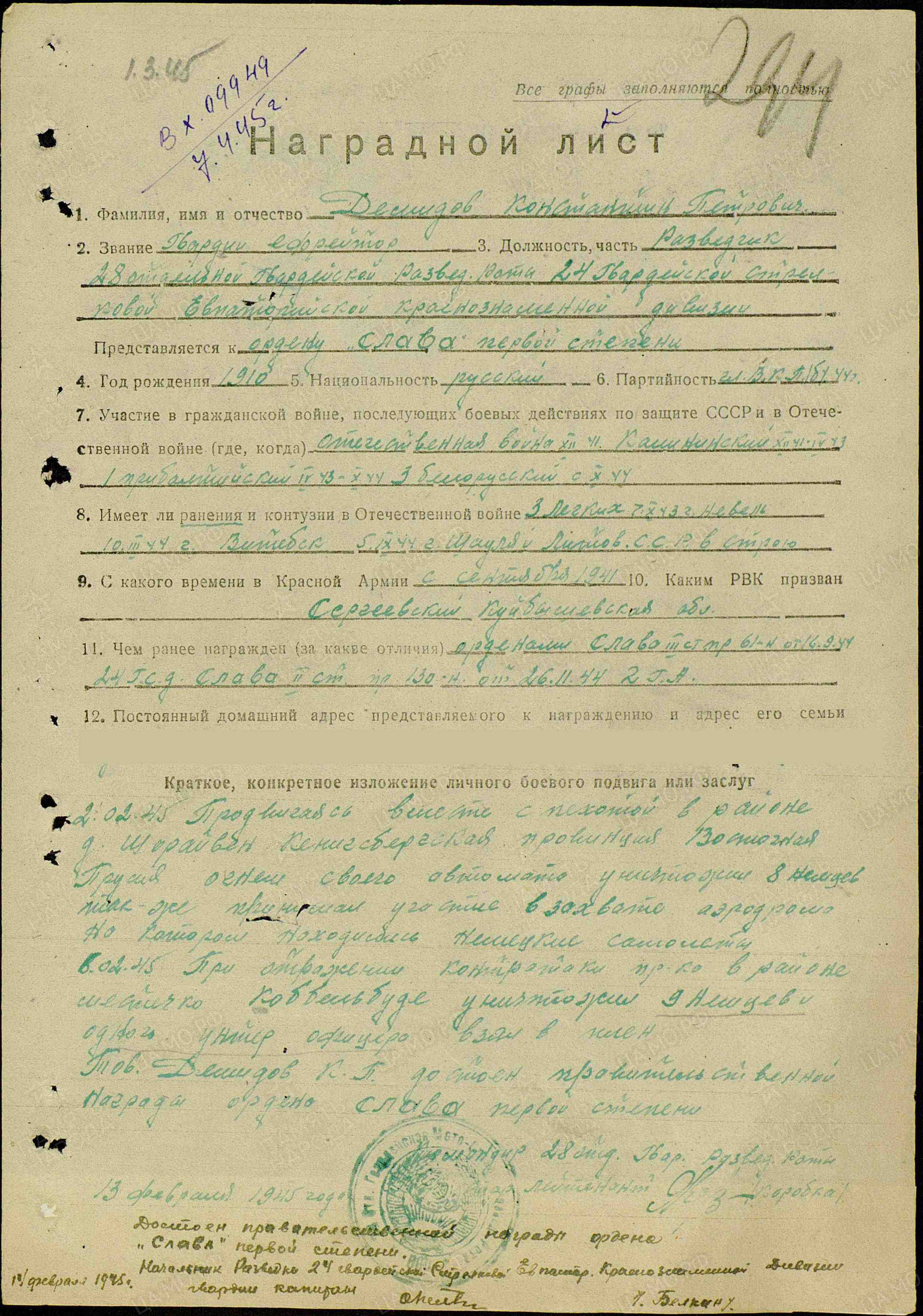 26.02.1945 г. в составе той же дивизии (39-я армия, 3-й Белорусский фронт), в 18-20 км западнее г. Кенигсберг (ныне Калининград), уничтожил несколько вражеских солдат, пленил унтер-офицера, участвовал в захвате аэродрома. 19.04.1945 г. награжден Орденом Славы I степени.