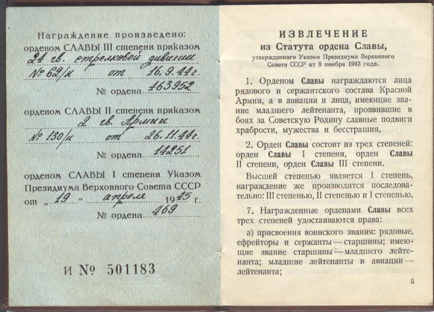 Награды: ордена Славы I, II и III степени, орден Красной Звезды, орден Отечественной войны I степени, медали.