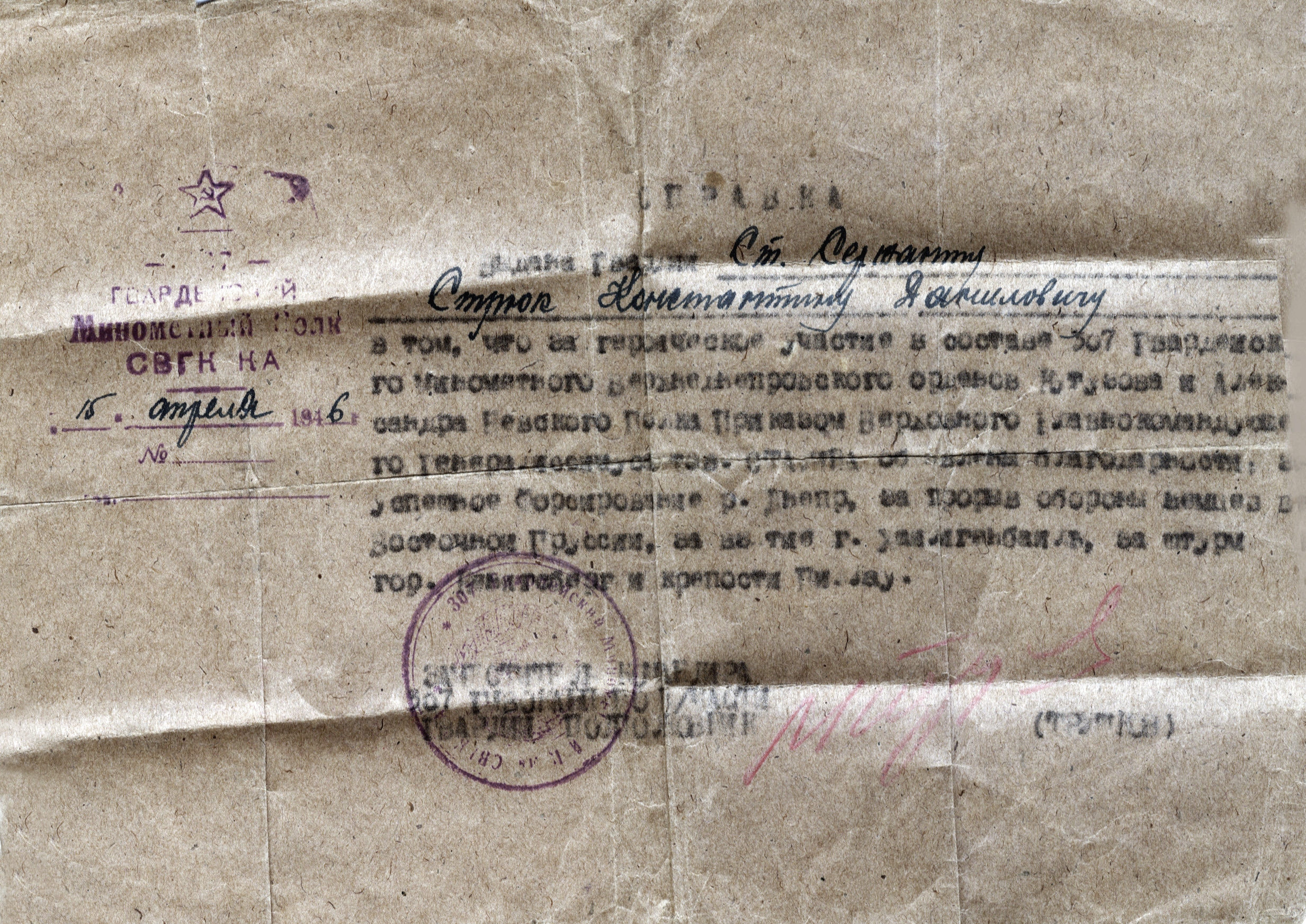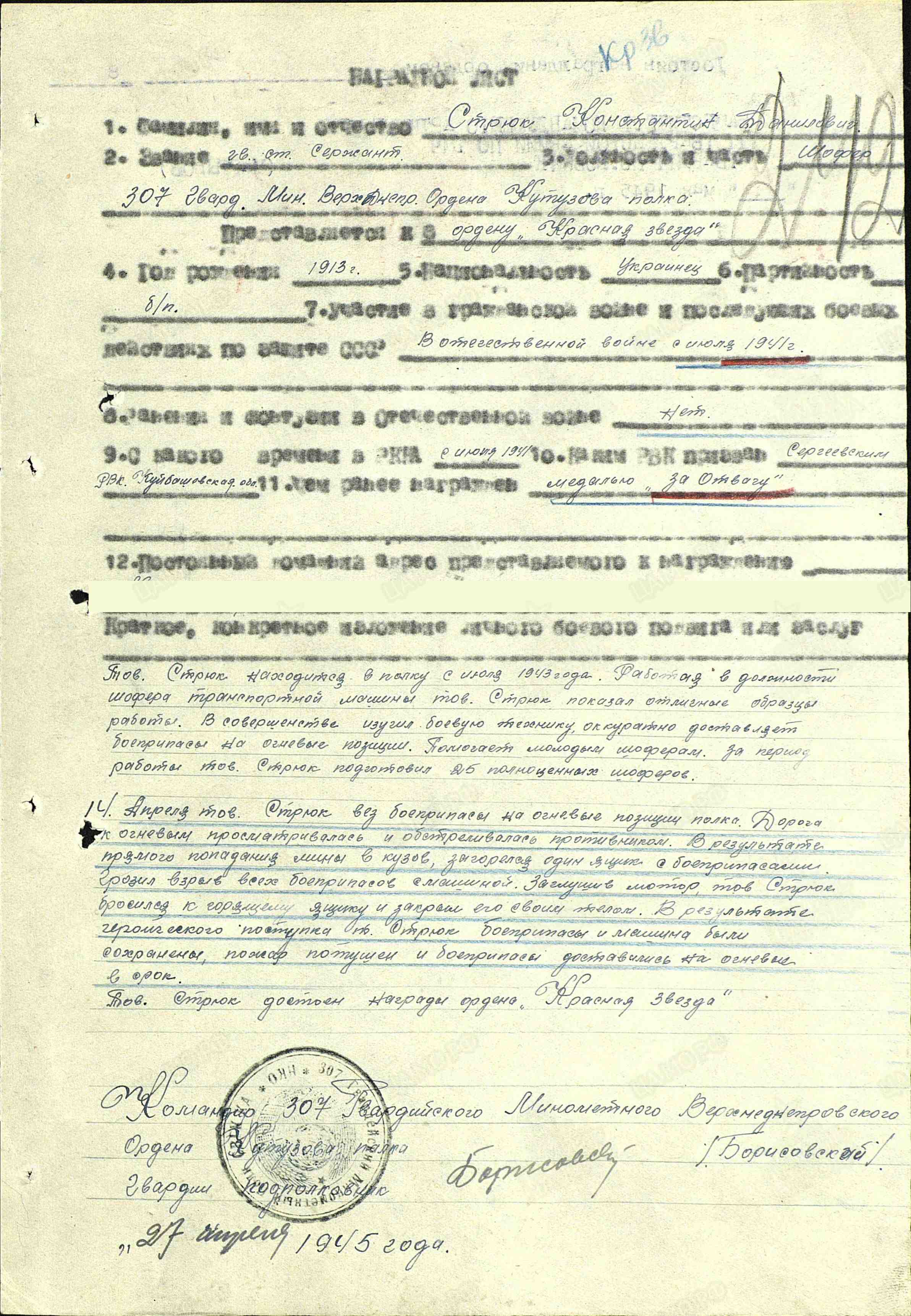 «Тов. Стрюк находится в полку с июля 1943 г. Работая в должности шофера транспортной машины, тов. Стрюк показал отличные образцы работы. В совершенстве изучил боевую технику, аккуратно доставляет боеприпасы на боевые позиции. Помогает молодым шоферам. За период работы тов. Стрюк подготовил 25 полноценных шоферов. 14 апреля 1945 г. тов. Стрюк вез боеприпасы на огневые позиции полка. Дорога к огневым просматривалась и простреливалась противником. В результате прямого попадания мины в кузов загорелся один ящик с боеприпасами. Грозил взрыв всех боеприпасов с машиной. Заглушив мотор, тов. Стрюк бросился к горящему ящику и закрыл его своим телом. В результате героического поступка тов. Стрюк боеприпасы и машина были сохранены, пожар потушен и боеприпасы были доставлены на огневые в срок. Достоин награды – ордена Красной Звезды (наградной лист от 27.04.1945 г.)».