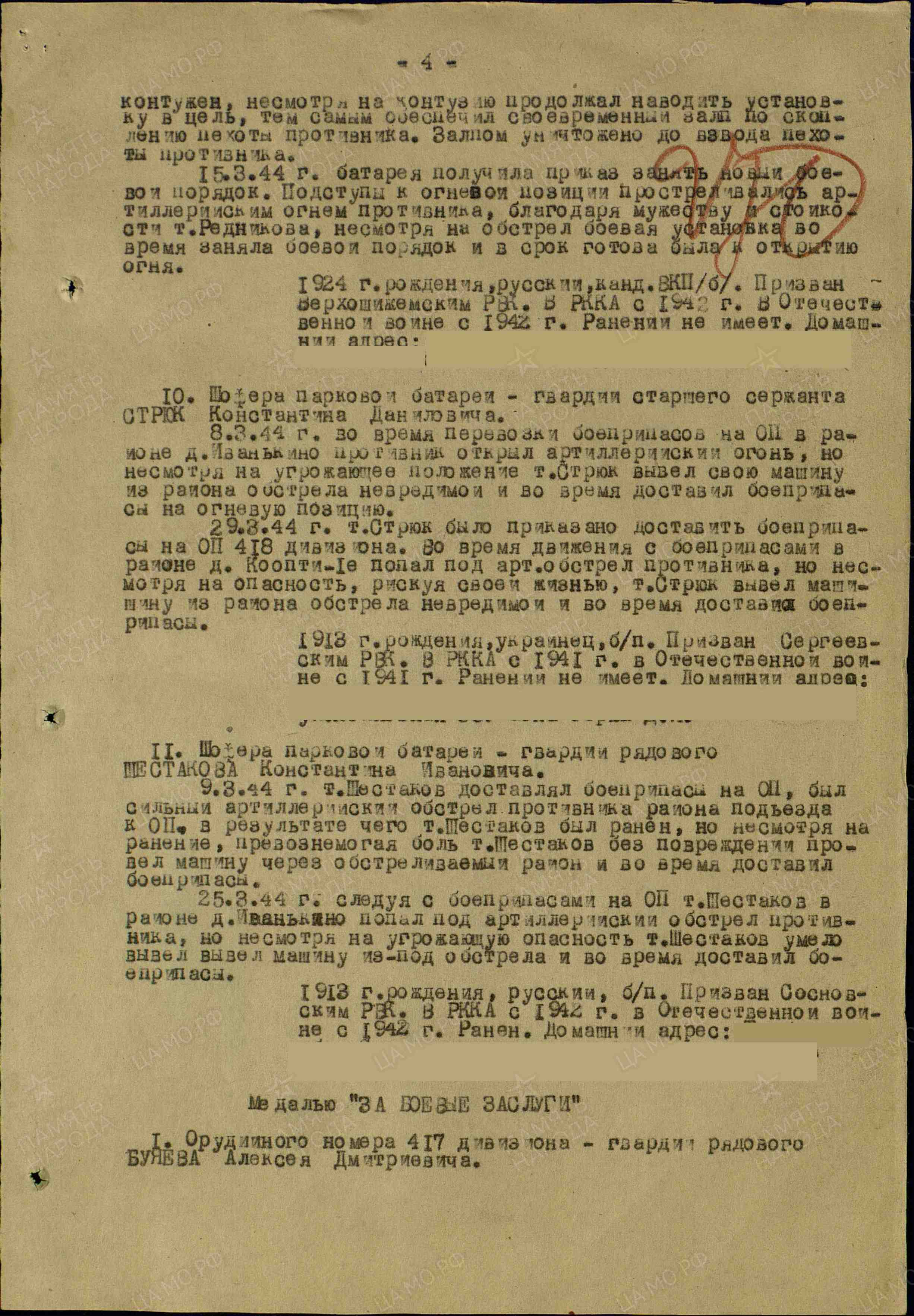 Информация сайта podvignaroda.ru: «Наградить медалью «За отвагу» шофера парковой батареи гвардии старшего сержанта Стрюк Константина Даниловича. 8 марта 1944 г. во время перевозки боеприпасов на ОП (опорный пункт) в районе д. Иванькино противник открыл артиллерийский огонь, но, несмотря на угрожающее положение, тов. Стрюк вывел свою машину из района обстрела невредимой и вовремя доставил боеприпасы на огневую позицию. 29 марта 1944 г. тов. Стрюк было приказано доставить боеприпасы на ОП 418-го дивизиона. Во время движения с боеприпасами в районе д. Кооптие попал под обстрел противника, но, несмотря на опасность, рискуя своей жизнью, тов. Стрюк вывел машину из района обстрела невредимой и вовремя доставил боеприпасы (наградной лист от 3.05.1944 г.)».