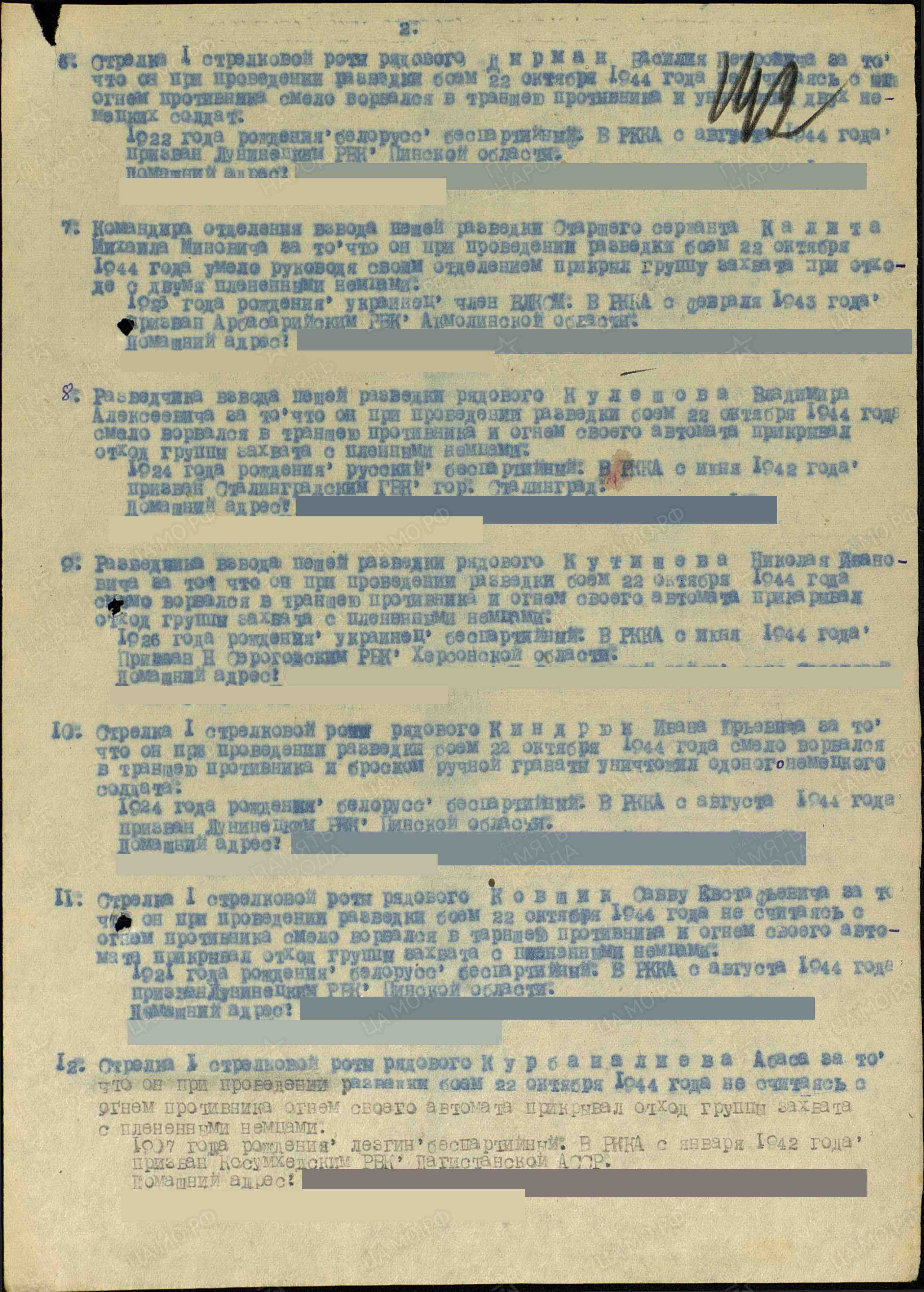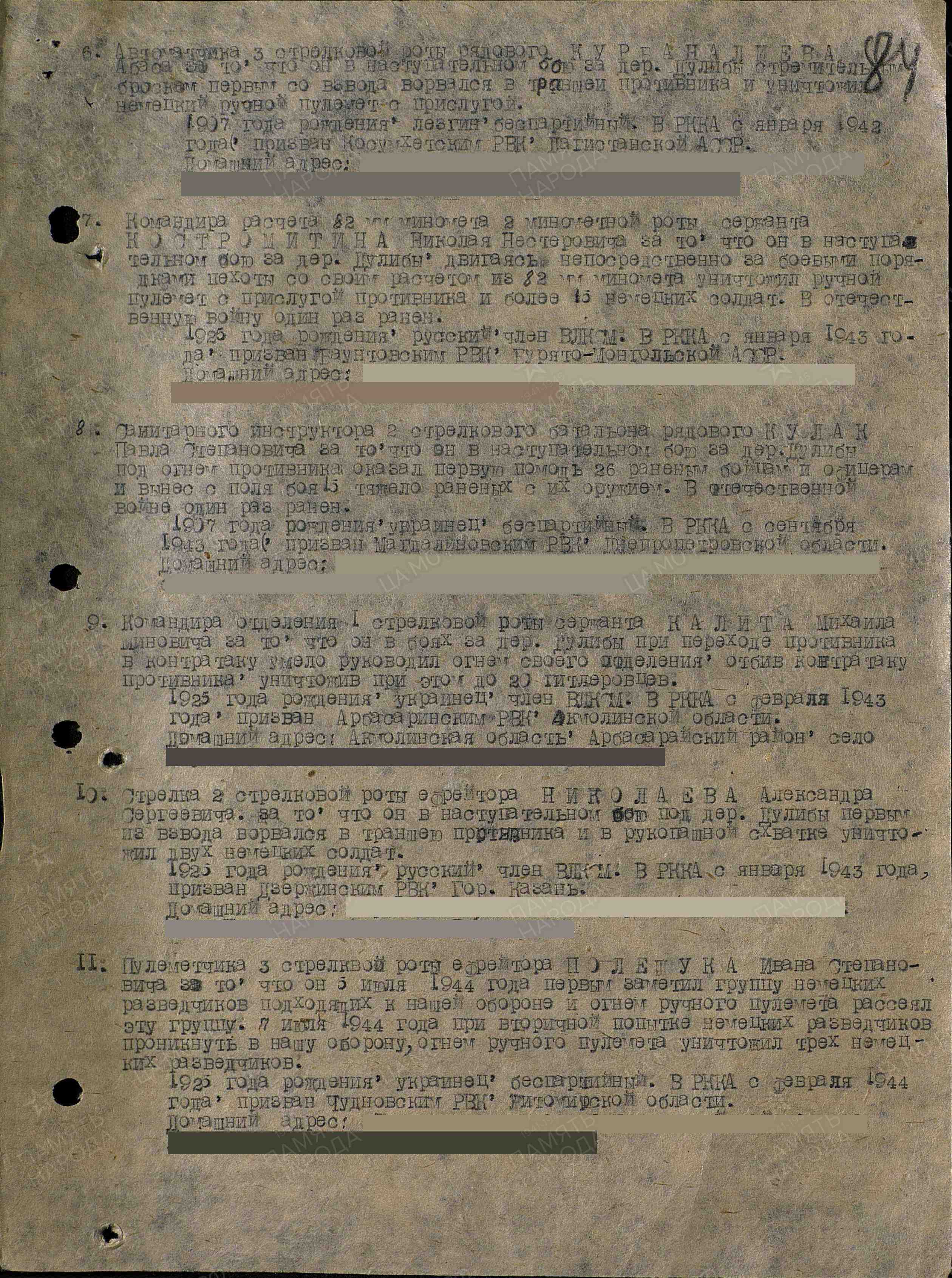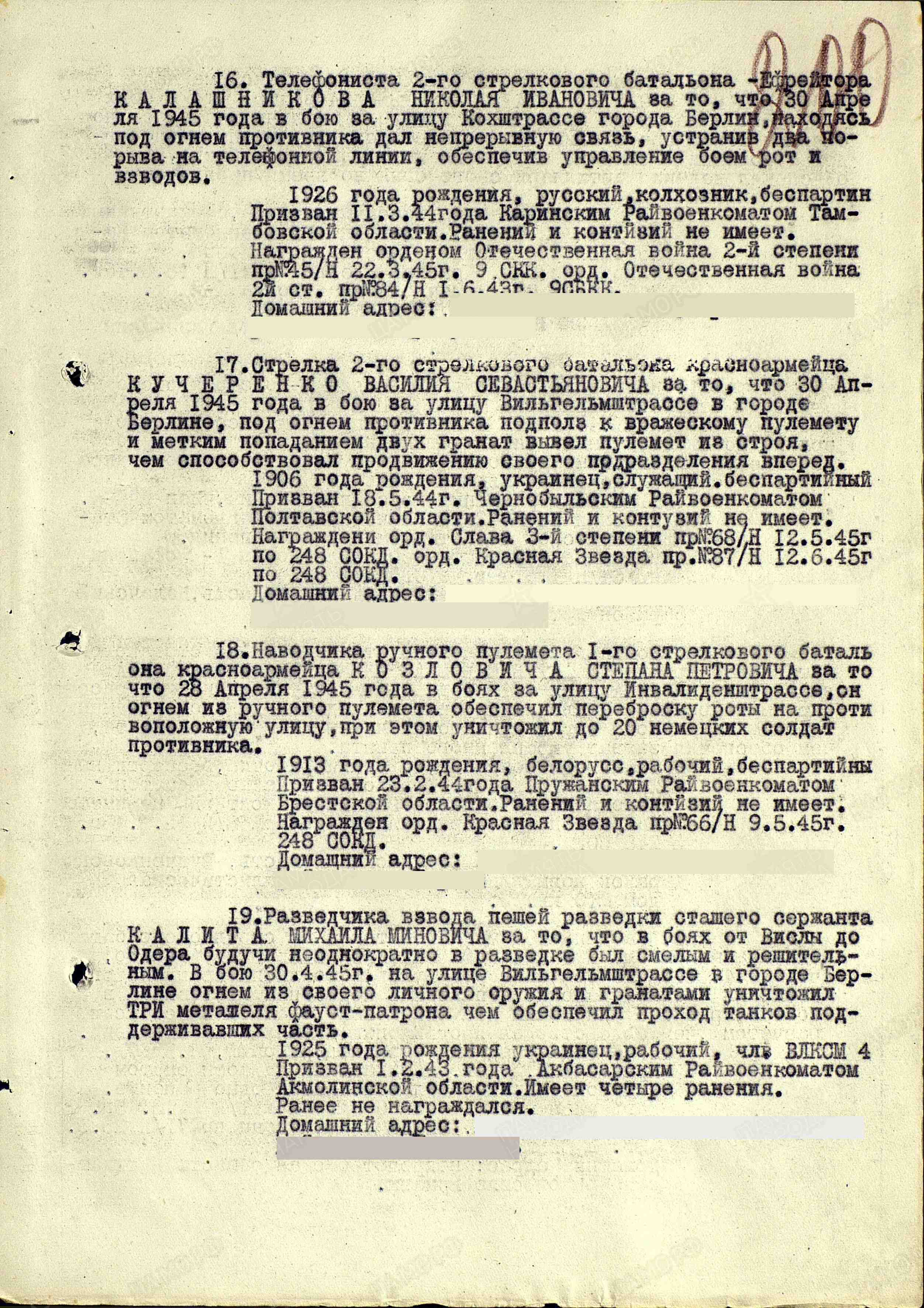 Из Приказа №18-н от 12.09.1945 г. по 902 стрелковому Берлинскому ордена Кутузова полку 248 Стрелковой Одесской Краснознаменной дивизии: наградить медалью «За отвагу» «разведчика взвода пешей разведки старшего сержанта Калита Михаила Миновича за то, что в боях от Вислы до Одера будучи неоднократно в разведке был смелым и решительным. В бою 30.4.45 г. на улице Вильгельмштрассе в городе Берлине огнем из своего личного оружия и гранатами уничтожил три метателя фауст-патрона, чем обеспечил проход танков поддерживавших часть».