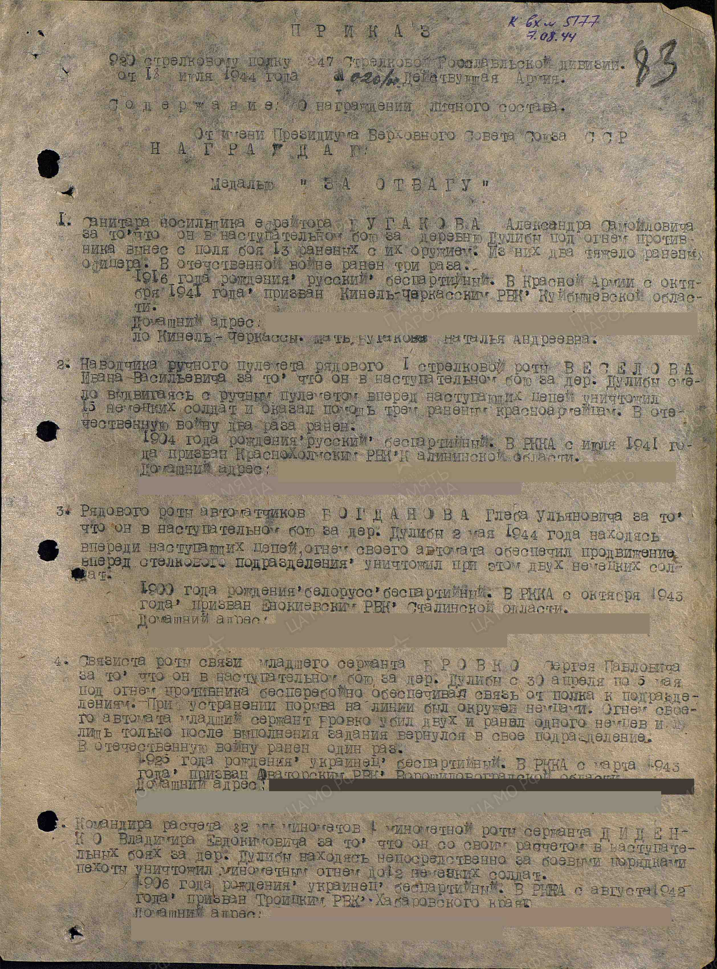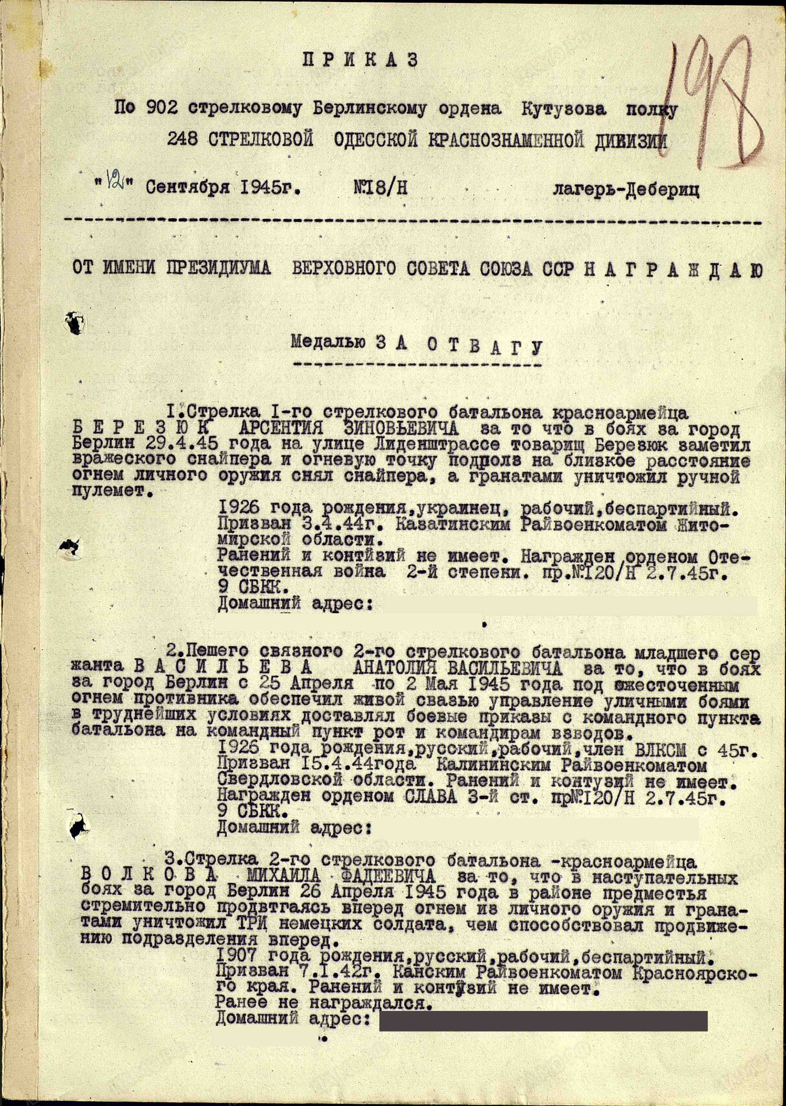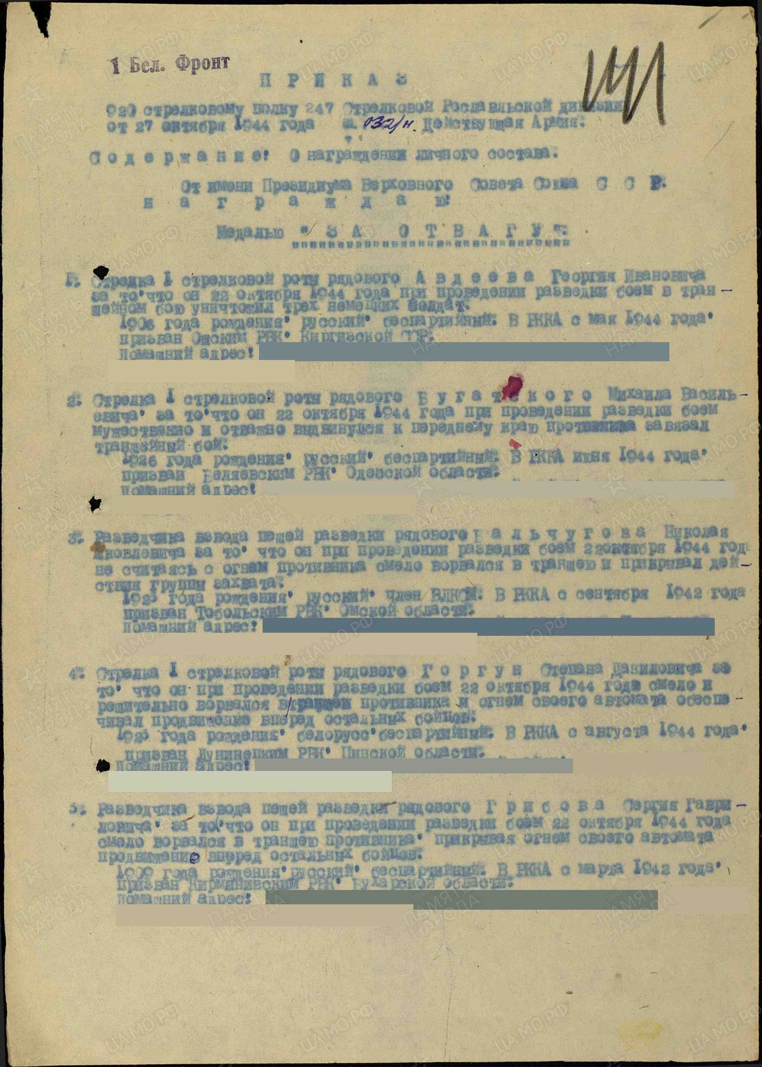 Из Приказа №18-н от 12.09.1945 г. по 902 стрелковому Берлинскому ордена Кутузова полку 248 Стрелковой Одесской Краснознаменной дивизии: наградить медалью «За отвагу» «разведчика взвода пешей разведки старшего сержанта Калита Михаила Миновича за то, что в боях от Вислы до Одера будучи неоднократно в разведке был смелым и решительным. В бою 30.4.45 г. на улице Вильгельмштрассе в городе Берлине огнем из своего личного оружия и гранатами уничтожил три метателя фауст-патрона, чем обеспечил проход танков поддерживавших часть».