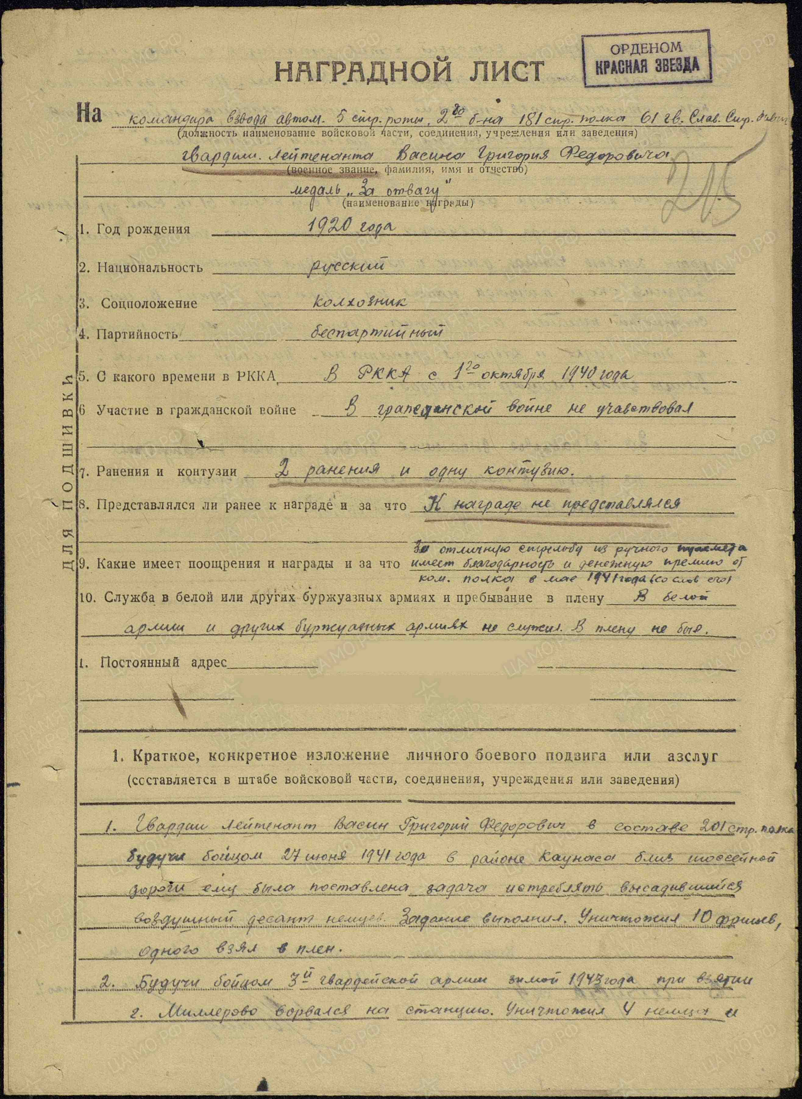 3. Будучи командиром взвода автоматчиков 181 стр. полка 61 гв. Слав. стр. дивизии при взятии города Славянска была поставлена задача команд. роты занять четыре улицы и площадь. При выполнении этого задания около площади напал на водокачку (будку). В ней был станковый пулемет и 3 немца. Обходным путем он пробрался к этой будке и забросал гранатами. Пулемет замолк. Улицы занял. Площадь освободил».