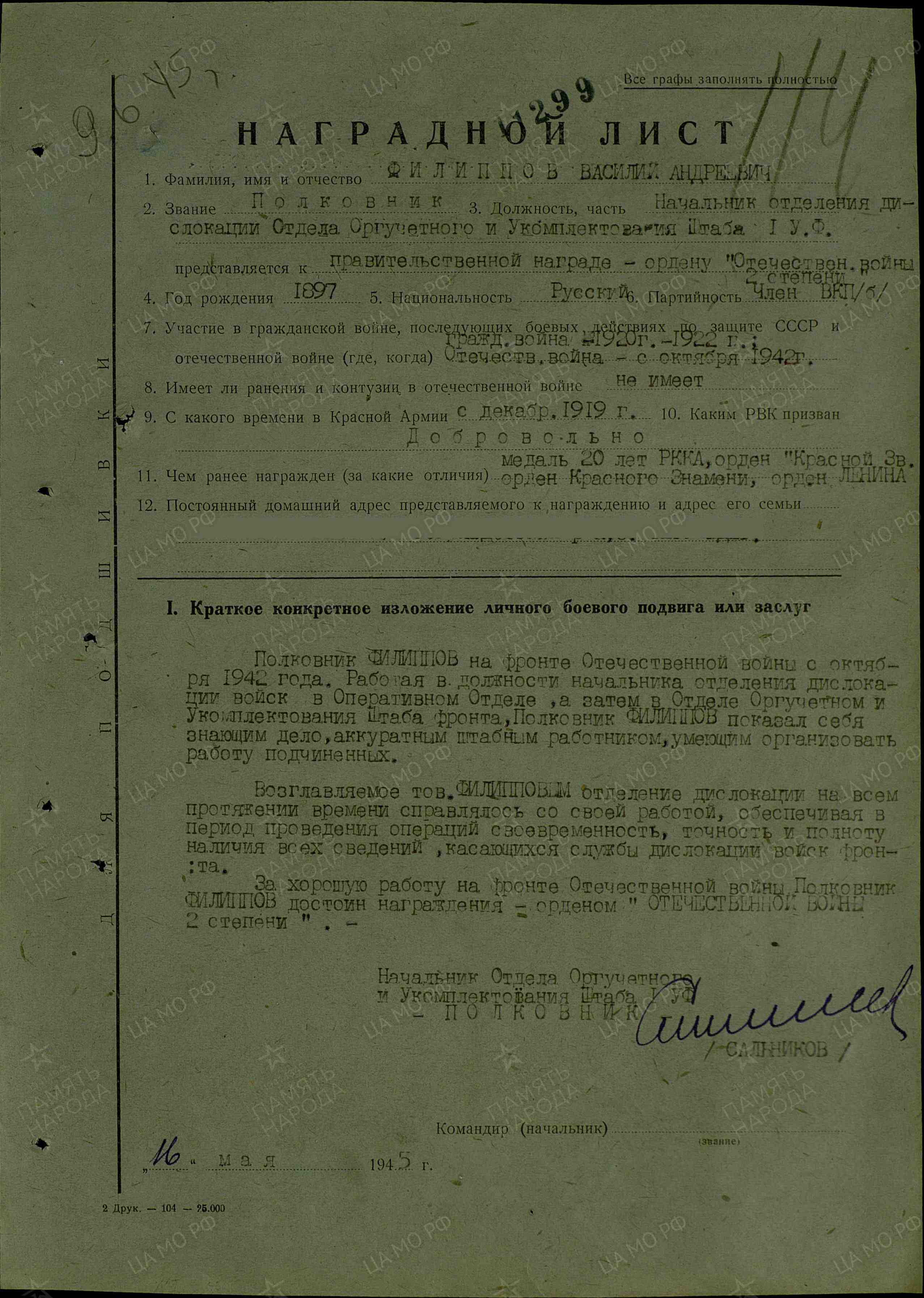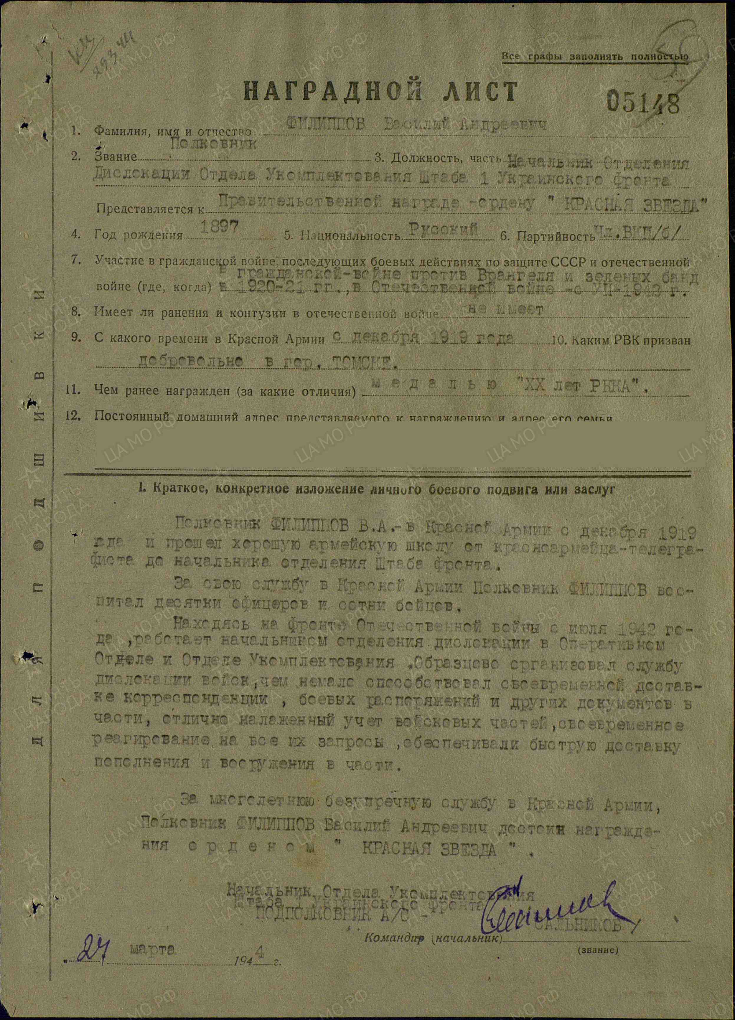 Полковник Филиппов В.А. в Красной армии с декабря 1919 г. и прошел хорошую армейскую школу от красноармейца-телеграфиста до начальника отделения штаба фронта. За свою службу в Красной армии полковник Филиппов воспитал десятки офицеров и сотни бойцов. Находясь на фронте Отечественной войны с июля 1942 г., работает начальником отделения дислокации в оперативном отделе и отделе укомплектования. Образцово организовал службу дислокации войск, чем немало способствовал своевременной доставке корреспонденции, боевых распоряжений и других документов в части. Отлично налаженный учет войсковых частей, своевременное реагирование на все их запросы обеспечивали быструю доставку пополнения и вооружения в части. За многолетнюю безупречную службу в Красной армии полковник Филиппов Василий Андреевич достоин награждения орденом Красной Звезды (наградной лист от 24.03.1944 г.).