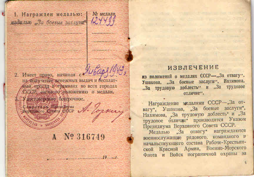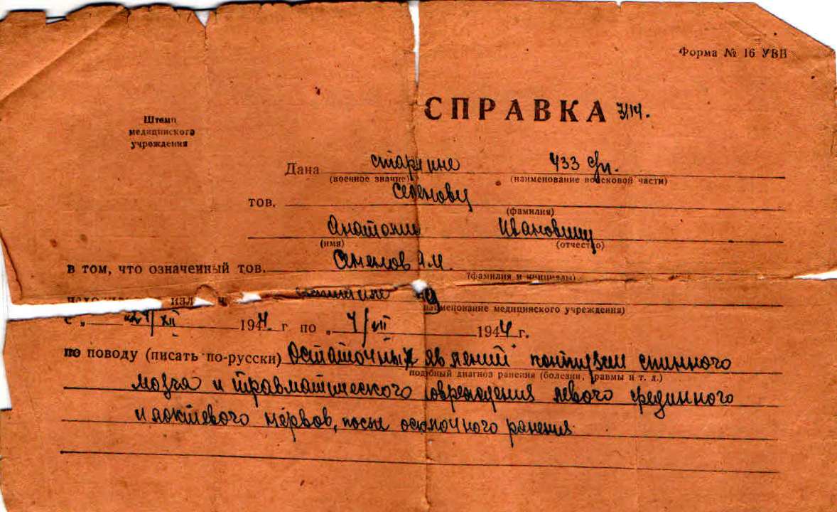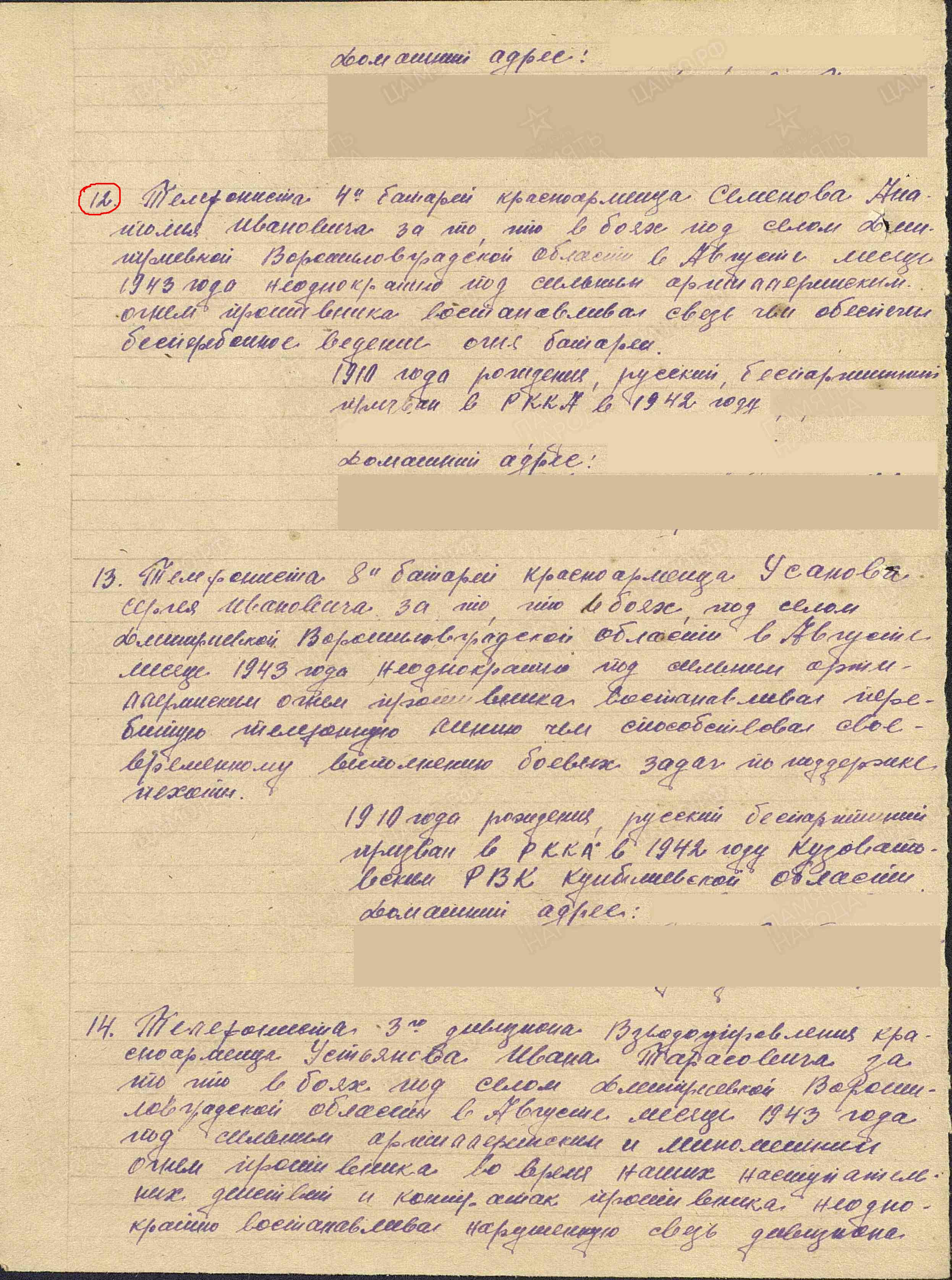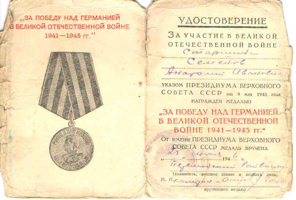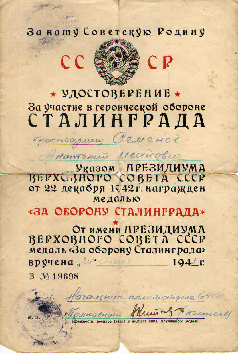 Наградить медалью «За боевые заслуги» телефониста 4-й батареи красноармейца Семенова Анатолия Ивановича за то, что в боях под селом Дмитриевкой Ворошиловградской области в августе 1943 г. неоднократно под сильным артиллерийским огнем противника восстанавливал связь, чем обеспечил бесперебойное ведение огня батареей (наградной лист от 2.09.1943 г.).