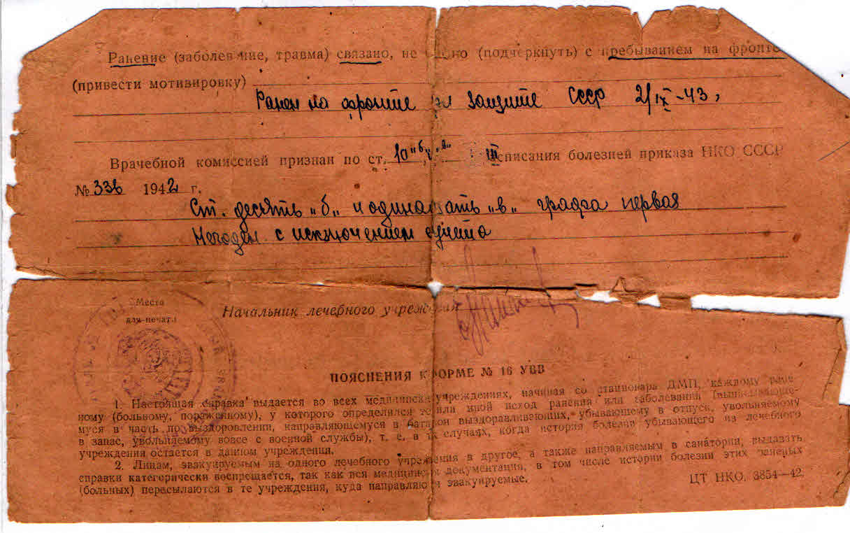 Демобилизован по ранению в 1944 г. До 1946 г. находился на излечении в госпиталях. В 1946 г. вернулся домой, не мог ходить до 1949 г. После излечения работал бухгалтером в с. Перелюб Саратовской области. В 1953 г. семья переехала жить в зерносовхоз им. Ленина Чапаевского района Куйбышевской области.