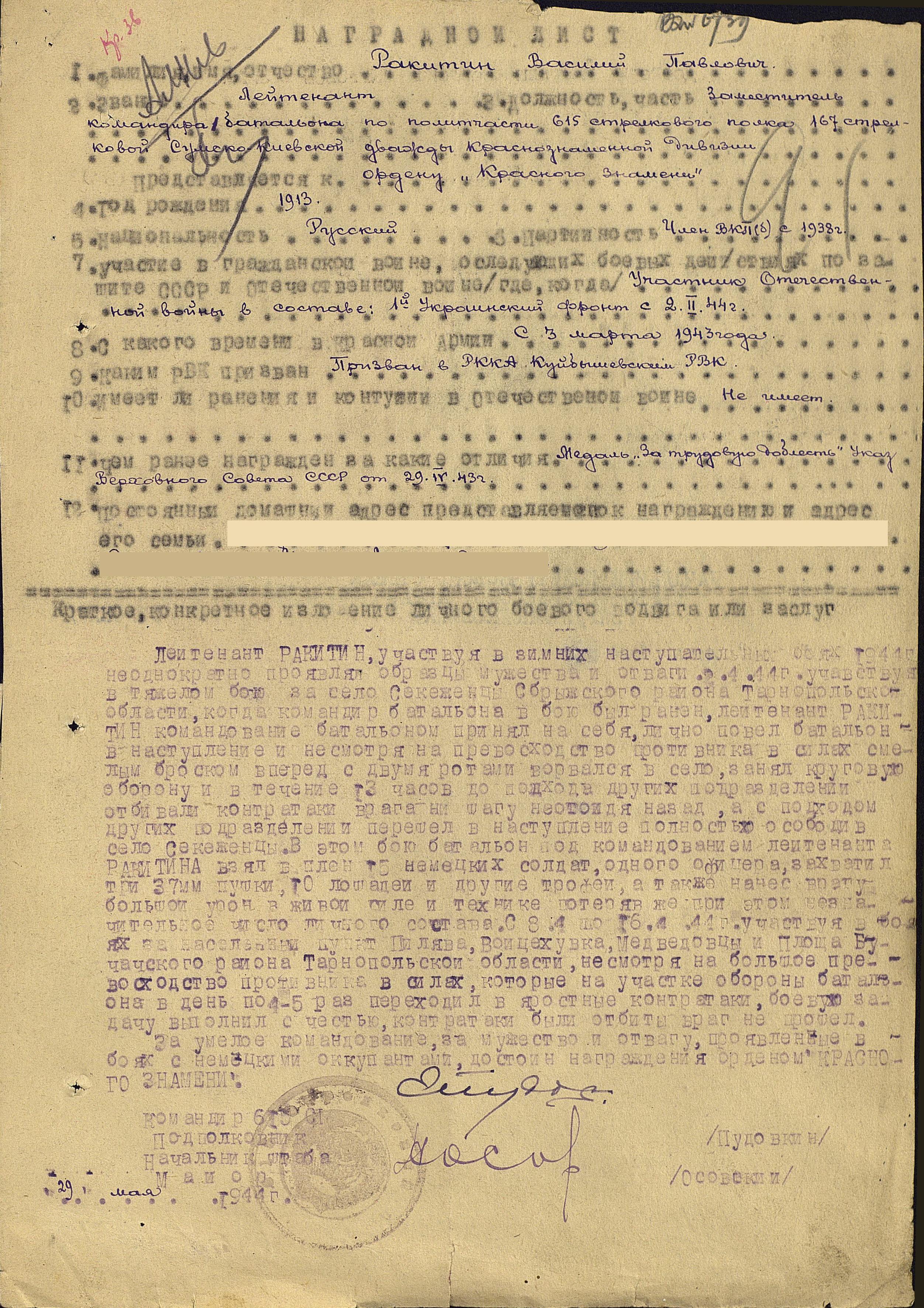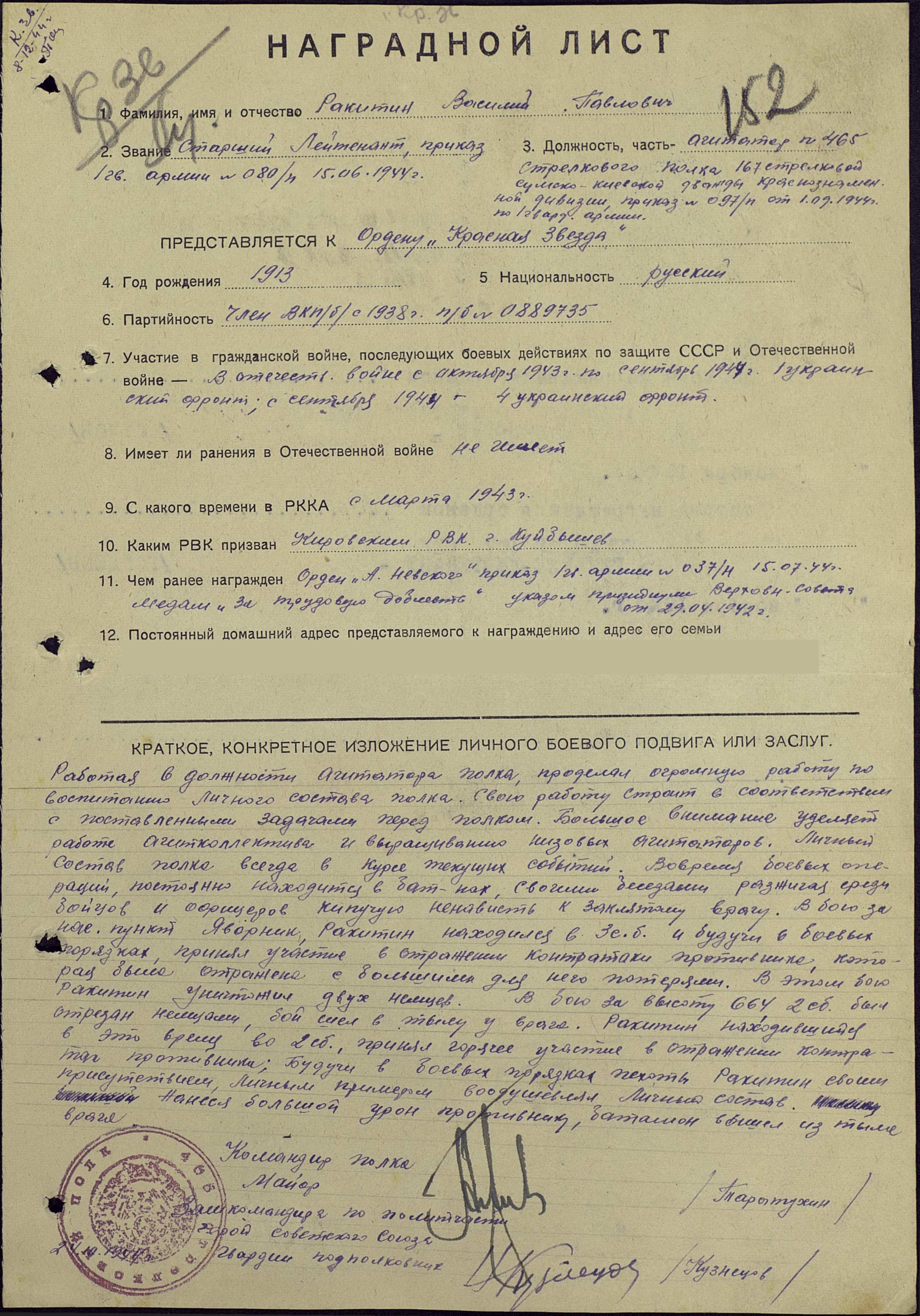 Товарищ Ракитин, работая агитатором полка, в боях за Карпаты умело организовал пропагандистскую работу с большим напряжением сил и воли большевика. Всегда строил свою работу без отрыва от общих задач полка. Особенно хорошо организована работа с бойцами в ночное время после боя в окопах. Листовки “Передай по цепи” были хорошо организованы и мобилизовали личный состав на борьбу с врагом. Личный состав полка в курсе событий, что происходят на фронтах Отечественной войны и международной обстановки. В боях при прорыве обороны 23 ноября 1944 г. в районе с. Собранцы Ужгородского района, тов. Ракитин после артподготовки ворвался в траншеи противника и лично уничтожил 3-х немцев, воодушевляя личным подвигом целое подразделение, задача была выполнена. В боях 17 декабря 1944 г. за населенный пункт Давидово тов. Ракитин вместе с 3-й стрелковой ротой ворвался в траншеи противника на высоте Лысая. В этом бою вместе с группой товарищей тов. Ракитин уничтожил до 15 немцев. В боях 17 декабря 1944 г. тов. Ракитин показал себя достойным сыном Родины. В боях 25 декабря 1944 г. на участке Варгов – Ключеново тов. Ракитин, находясь в боевых порядках пехоты, отражал яростную контратаку немцев под прикрытием танков. Противник был отброшен с большими для него потерями. В этом неравном бою тов. Ракитин проявил исключительную выдержку и стойкость. Атака немцев захлебнулась организованным отпором наших бойцов. За боевые подвиги и хорошо организованную агитационно-пропагандистскую работу тов. Ракитин достоин правительственной награды – ордена Красного Знамени (награжден орденом Отечественной войны II степени; наградной лист от 27.02.1945 г.).