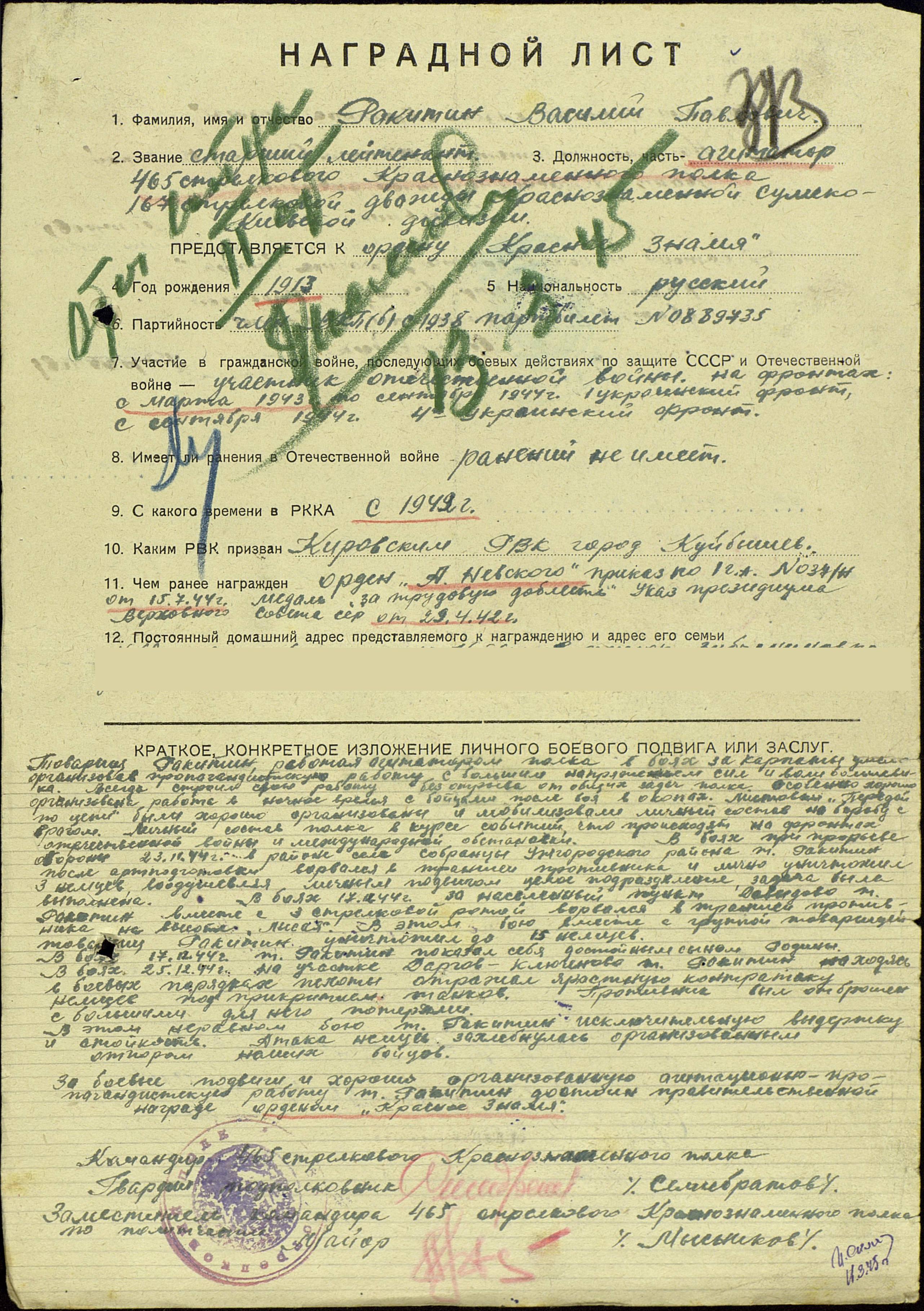 Наградные листы: