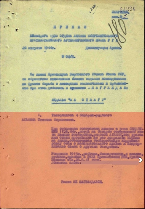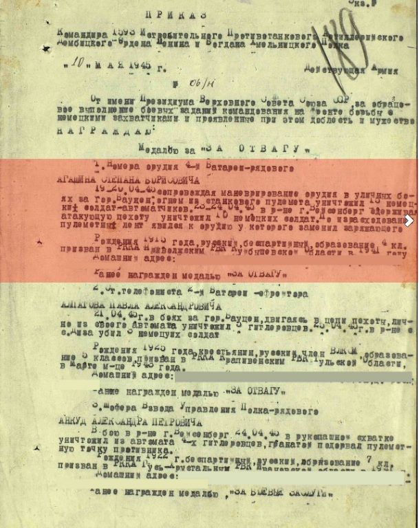 «при отражении контратаки немцев в районе Сендзимув 11.08.1944 г., когда на батарею остервенело лезли пьяные гитлеровцы, рядовой Агашин, под ураганным огнем противника не раз исправлял порывы на линии, обеспечивая бесперебойную корректировку огня с наблюдательного пункта и поддержания связи с другими батареями…» (приказ от 24.08.1944 г.)