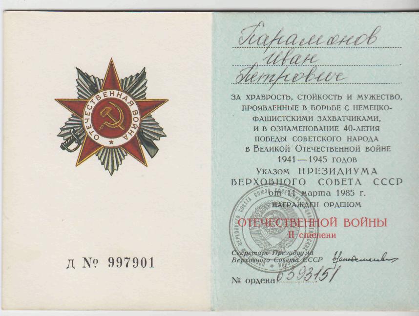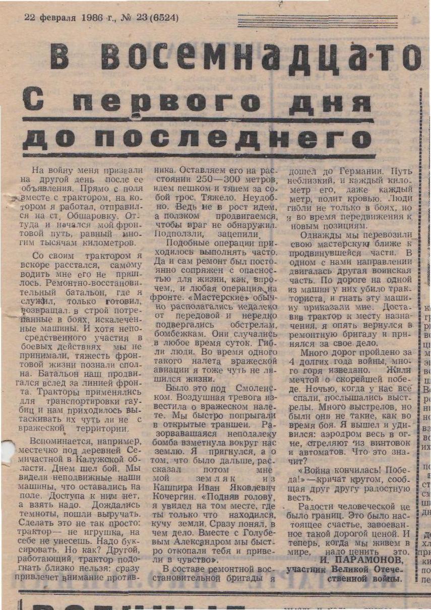 Из воспоминаний Ивана Петровича Парамонова: «На войну меня призвали на другой день после её объявления. Прямо с поля, вместе с трактором, на котором я работал, отправился на станцию в Обшаровку. Оттуда и начался мой фронтовой путь, равный многим тысячам километров. Со своим трактором я вскоре расстался, самому водить мне его не пришлось. Ремонтно-восстановительный батальон, где я служил, только готовил, возвращал в строй потрепанные в боях, искалеченные машины. И хотя непосредственного участия в боевых действиях мы не принимали, тяжесть фронтовой жизни познали сполна. Батальон наш продвигался вслед за линией фронта. Тракторы применялись для транспортировки гаубиц и нам приходилось вытаскивать их чуть ли не с вражеской территории. Вспоминается местечко под деревней Семичастной в Калужской области. Днем шёл бой. Мы видели неподвижные наши машины, что оставались на поле боя. Доступа к ним нет, а взять надо. Дождались темноты, пошли выручать. Сделать это не так просто: трактор не игрушка, на себе не унесёшь. Надо буксировать. Но как? Другой, работающий трактор подогнать близко нельзя: сразу привлечет внимание противника. Оставляем его на расстоянии 250-300 метров, идем пешком и тянем за собой трос. Тяжело. Неудобно. Ведь не в рост идем, а ползком про-двигаемся, чтобы враг не обнаружил. Подползли, зацепили. Подобные операции приходилось выполнять часто… Мастерские обычно располагались недалеко от передо-вой и нередко подвергались обстрелам, бомбежкам. Они случались в любое время суток. Гибли люди. Во время одного такого налета вражеской авиации я чуть не ли-шился жизни. Было это под Смоленском. Воздушная тревога известила о вражеском налете. Мы быстро попрыгали в открытые траншеи. Разорвавшаяся неподалёку бомба взметнула вокруг нас землю. Я пригнулся, а о том, что было дальше, рассказал мне мой земляк из Кашпира, Иван Яковлевич Кочергин: «Подняв голову, я увидел на том месте, где ты только что находился, кучу земли. Сразу понял, в чем дело. Вместе с Голубевым Александром мы быстро откопали тебя и привели в чувство». В составе ремонтной восстановительной бригады я дошел до Германии… Люди гибли не только в боях, но и во время передвижения к новым позициям. Однажды мы перевозили свою мастерскую ближе к продвинувшейся части. В одном с нами направлении двигалась другая воинская часть. По дороге на одной из машин у них убило тракториста и гнать эту машину приказали мне. Доставив трактор к месту назначения, я опять вернулся в ремонтную бригаду и принялся за своё дело. Много дорог пройдено за 4 долгих года войны, много горя изведано. Жили мечтой о скорейшей победе. Ночью, когда у нас все спали, послышались выстрелы. Много выстрелов, но были они не такие как во время боя. Я вышел и удивился: аэродром весь в огне, стреляют из винтовок и автоматов. Что это значит? «Война кончилась! Победа!» – кричат кругом, сообщая друг другу радостную весть. Радости человеческой не было границ. Это было настоящее счастье, завоеванное такой дорогой ценой. И теперь, когда мы живем в мире, надо ценить это».