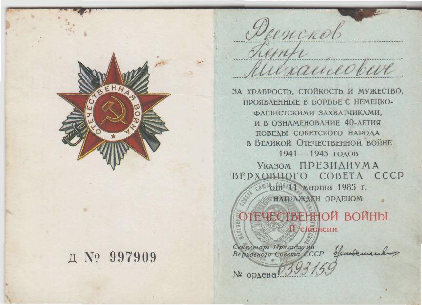 Награды: орден Отечественной войны II степени, медали «За победу над Германией в Великой Отечественной войне 1941-1945 гг.», Жукова, 6 юбилейных медалей, знак «Фронтовик».