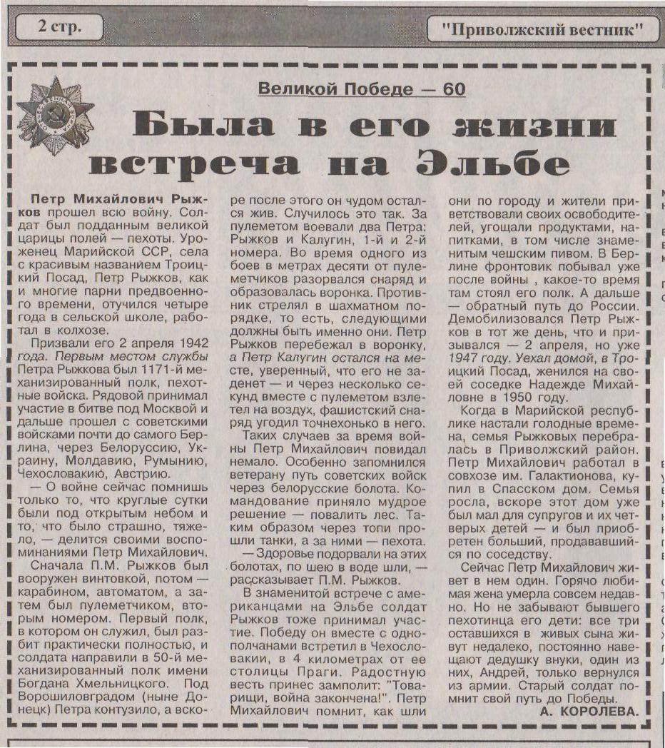 Материал предоставлен снохой, Рыжковой Татьяной Ивановной (с. Спасское), дополнен информацией из районной газеты «Приволжский вестник»