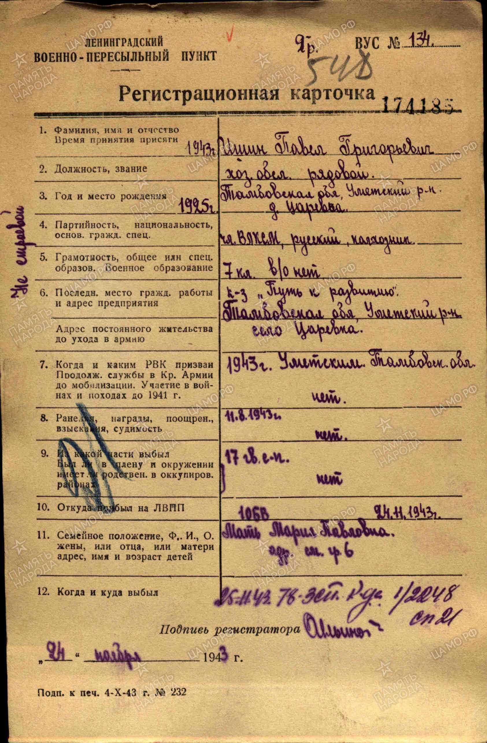 24 ноября 1943 года с санитарным поездом попал в Ленинград, блокада которого к тому времени была почти прорвана. Павел Григорьевич вспоминал: «Бомбежка и обстрел города продолжались, я видел это. И еще запомнил, как мы, выздоравливающие солдаты, ходили в кино, смотрели фильм «Два бойца». Жители Ленинграда, даже пожилые, уступали нам дорогу, нам – молодым парням!» После лечения 1 февраля 1944 года Павел Григорьевич зачислен в 63 гвардейскую стрелковую дивизию 30 гвардейского стрелкового корпуса. Участвовал в боях на Нарвском плацдарме. Ранение давало о себе знать, и вскоре отправили бойца учиться на санинструктора, а в апреле 1944 года он направлен связным в штаб 3 Прибалтийского фронта, где служил до октября 1944 года (тогда фронт был расформирован). Павел Григорьевич переведен в штаб 2 ударной Армии 2 Белорусского фронта связистом.