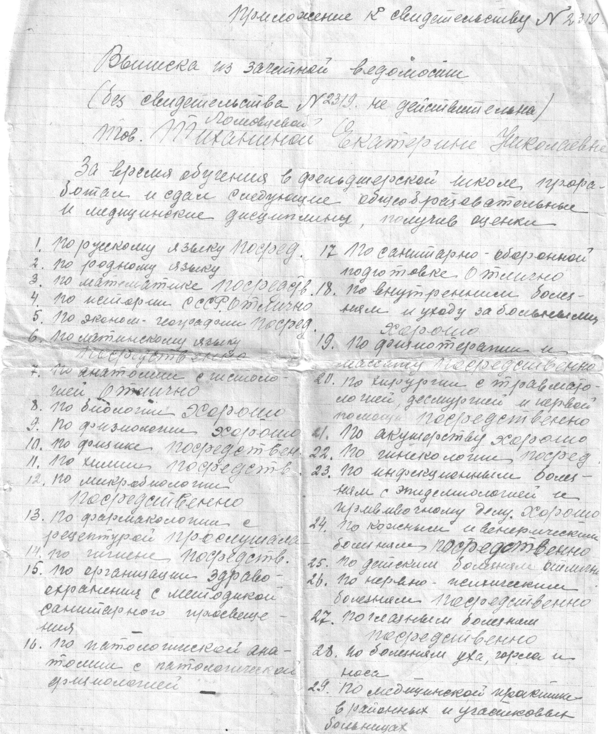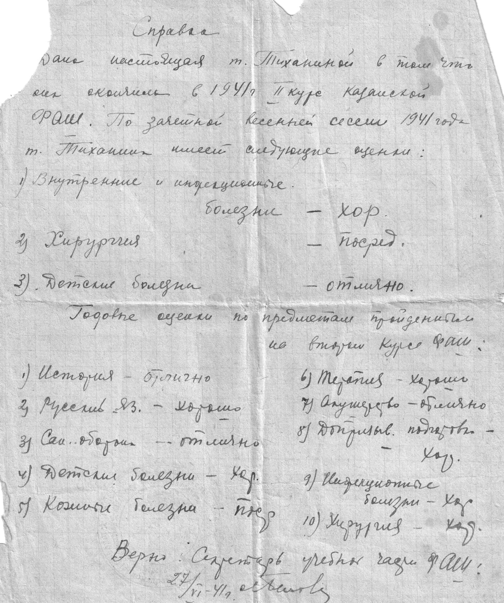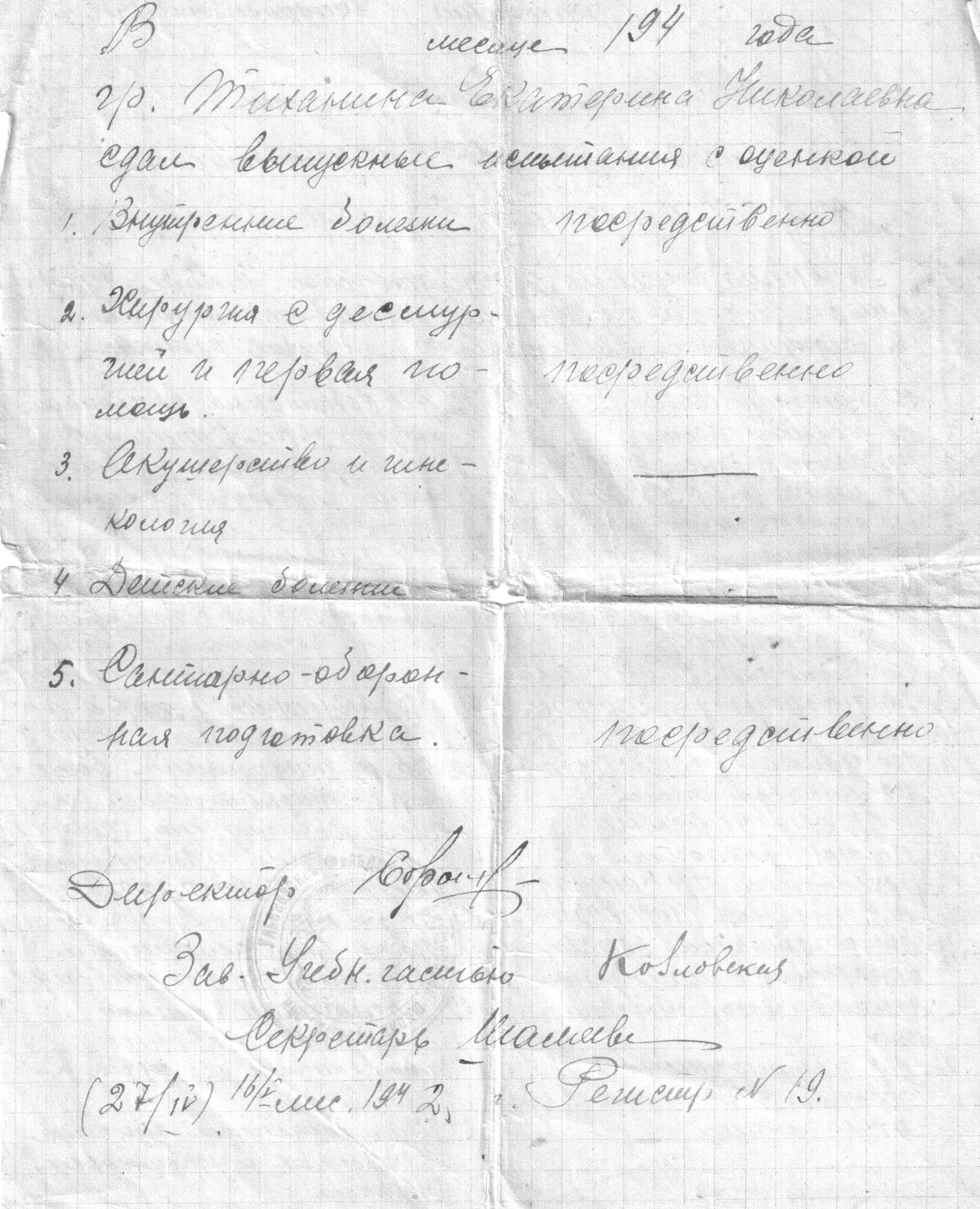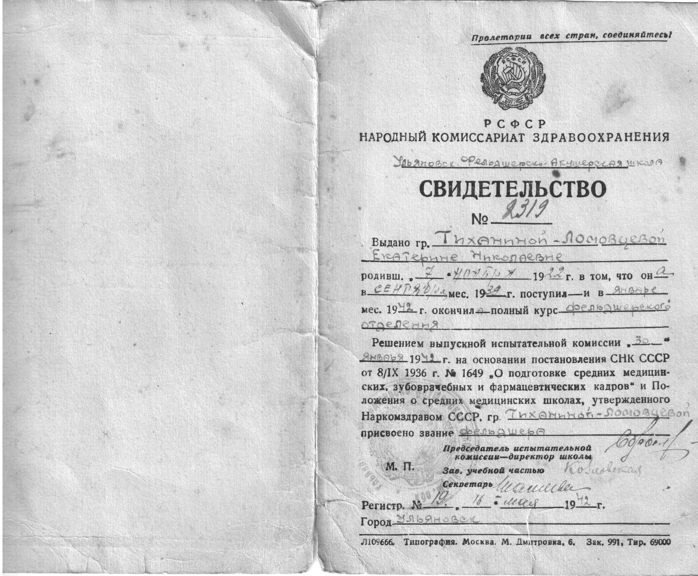Екатерина Ломовцева (Тиханина) с сентября 1939 г. по январь 1942 г. обучалась на фельдшерском отделении Ульяновской фельдшерско-акушерской школы. Работала медсестрой в эвакогоспитале №5778.