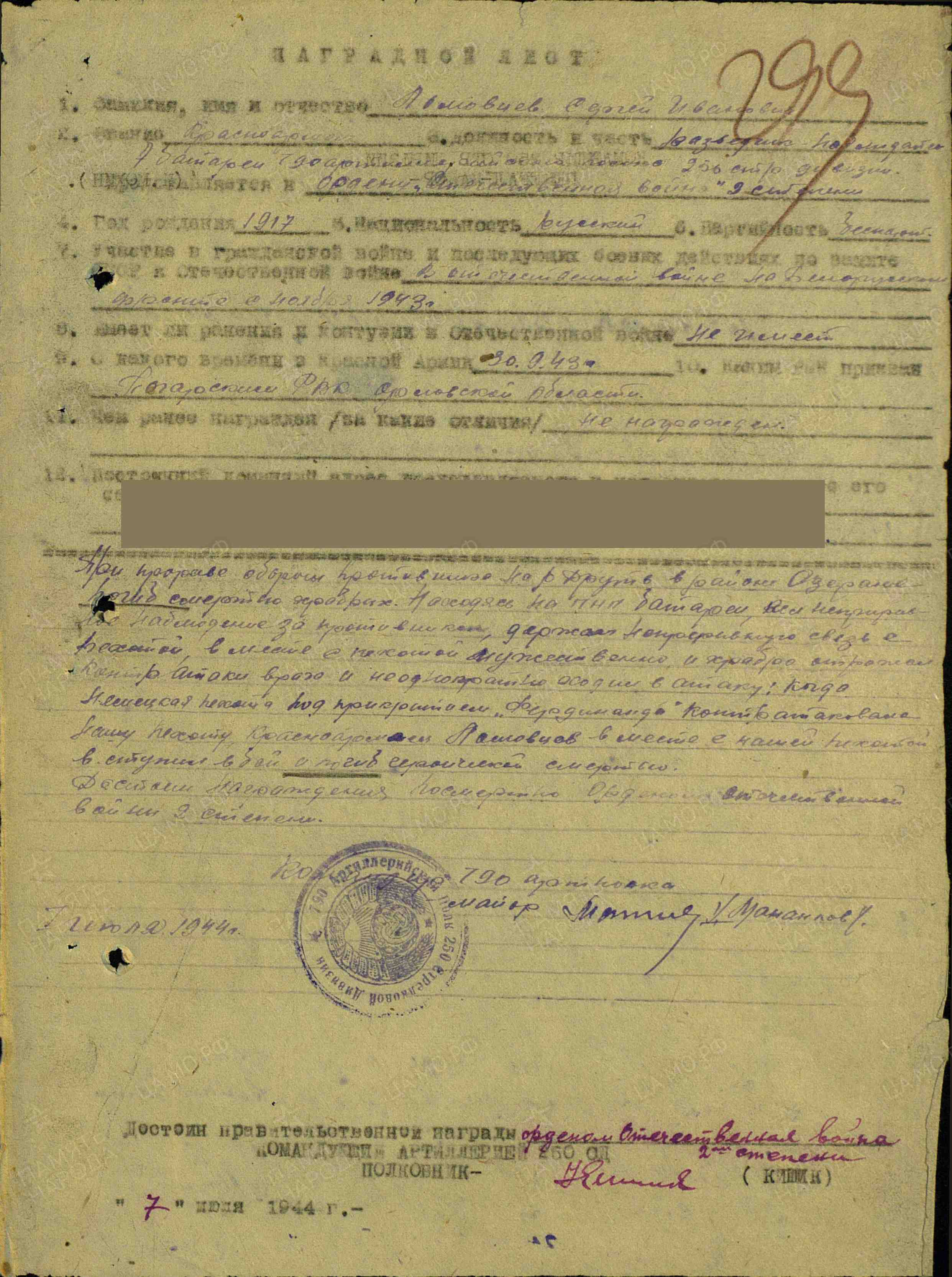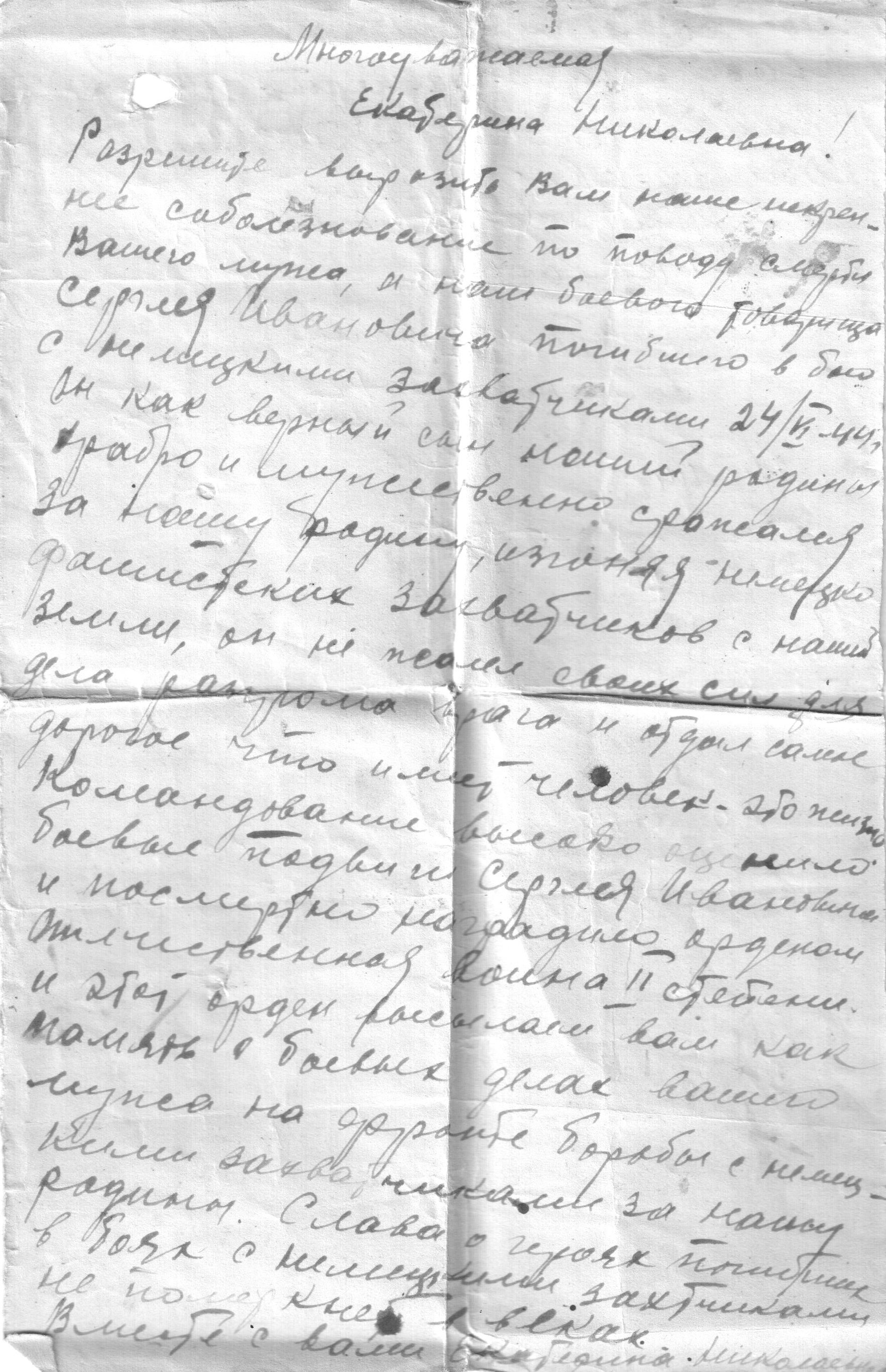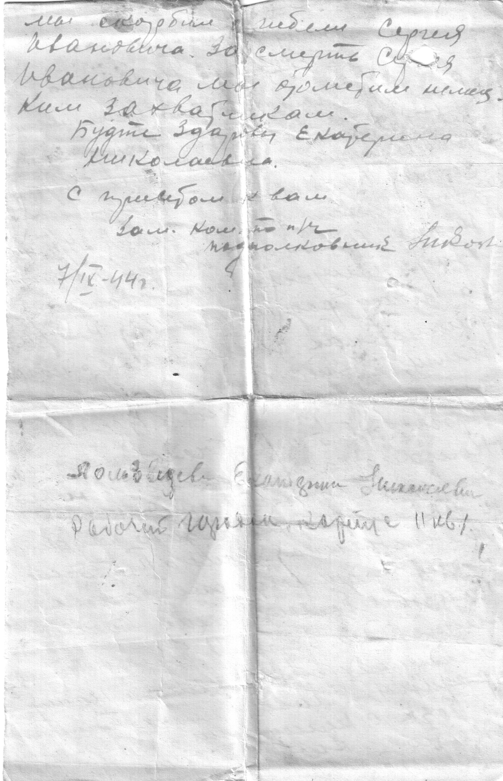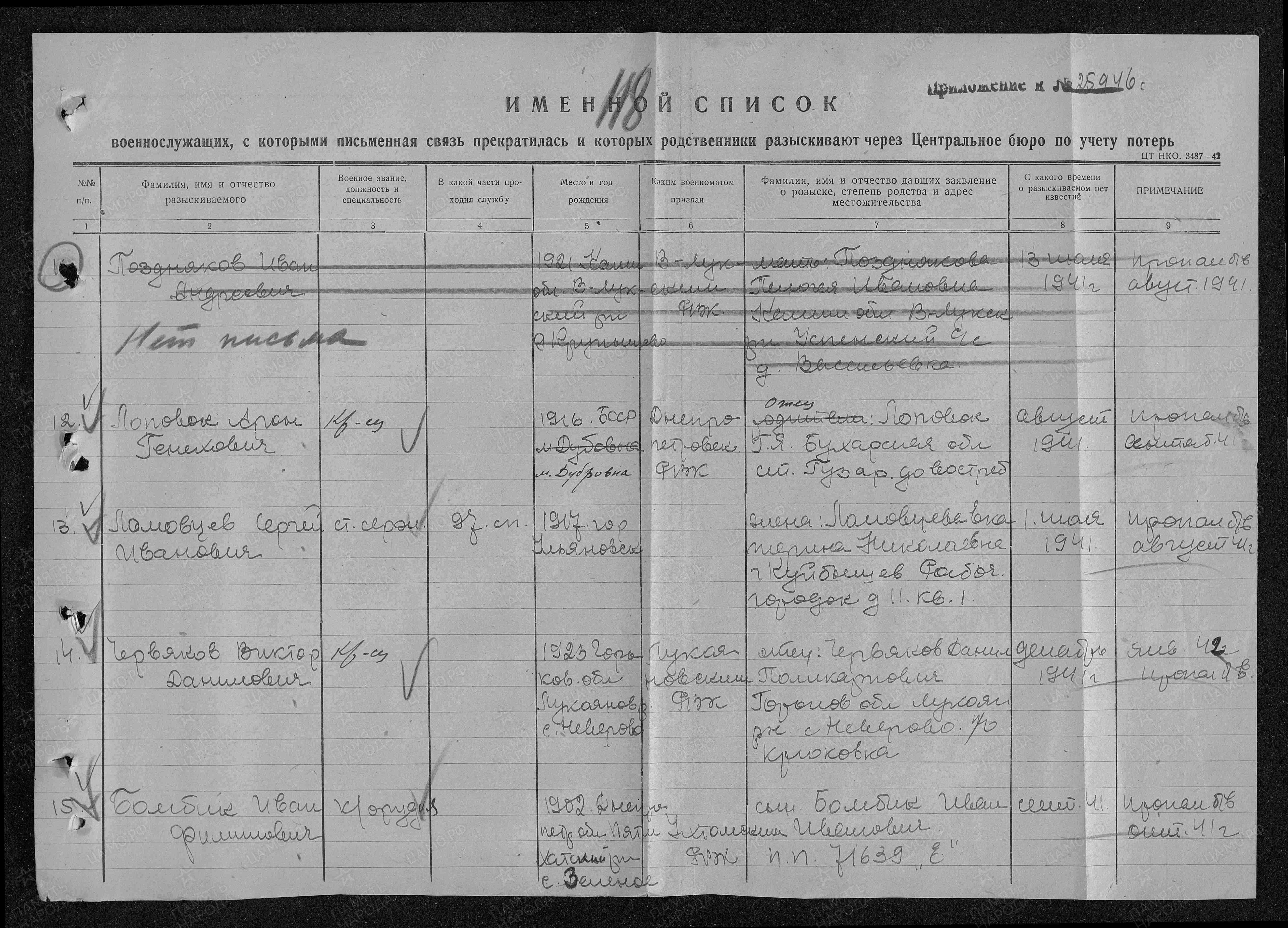 В архиве Минобороны хранится Именной список военнослужащих, числящихся пропавшими без вести, согласно которому в августе 1941 г. Сергей Иванович Ломовцев пропал без вести, но он остался жив и продолжил воевать. В сентябре 1944 года его жена Екатерина Николаевна получила письмо от командира части, в которой служил ее муж, что Сергей Иванович Ломовцев погиб в бою 24 июня 1944 г. Место захоронения Гомельская обл., Рогачевский р-н, д. Б.-Крушиновка. Сергей Иванович Ломовцев посмертно награжден орденом Отечественной войны II степени.