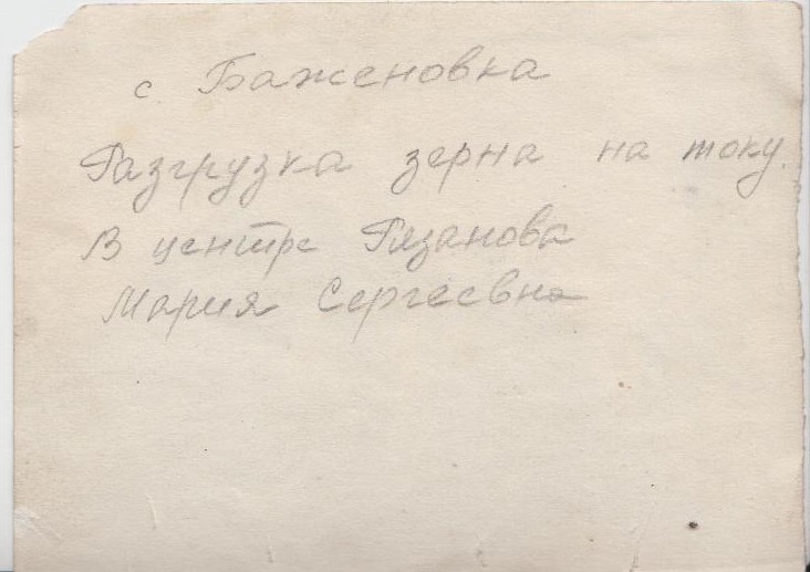 Его дочь Мария Сергеевна Рязанова, колхозница колхоза «Маяк» после войны была награждена медалью «За доблестный труд в Великой Отечественной войне 1941-1945 гг.». На фотографии того времени запечатлена разгрузка зерна на току в с. Баженовка.