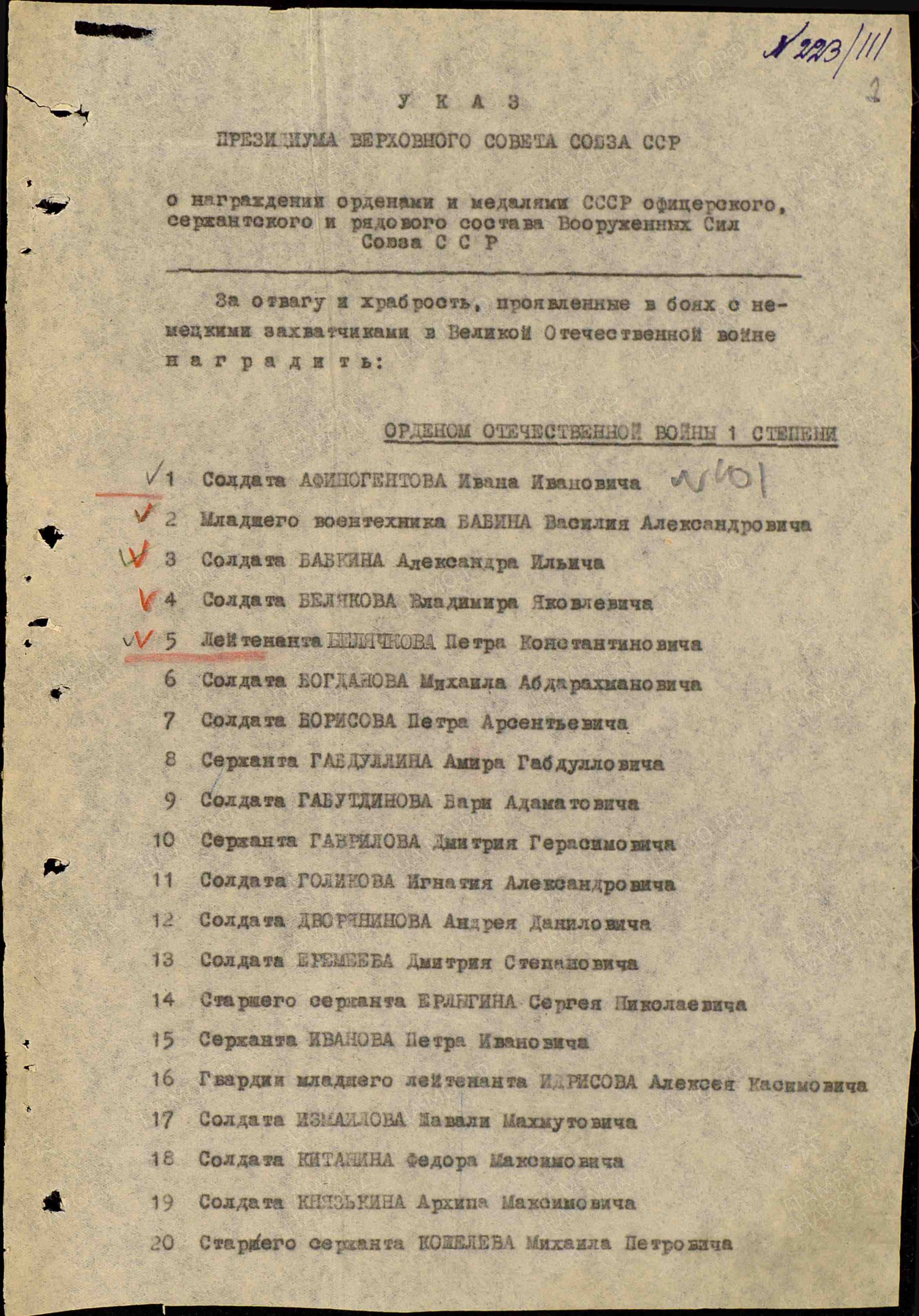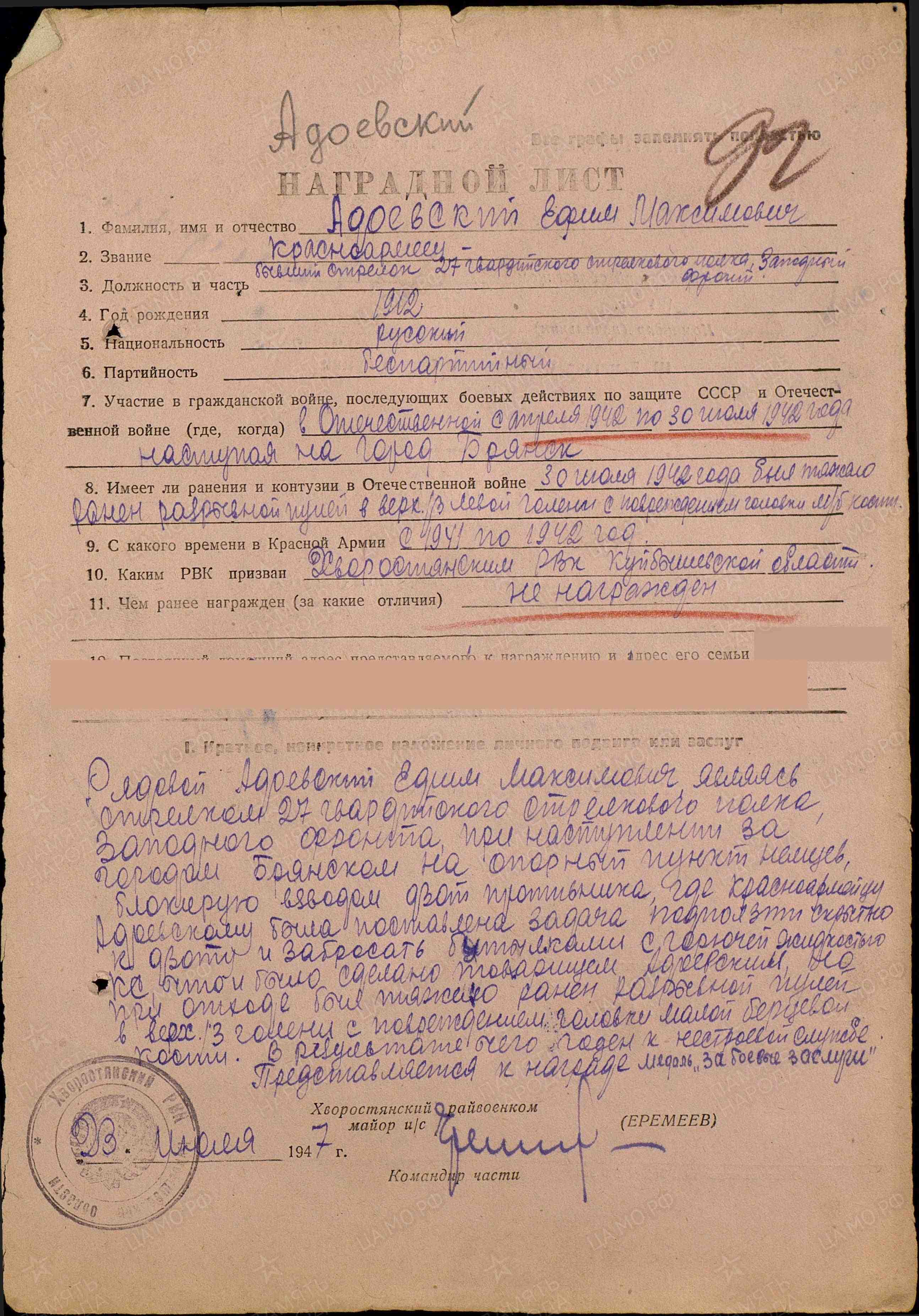 Информация из Наградного листа от 27 июля 1947 г. о награждении медалью «За боевые заслуги»: «Рядовой Адоевский Ефим Максимович, являясь стрелком 27 Гвардейского стрелкового полка Западного фронта, при наступлении за городом Брянском на опорный пункт немцев, блокируя взводом дзот противника, где красноармейцу Адоевскому была поставлена задача подползти скрытно к дзоту и забросать бутылками с горючей жидкостью КС, что и было сделано товарищем Адоевским, но при отходе был тяжело ранен разрывной пулей…».
